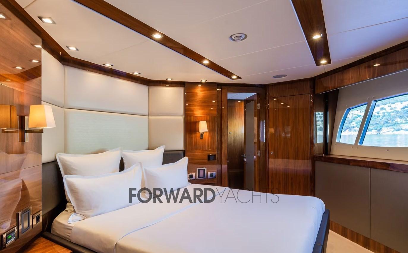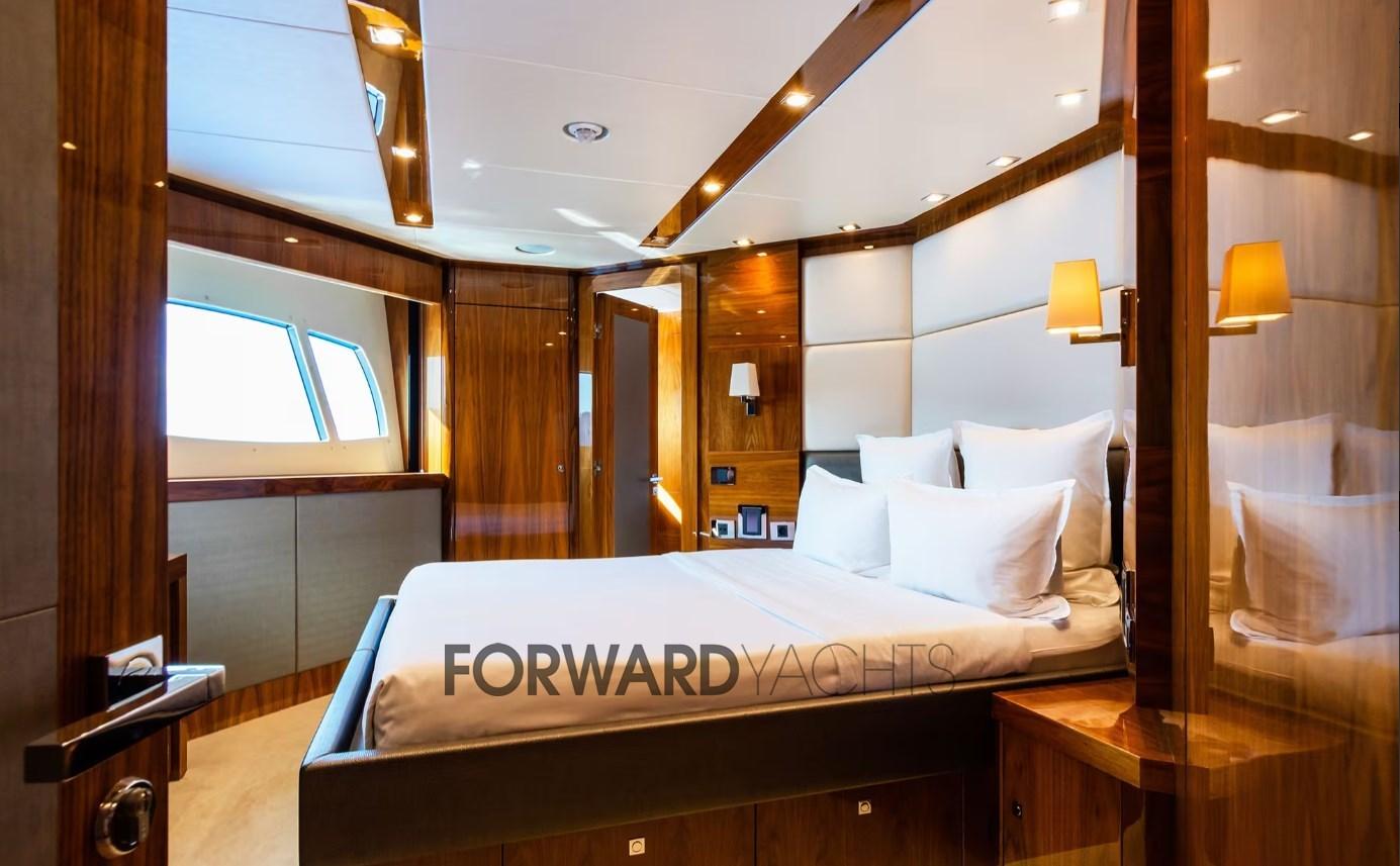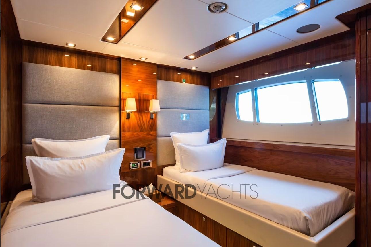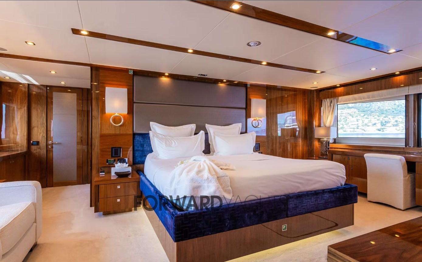 Avec ses 35 mètres, il peut accueillir jusqu’à 10 personnes dans 5 cabines spacieuses et confortables : une cabine principale sur le pont principal à l’avant avec dressing et salle de bain attenante ; en passant sous le pont 2 cabines doubles et 2 cabines invités avec lits simples au sol ; chacune avec salle de bain privée et armoires. À l’extrême proue, il y a la zone équipage avec 3 cabines pour 6 personnes.