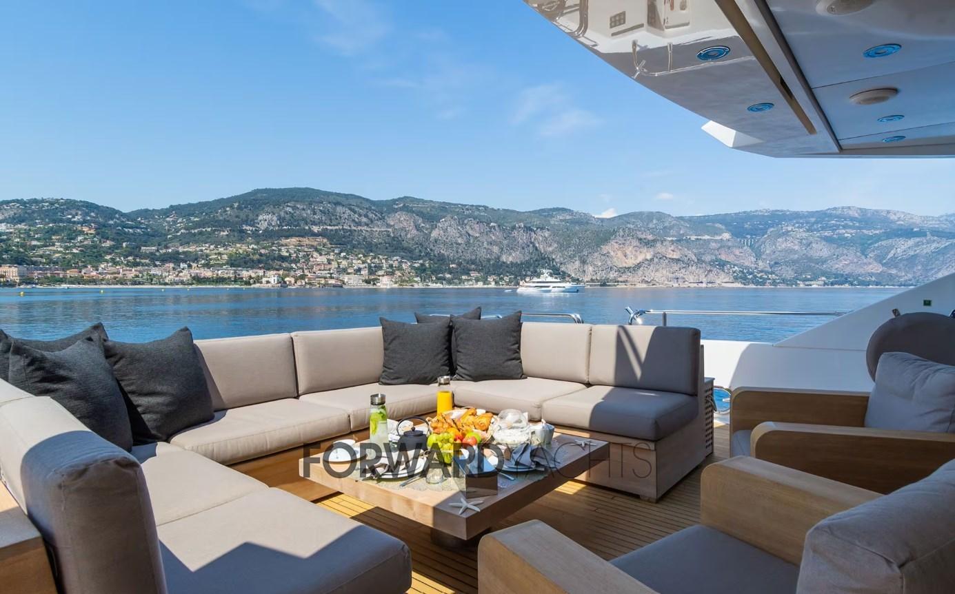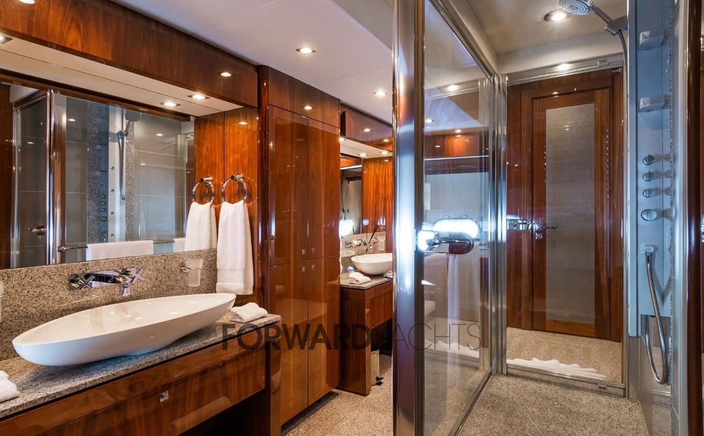 Le bateau est équipé de 2 moteurs MTU de 2 600 CV et de nombreux accessoires, notamment : stabilisateurs d’ailerons, 2 x générateur Kohler, jacuzzi sur le fly bridge, garage d’annexe, plate-forme hydraulique de montée et de descente et une large gamme de jouets nautiques.