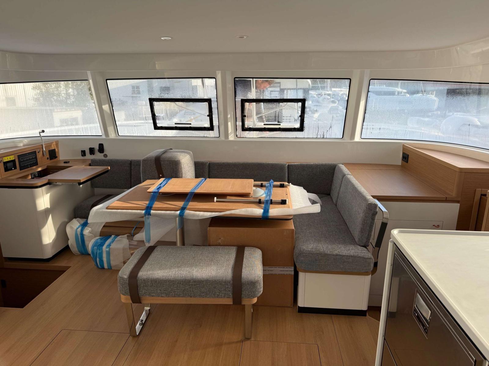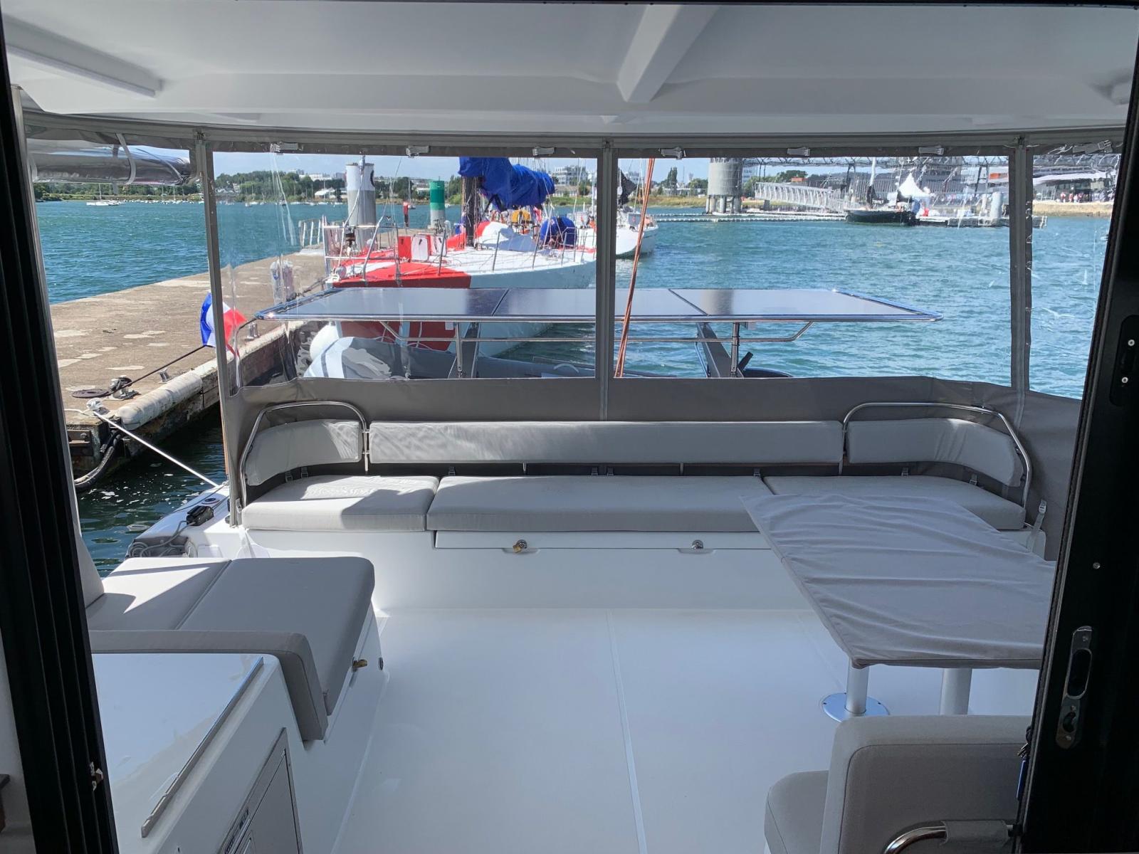 Options: Pack Sail Away, Selleries extérieures grises, 2ème siège de barre babord, Table de cockpit bois exotique avec rallonge de table, Flat winder de grand voile, Accastillage de Code 0 avec long bout-dehors gris et emmagasineur, Code 5 Stormlite (130m²) + Bande UV, Lazy-bag, Escalier d'accès au roof, Panneaux solaires sur bossoirs (3*300W), 4 batteries lithium 200 Ah, Bossoirs d'annexe, Support de moteur HB, Dessalinisateur 100L/H, Commande à distance guindeau électrique, Convertisseur 12-220V 3Kva, réservoir eau douce supplémentaire 300L, Pompe de lavage de pont eau douce et eau de mer, Plans de travail Kerroch dans cuisine et salle de bain, Sommiers à lattes, WC électriques eau de mer, Pré-dispo micro-onde et Lave-linge, Réfrigerateur - Conservateur optionnel dans le carré 155L, Ecran Garmin 12 pouces à babord et tribord, Télécommande de pilote Garmin, Radar GARMIN et AIS 800, 2 taquets sur étraves, paintcoat dans pointes avant, balcon avant et fillière assises composite, toiles de tour.