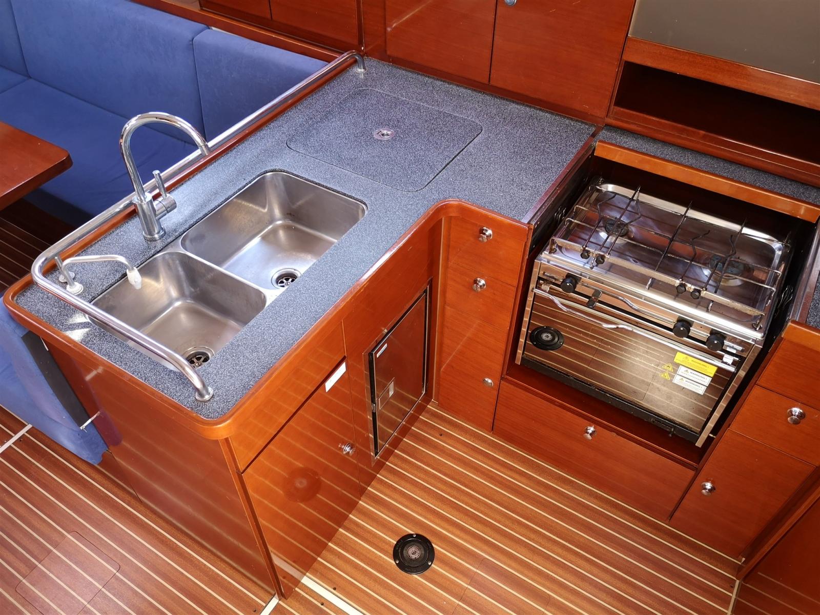 Cuisine en L avec évier double avec pompe à eau de mer, plaque de cuisson à gaz à deux feux, four et réfrigérateur