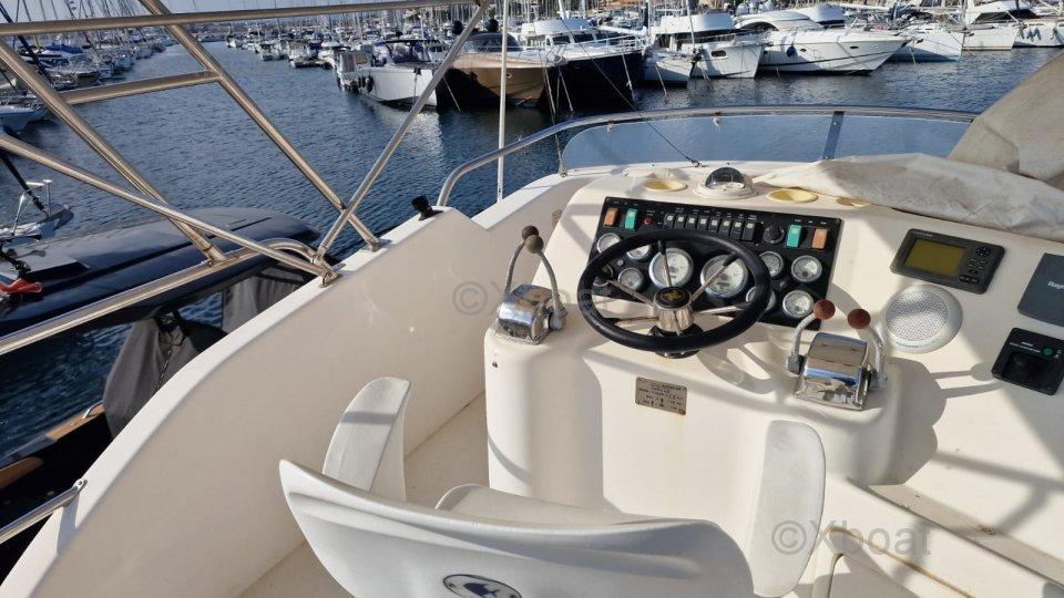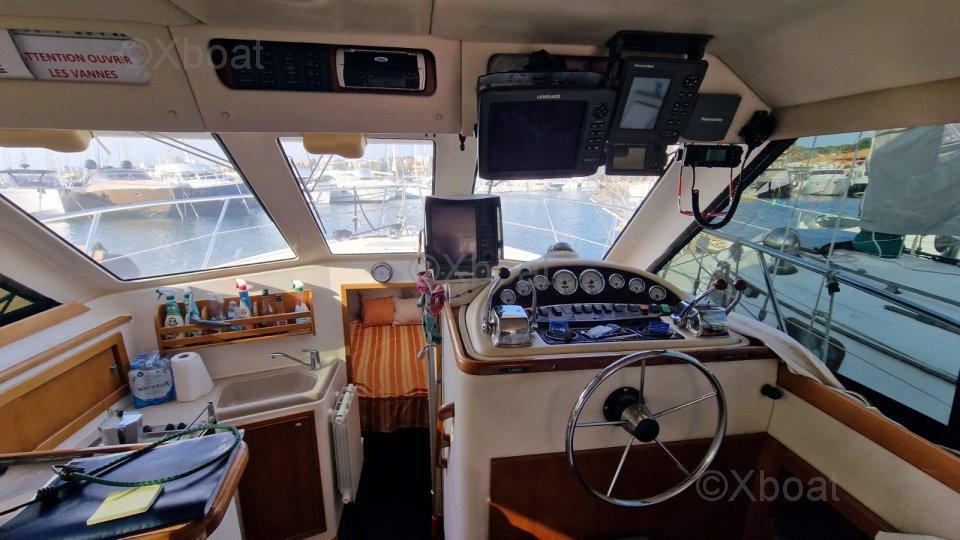 Ce yacht à moteur dispose d'une grande cabine double principalement utilisée pour le stockage de cannes à pêche. Il est également équipé d'une salle de bain avec douche et WC, d'un grand carré très lumineux avec une cuisine équipée, et d'une timonerie. Le flybridge est doté de toutes les commandes en double.