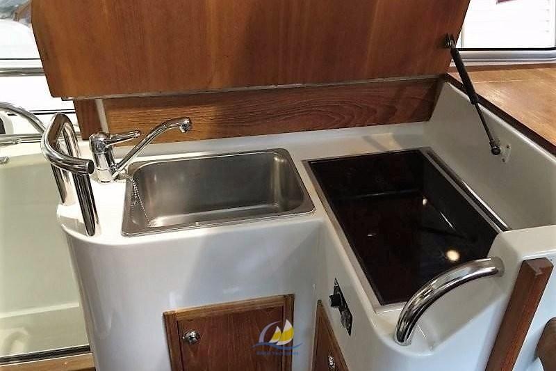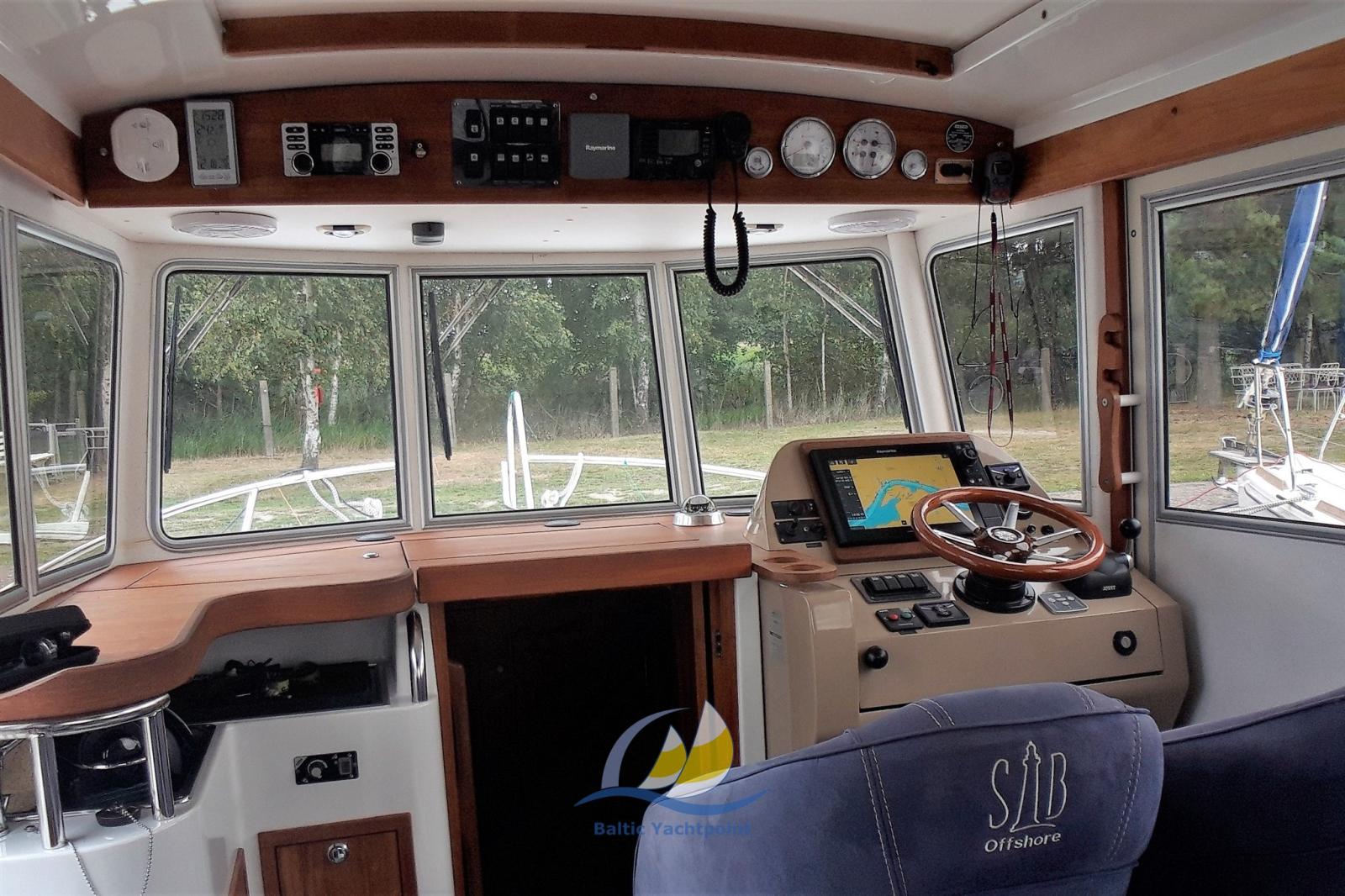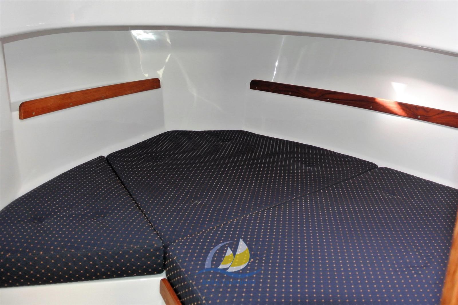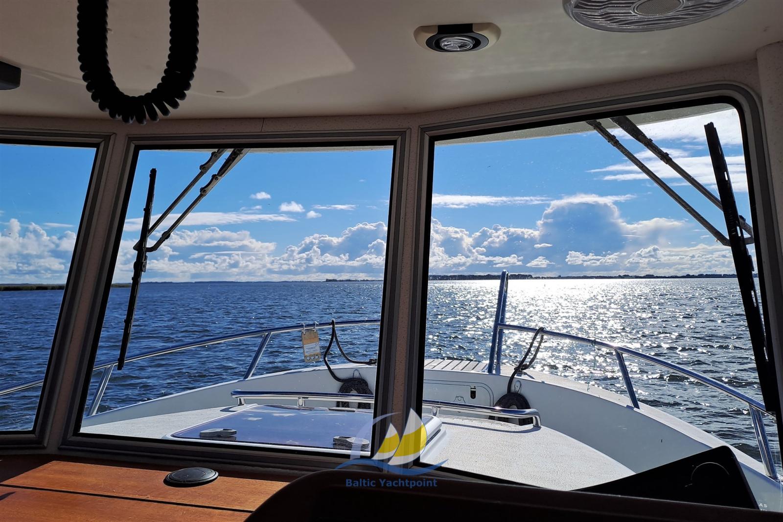 Le rouf abrité offre une visibilité panoramique de première classe et permet une croisière agréable par tous les temps. Le salon peut accueillir jusqu’à six personnes, une table réglable et deux fauteuils confortables assurent une utilisation flexible. L’équipement comprend une télévision, une radio, une technologie audio de haute qualité et une cuisine bien équipée avec des équipements de cuisine et un évier. Des toilettes avec des installations de lavage augmentent le confort.