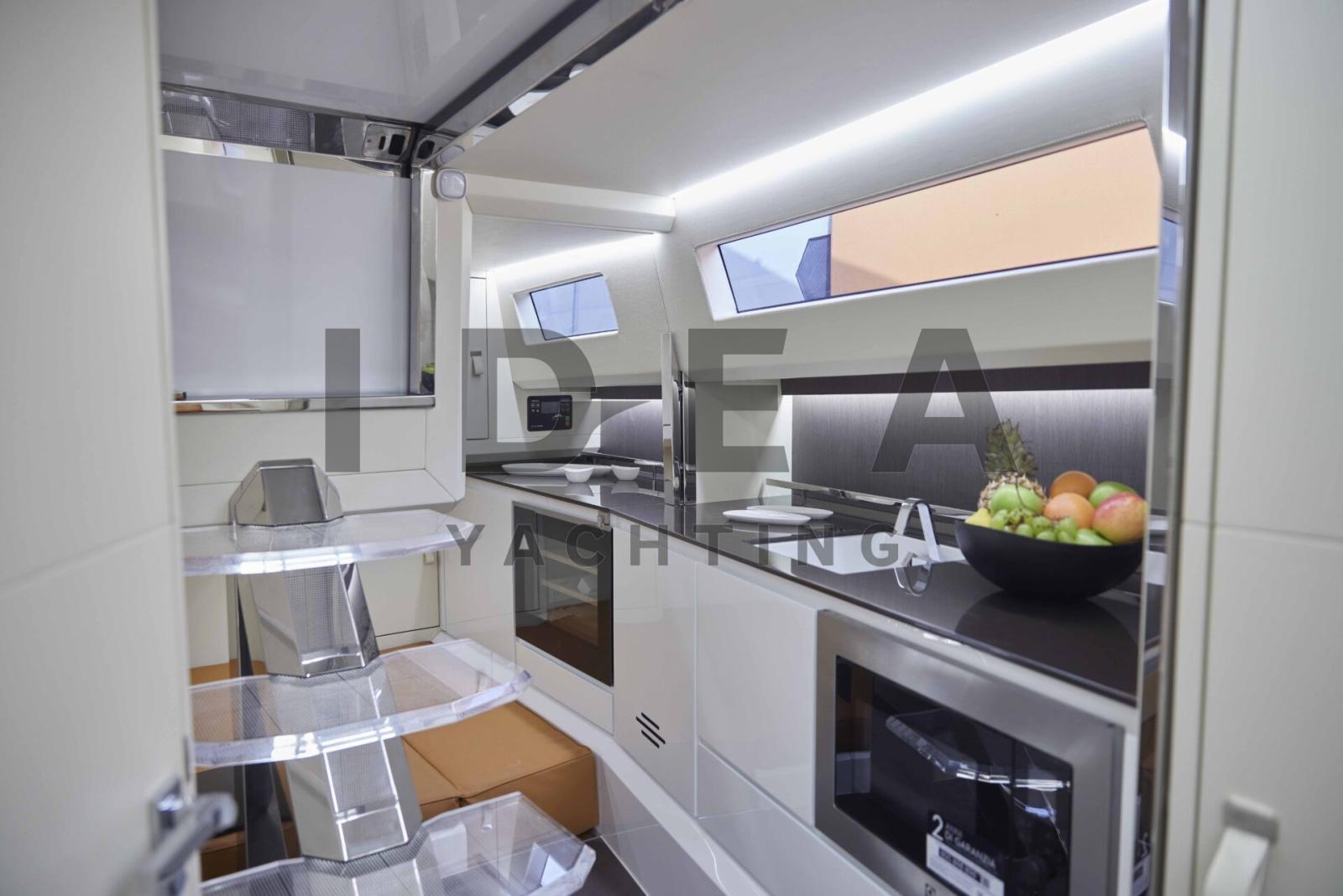 Cuisine, 3 Réfrigérateur extérieur (1 drawer refrigerator under the seat, 2 drawer refrigerator under the sundeck), Réfrigérateur intérieur (42 lt), Machine à glaçons, Plaque vitrocéramique (Induction), Winecooler (12 bottles).