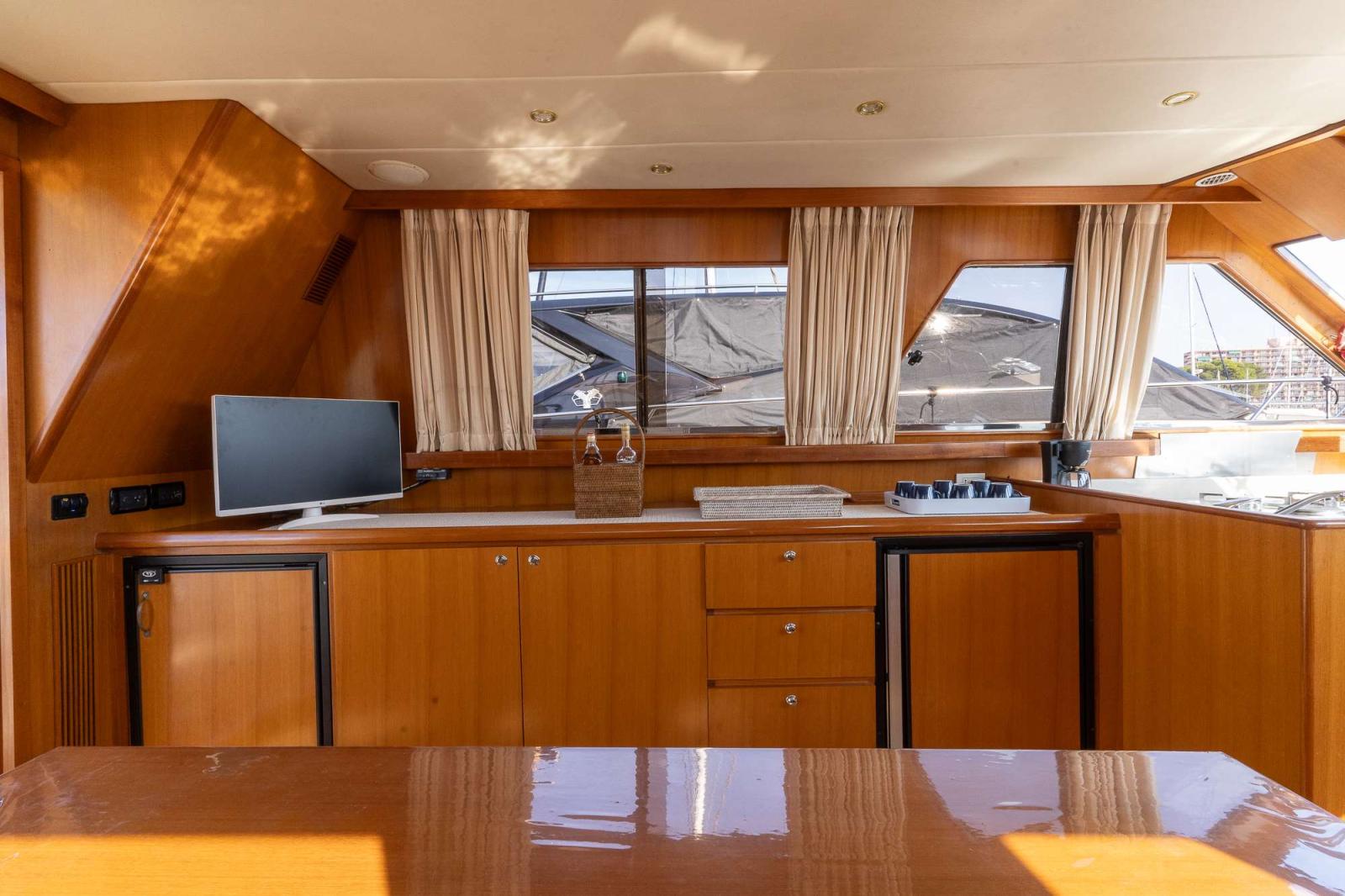 Le bateau est très bien équipé, passerelle hydraulique, propulseur side power 8kW, climatisation réversible CLIMMA 2 groupes/ 5 fancoils, générateur Onan 11 kW 200 heures, convertisseur mastervolt 2000W, panneaux solaires de 2024, WC tecma, congélateur, antenne SAT SEAWATC 2050 etc...