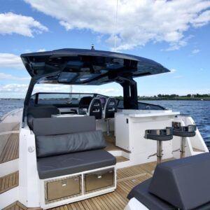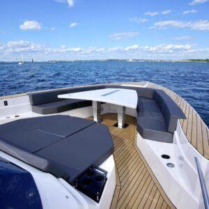 Le yacht est également équipé d'un système audio haut de gamme, d'un écran Raymarine de 16 pouces et d'une cuisine extérieure entièrement équipée avec un barbecue. Vous et vos invités pourrez déguster de délicieux repas tout en profitant d'une vue imprenable. De plus, les coussins latéraux hydrauliques prolongent le pont, offrant un espace supplémentaire pour la détente.