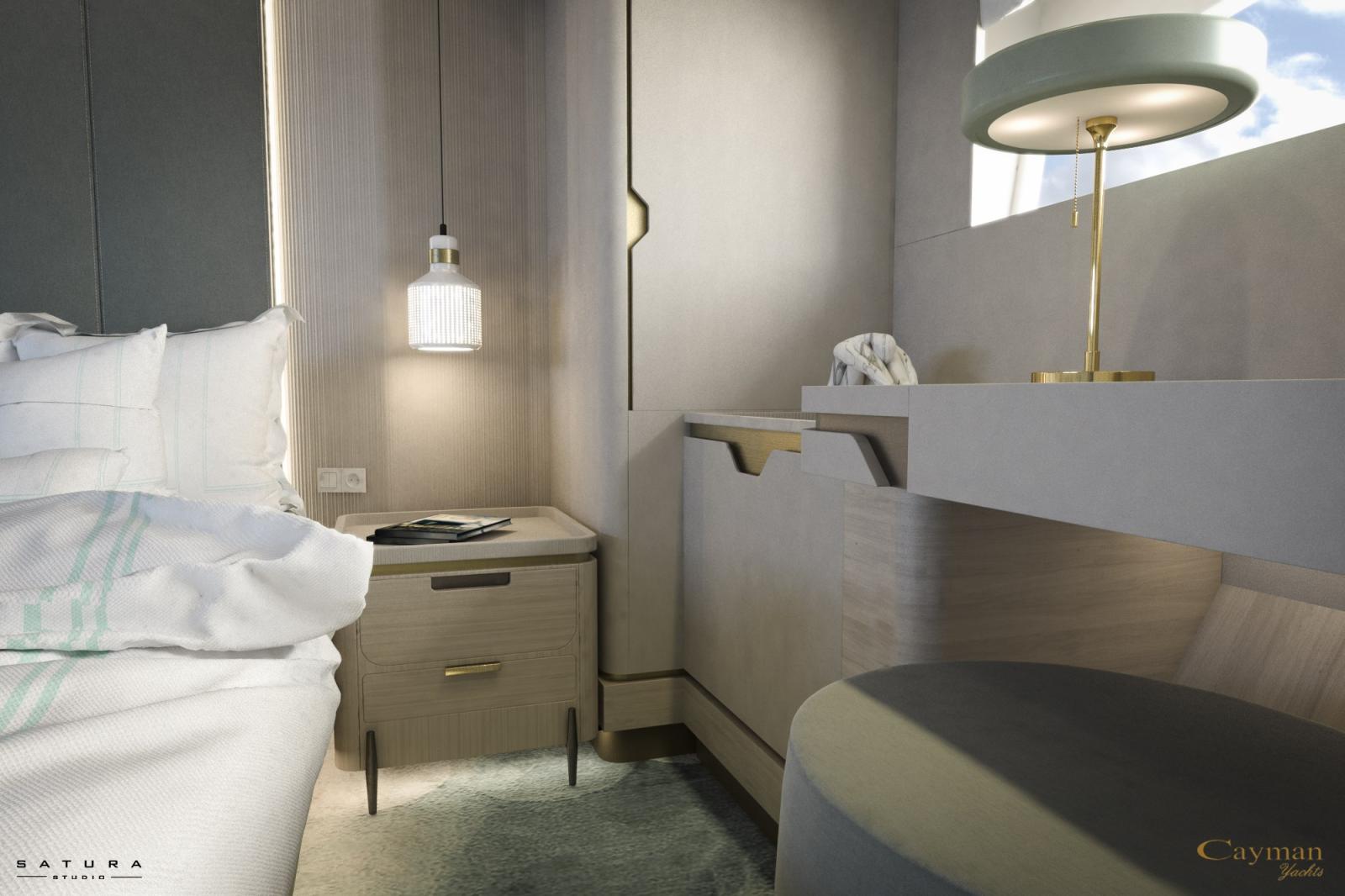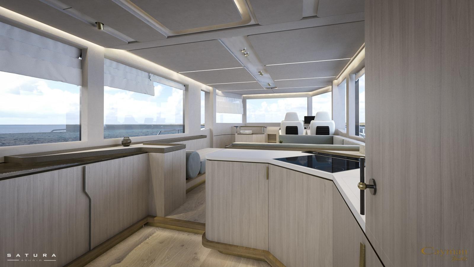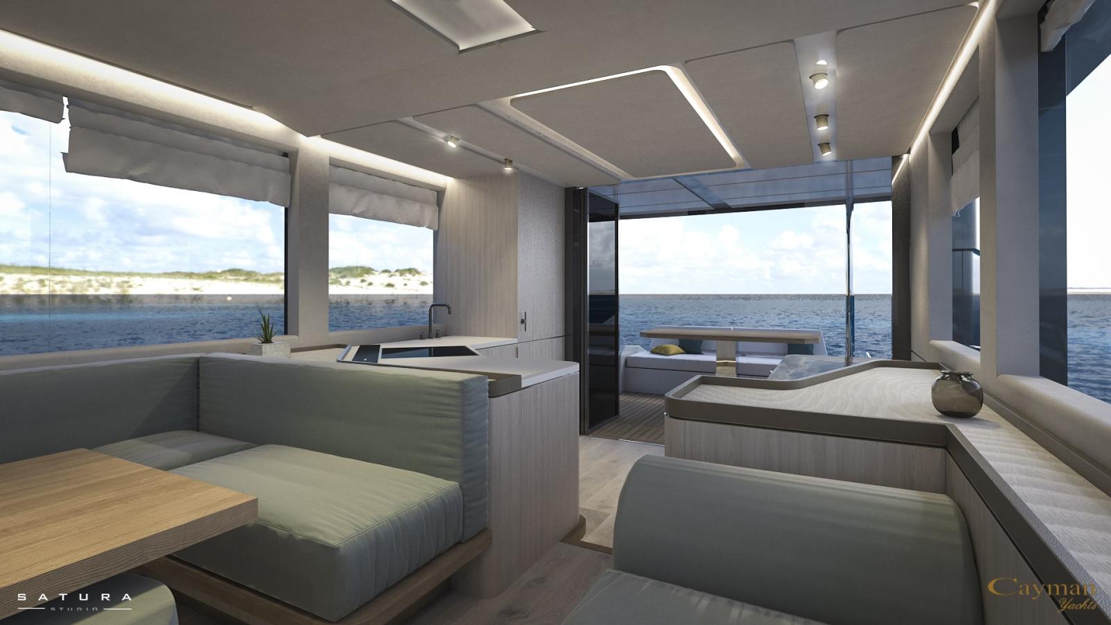 Alarme moteur, Alarme de pompe de cale, Eau sous pression, Passavant en teck, Douche de cockpit, Flaps électriques, Extincteur(s) fixe(s), Éclairage de courtoisie, Spots sous-marins, Pompe de cale automatique, Pompe de cale manuelle, Porte latérale, Prise de quai, Guindeau électrique, table de cockpit, Winch électrique arrière, Winch électrique avant.