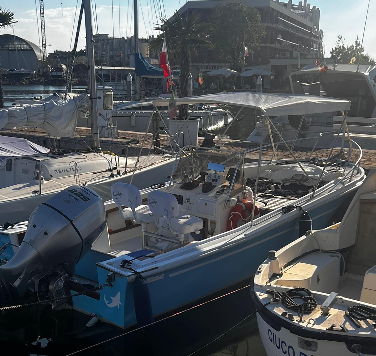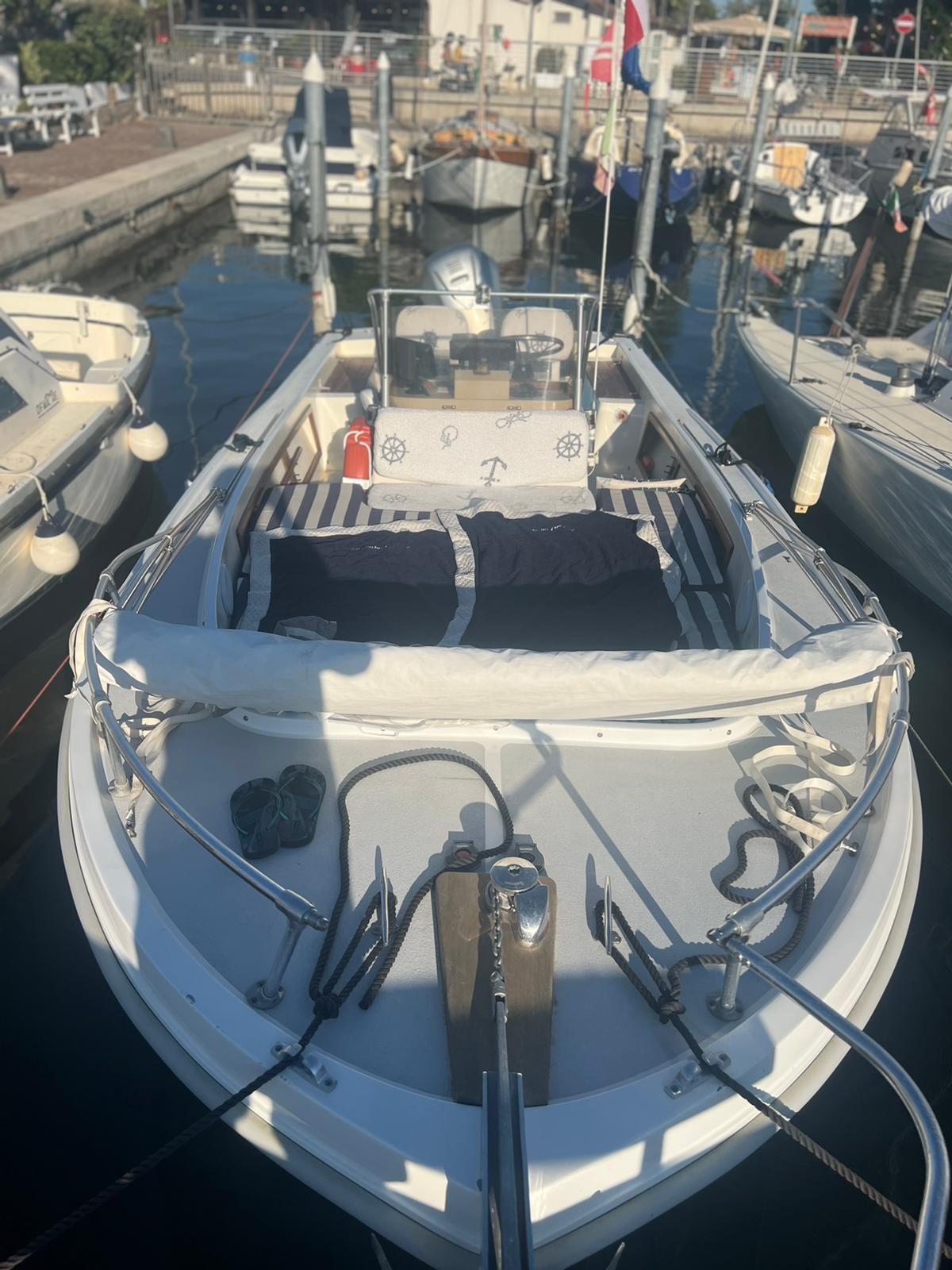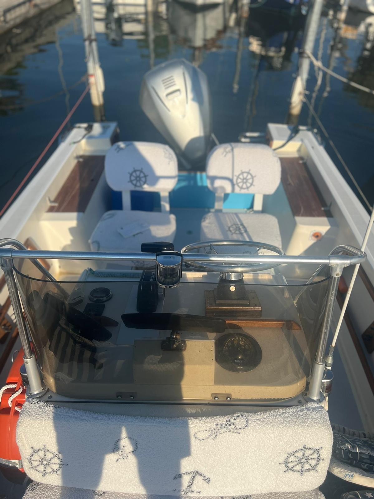 Coque remise à zéro et traitement anti-osmose, apprêt et antisalissure - antidérapant dans le piétinement - repeindre des pièces en bois - jointoiement et repeinture Falchetta - Remplacement Bottazzo - Nouvelle sellerie - Auvent neuf - Enveloppement à la coque