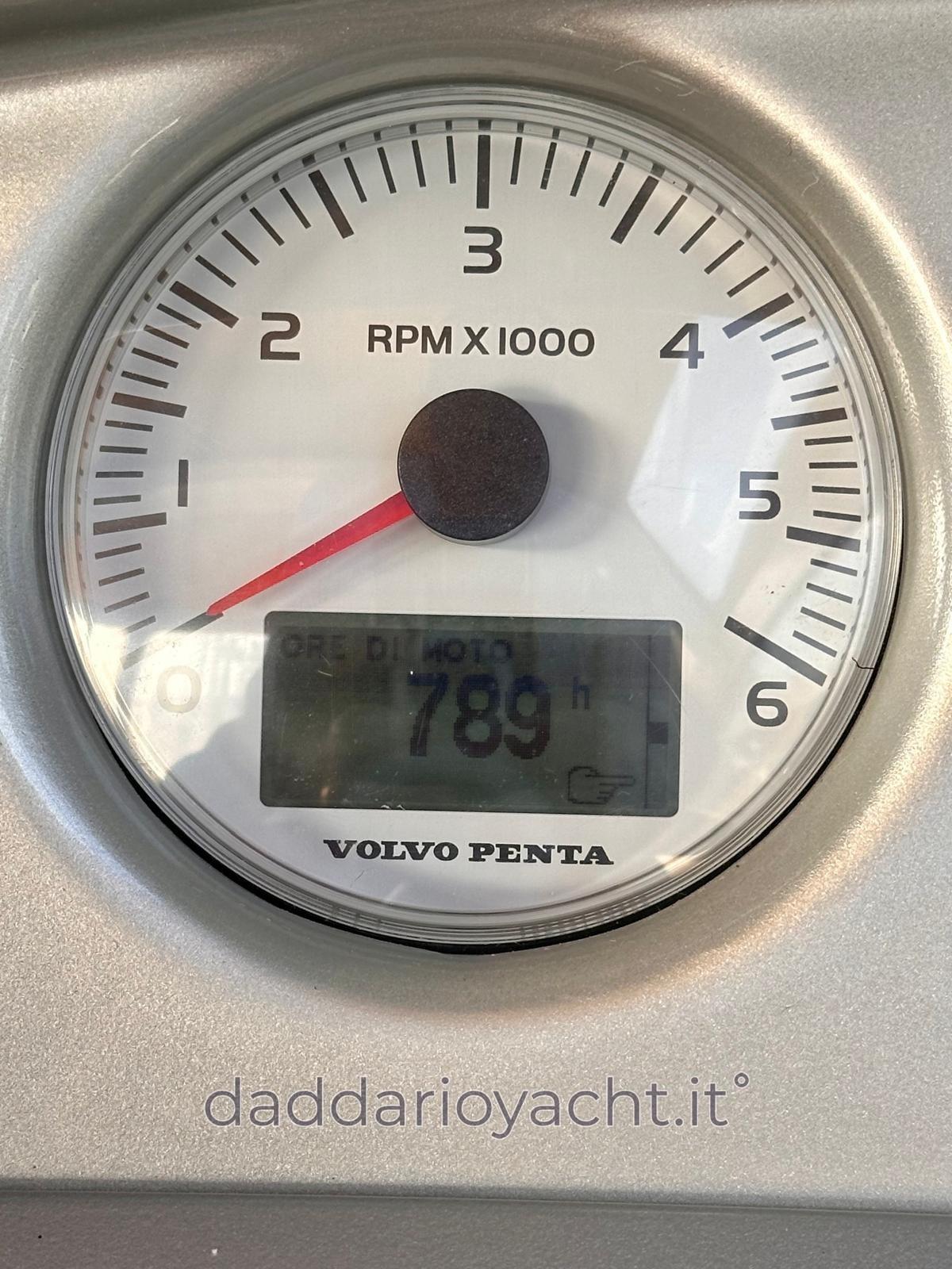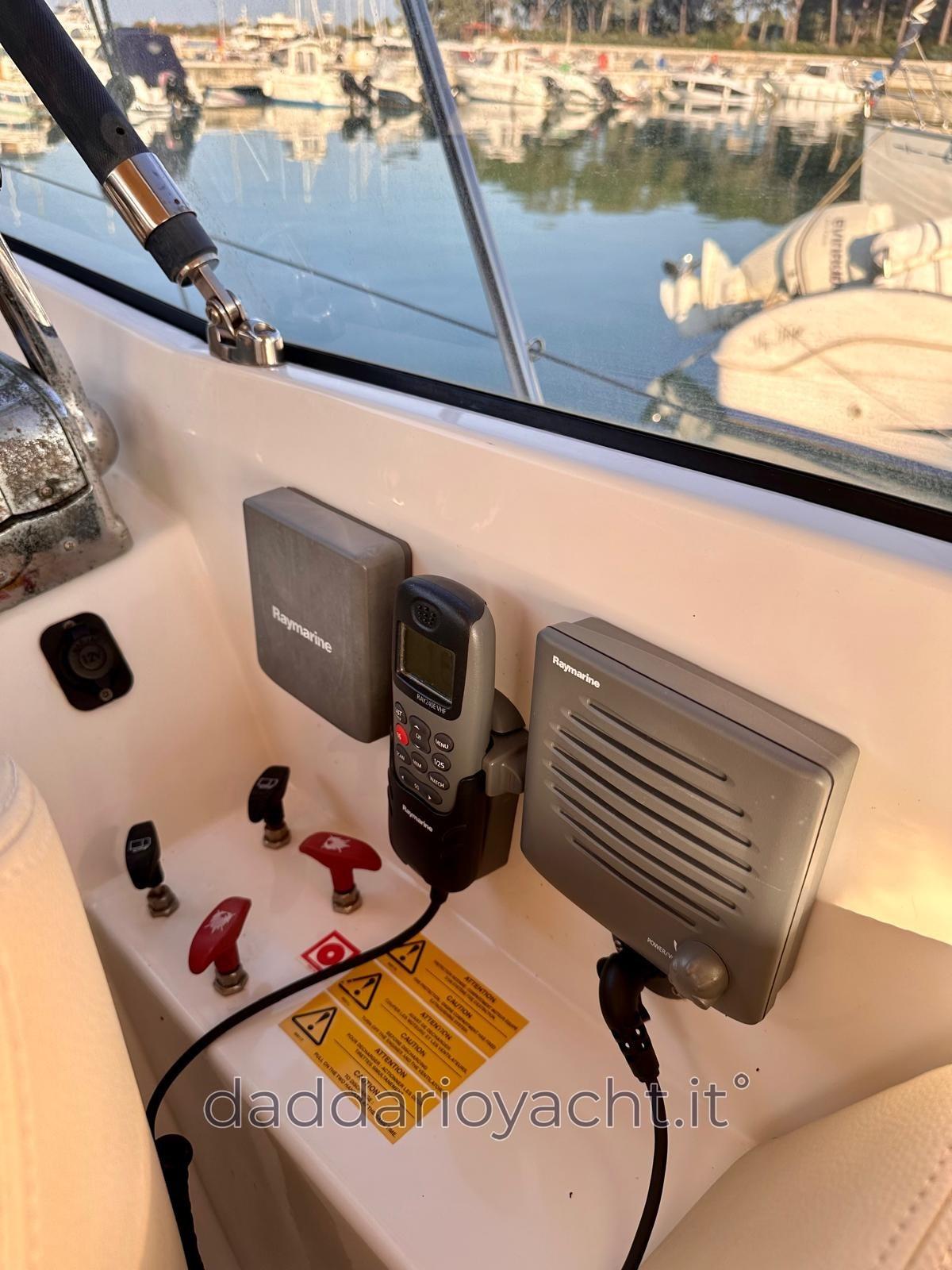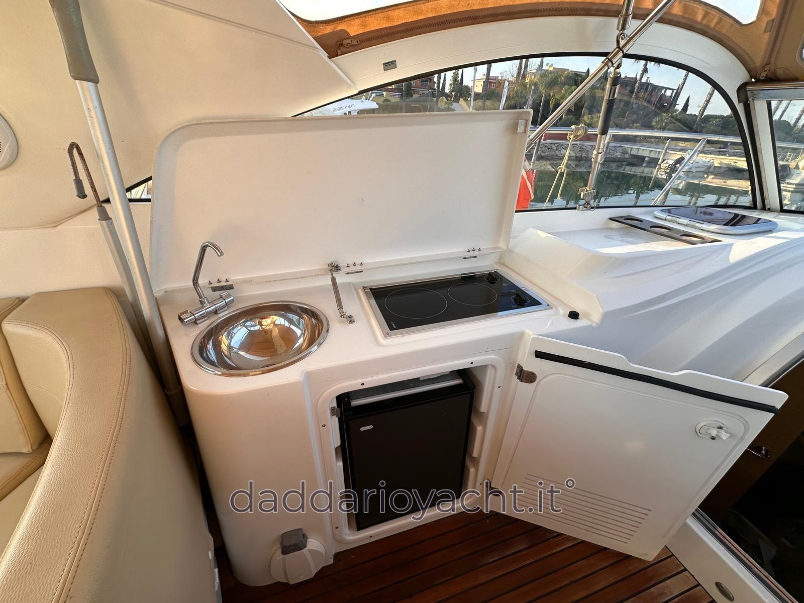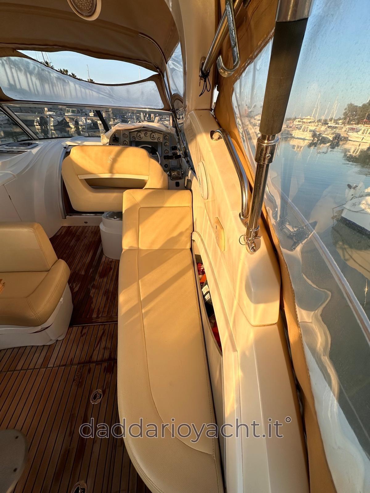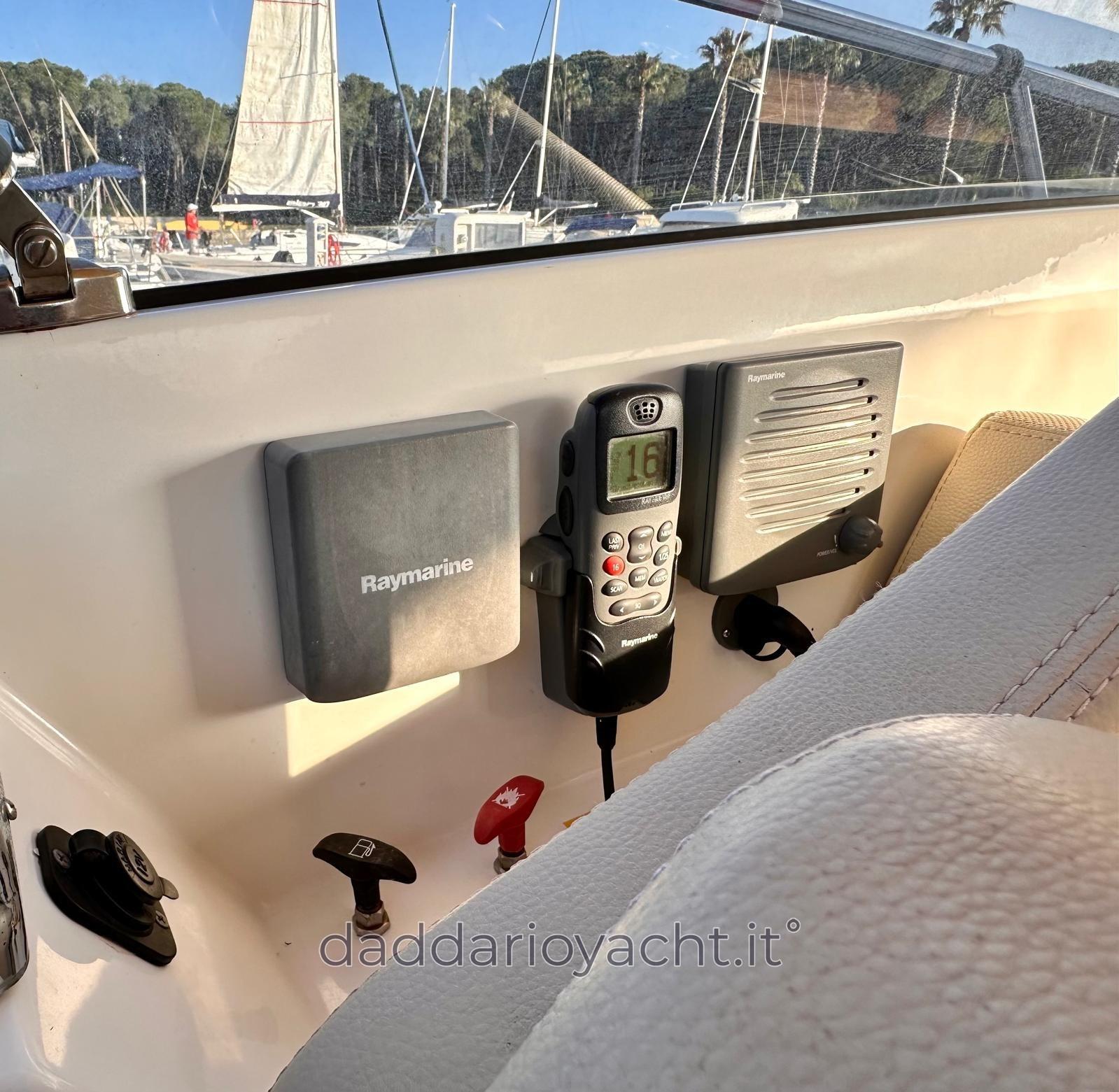 Alarme moteur, Eau sous pression, Couleur spéciale (rosso), Douche de cockpit, Lavabo dans le cockpit, Passerelle (elettrica + TEAK), Plateforme arrière (TEAK), Pompe de cale automatique, Prise de quai, Rollbar, Guindeau électrique (+ comando in timoneria), Chaise support HB, table de cockpit, Annexe (2.30mt+suzuki 2.5cv).