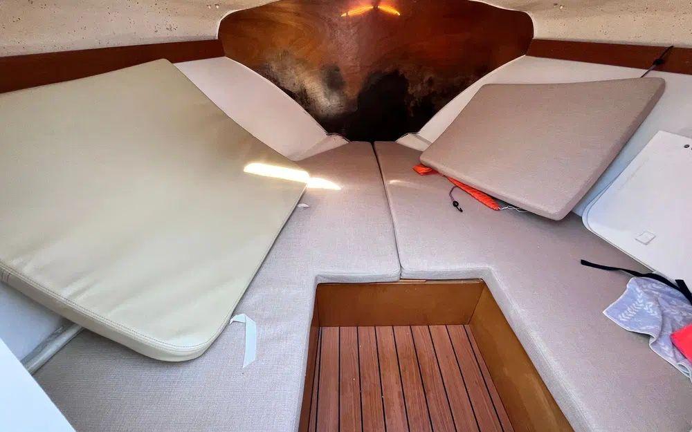 Avec ses 6,03 mètres de longueur et ses 2,44 mètres de largeur, il offre une belle habitabilité dans un gabarit compact. À bord, une cabine équipée de 2 couchages vous attend pour une nuit paisible ou une petite sieste entre deux mouillages. Vous profiterez aussi d’un bain de soleil (et d’un taud quand le soleil tape trop fort), d’une table de cockpit conviviale, d’un espace de détente sur les banquettes extérieures, et d’un coffre de rangement pour tout ce qui traîne habituellement sur un bateau. Côté pratique, on retrouve une échelle de bain, un évier extérieur, une pompe de cale électrique, sans oublier la prise 12V pour brancher votre glacière ou recharger le téléphone, histoire de poster vos plus belles photos à la crique.