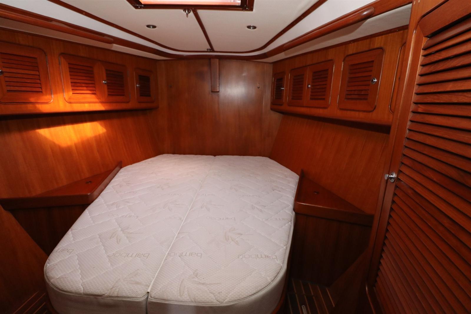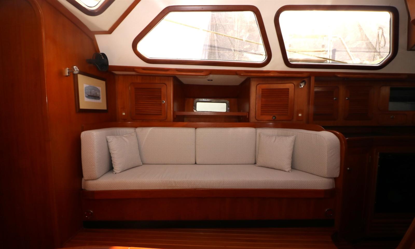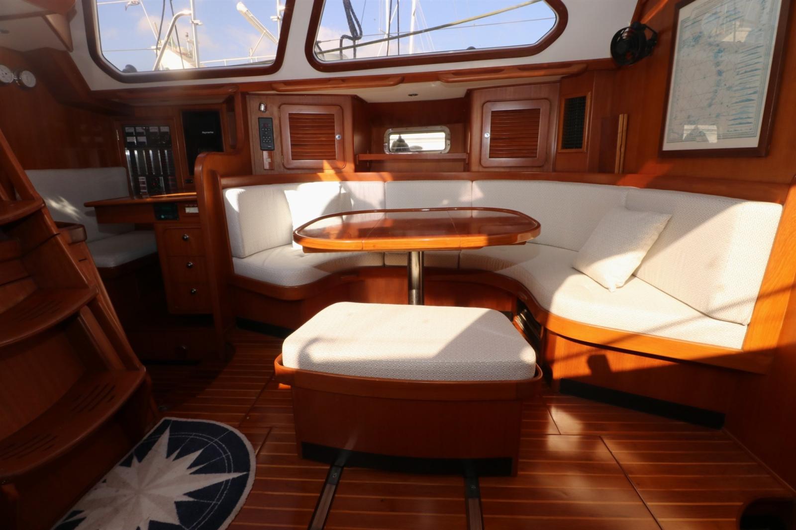 Sous le pont, le Hylas 54 impressionne par un intérieur spacieux et ingénieusement conçu qui allie confort à bord et fonctionnalité pratique. L’ensemble de trois cabines et deux salles de bain comprend une luxueuse cabine principale à l’arrière avec un lit queen au centre, un espace de rangement abondant et une salle de bain attenante avec douche séparée. Le saloon offre un espace lumineux et accueillant pour recevoir ou se détendre, avec des finitions en teck finement travaillées et une lumière naturelle abondante. Une cuisine bien équipée, une station de navigation orientée vers l’avant et de nombreux détails prêts à naviguer — tels que des casiers profonds, des postes marins et des poignées sécurisées — font du Hylas 54 un choix éprouvé pour les croiseurs en quête de confort, de sécurité et d’élégance en mer.
