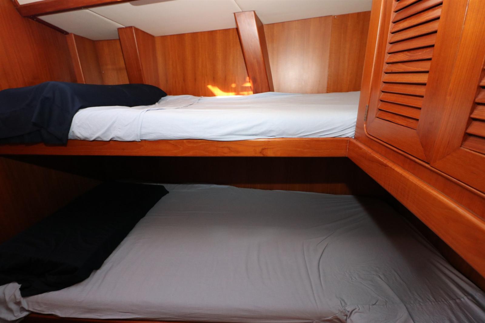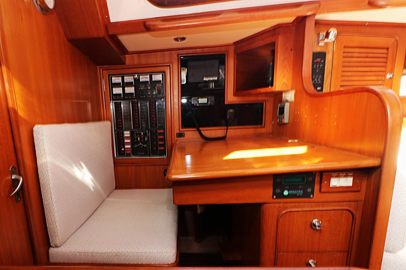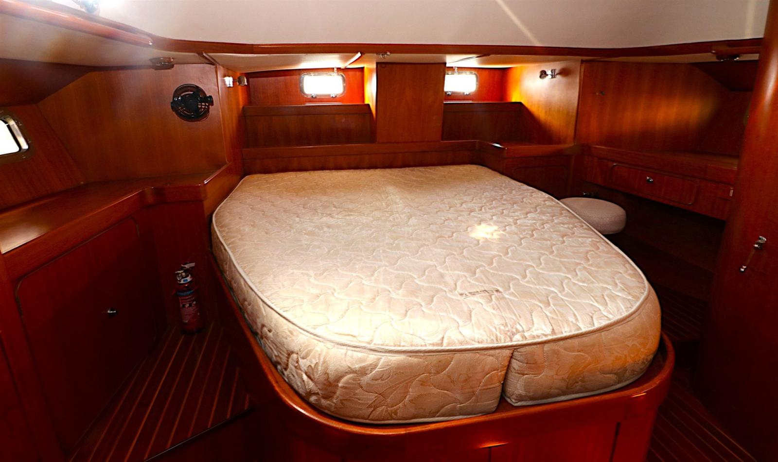 Sous le pont, le Hylas 54 impressionne par un intérieur spacieux et ingénieusement conçu qui allie confort à bord et fonctionnalité pratique. L’ensemble de trois cabines et deux salles de bain comprend une luxueuse cabine principale à l’arrière avec un lit queen au centre, un espace de rangement abondant et une salle de bain attenante avec douche séparée. Le saloon offre un espace lumineux et accueillant pour recevoir ou se détendre, avec des finitions en teck finement travaillées et une lumière naturelle abondante. Une cuisine bien équipée, une station de navigation orientée vers l’avant et de nombreux détails prêts à naviguer — tels que des casiers profonds, des postes marins et des poignées sécurisées — font du Hylas 54 un choix éprouvé pour les croiseurs en quête de confort, de sécurité et d’élégance en mer.