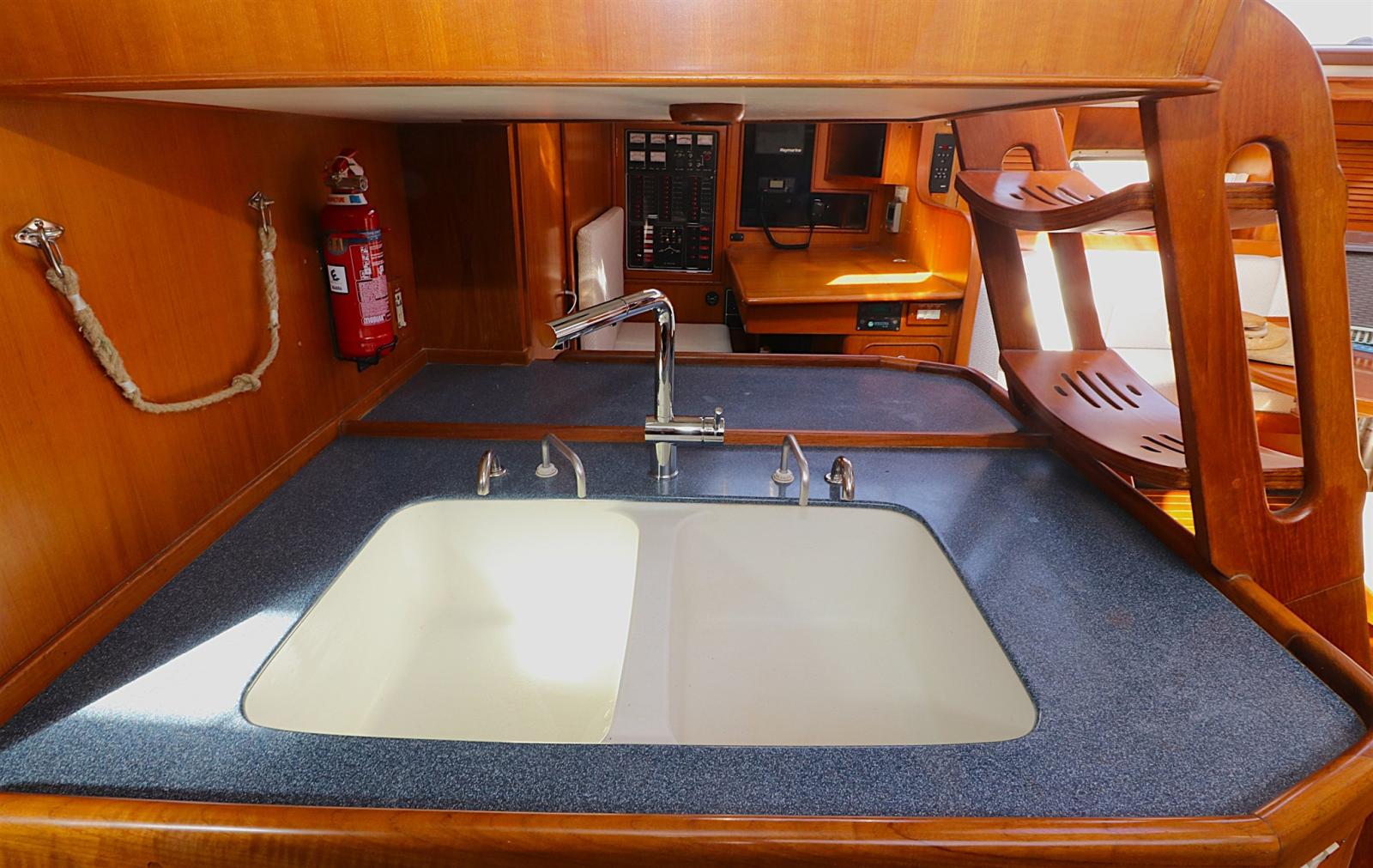 COQUE ET ROUF REPEINTS, COPALS REFAITS, COQUE RESTAURÉE EN GELCOAT AVEC TRAITEMENT ÉPOXY ; NOUVEAU BOTTOZZO EN ACIER INOXYDABLE ; FEUX DE NAVIGATION ET SUR LES BARRES DE FLÈCHE, CALES ET CALAGE REPEINTS ; NOUVEAUX CADRES DE HUBLOT ; COMPRESSEURS FRIGORIFIQUES ET PLAQUES CHAUFFANTES
