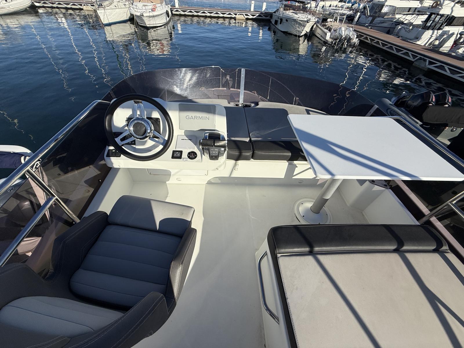 • Flybridge complet avec table, bain de soleil modulable et coussin chaise longue.