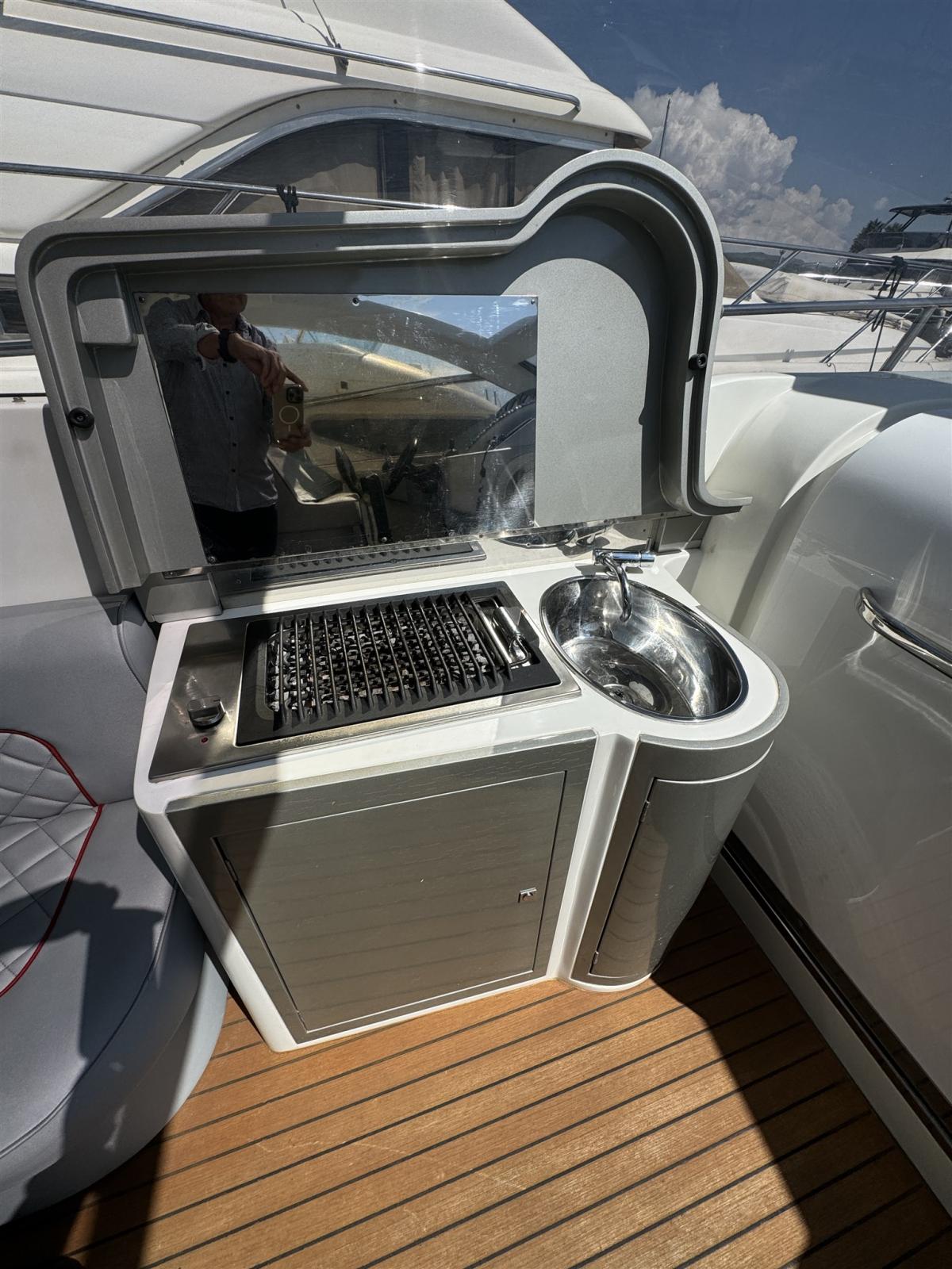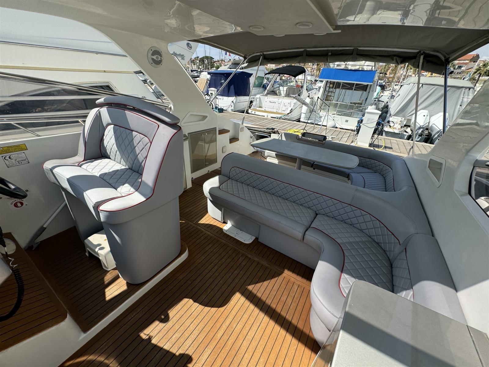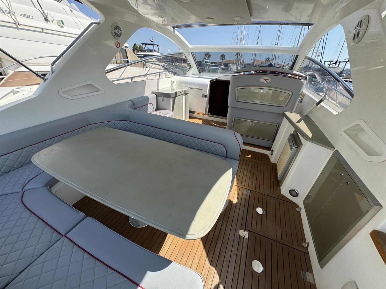 Eau sous pression, Douche de cockpit, Hard top, Extincteur(s) fixe(s), Lavabo dans le cockpit, Passerelle, Plateforme arrière (teck), Pompe de cale automatique, Cockpit en teck, Prise de quai, Onduleur, Guindeau électrique, Echelle de bain, table de cockpit.