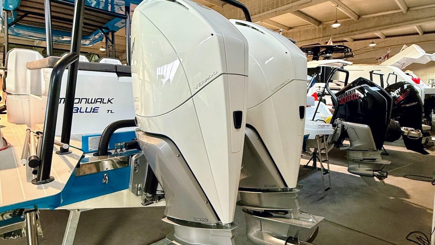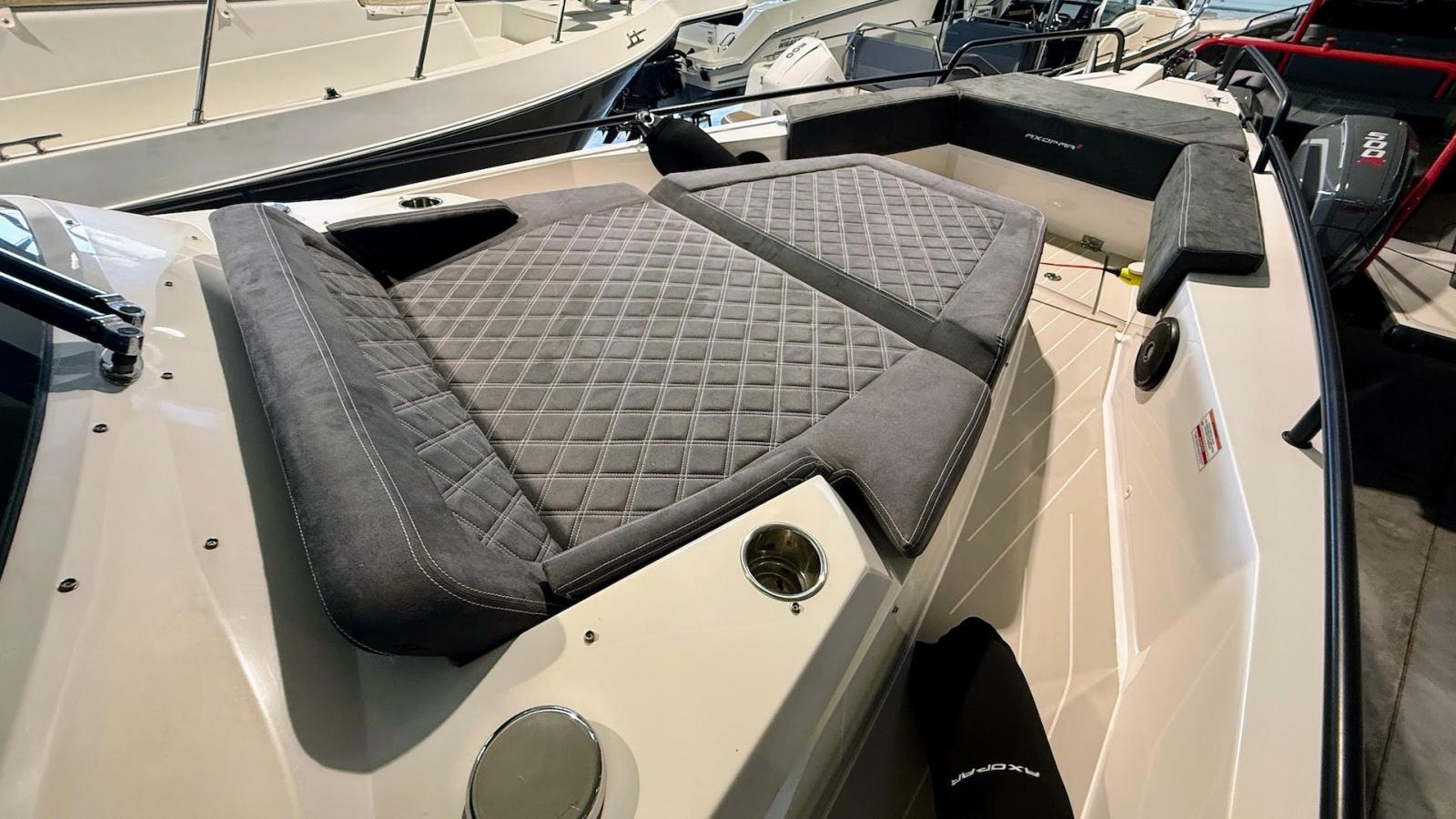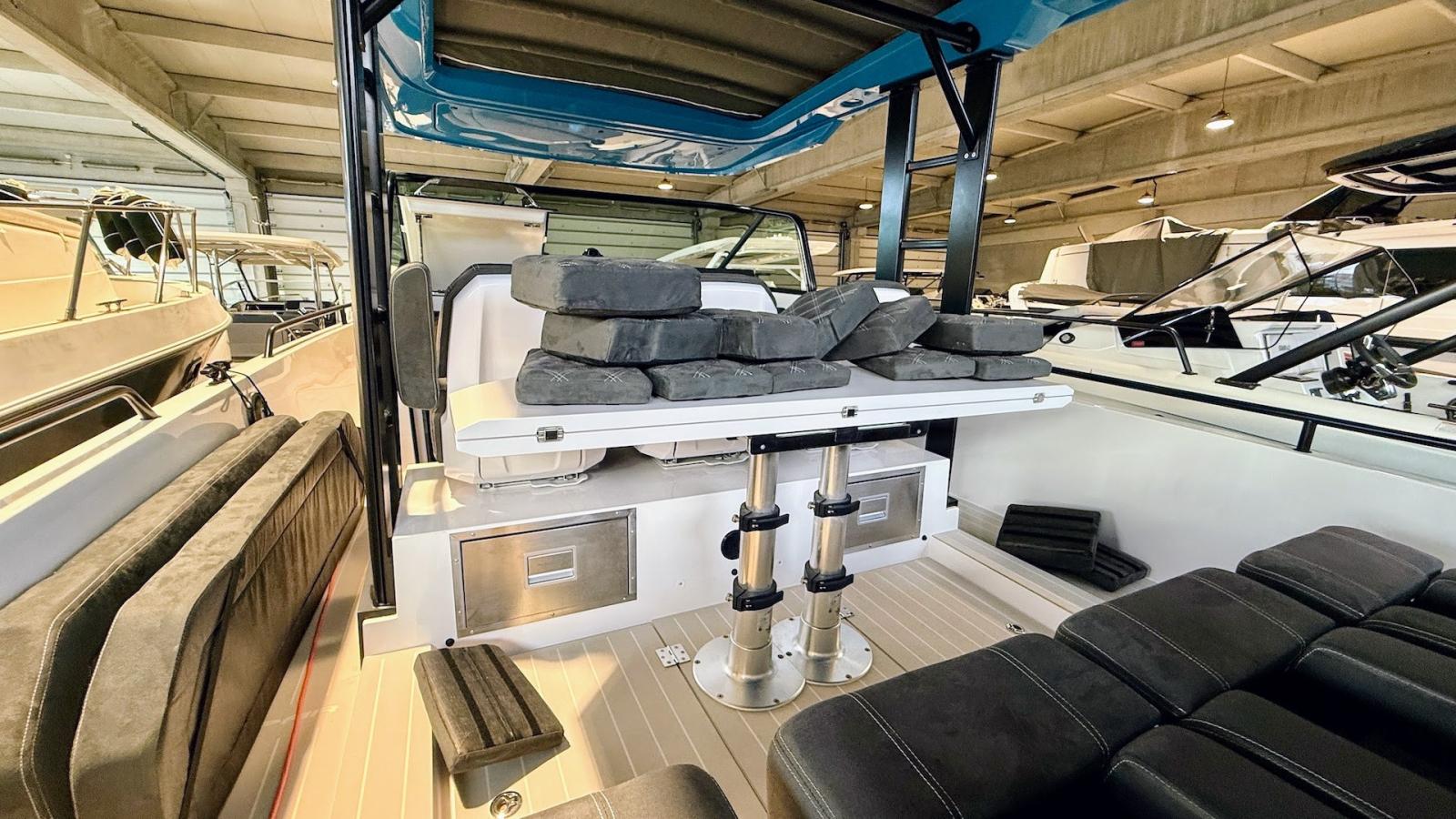 Alarme moteur, Ancre (12,5 Kg), 4 Batteries, Chargeur de batterie (40 Ah), Couleur spéciale (bleue), Douche de cockpit, Propulseur d'étrave (Side Power SE60), Phare de poursuite, Flaps électriques, Crochet de remorquage pour ski nautique (arceau), Indicateurs de flaps, Éclairage de courtoisie, Spots sous-marins, Pompe de cale automatique, Cockpit en teck, Prise de quai, Guindeau électrique, Echelle de bain, table de cockpit, T-Top (avec toit en dur).