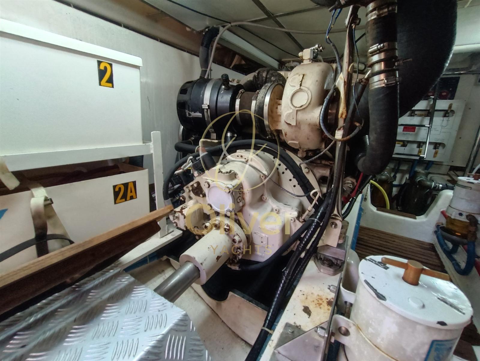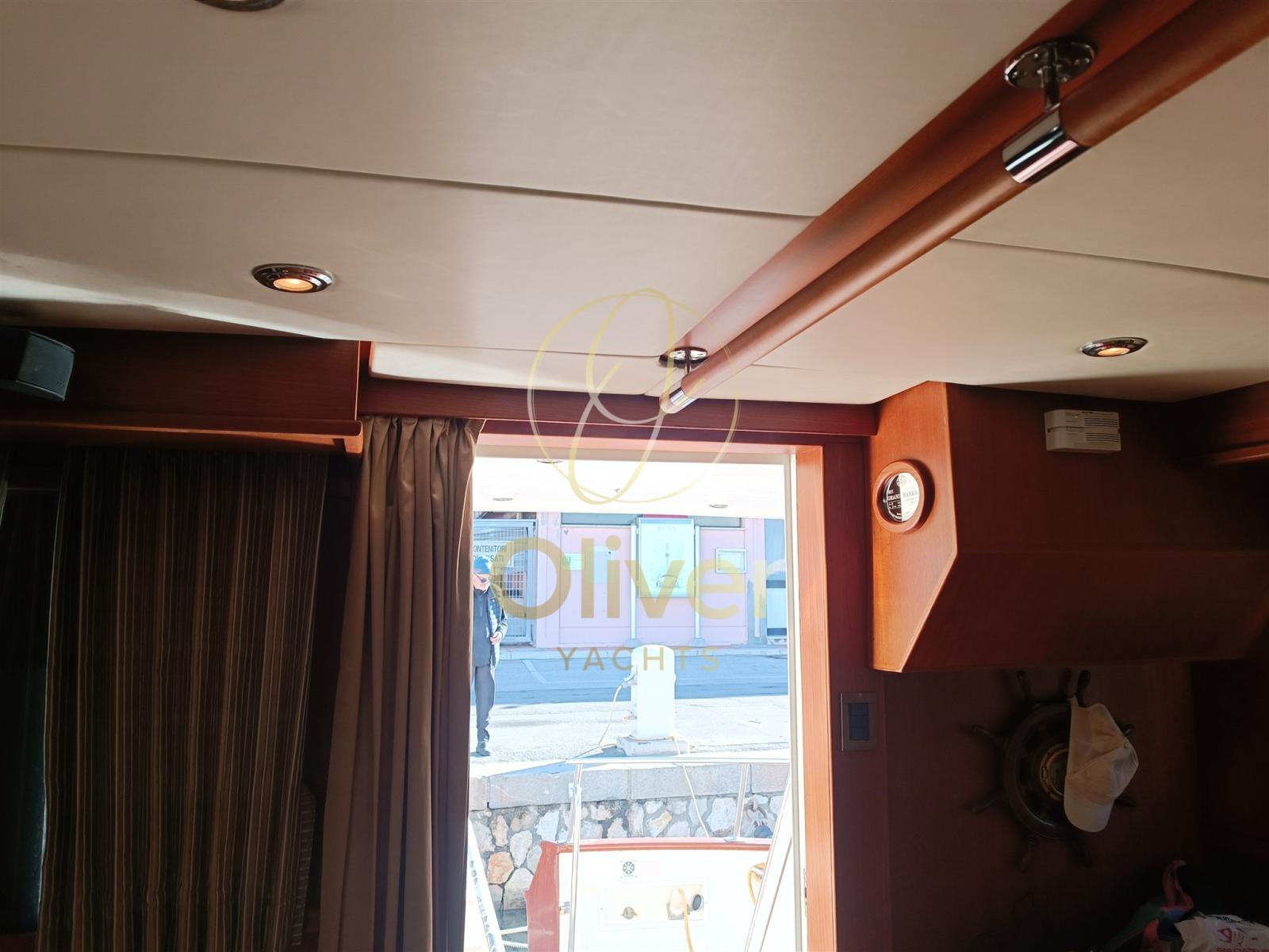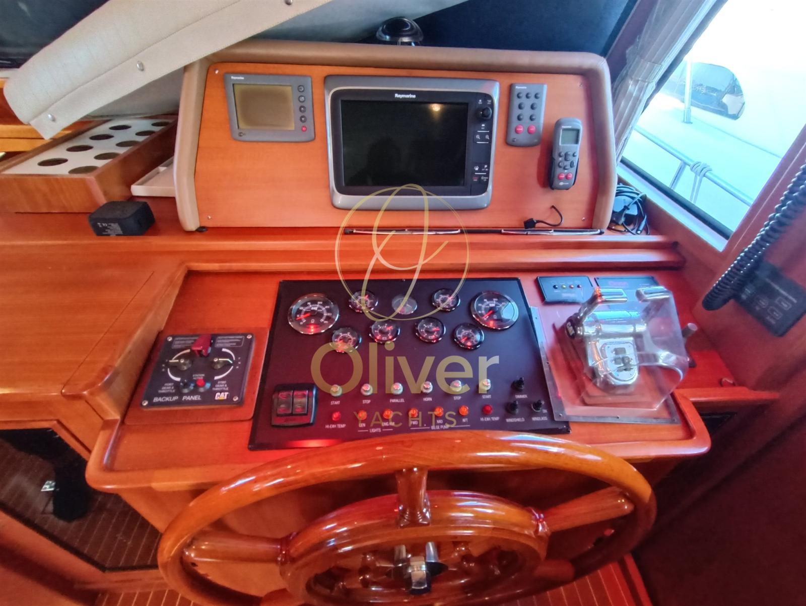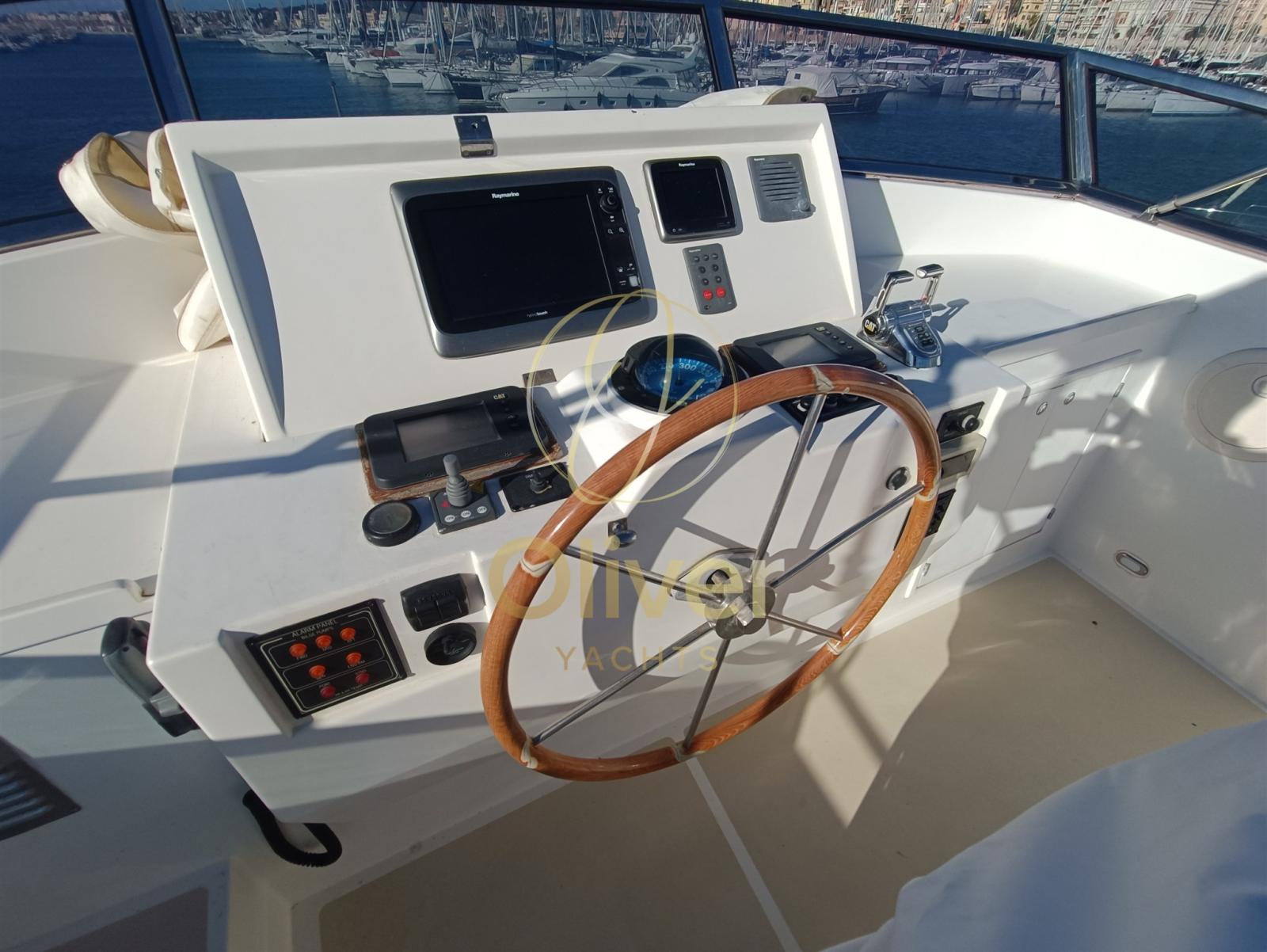Alarme moteur, Alarme de pompe de cale, Eau sous pression, Douche de cockpit, Double barre à roue, Phare de poursuite, Flaps hydrauliques, Grue de flybridge, Indicateurs de flaps, Éclairage de courtoisie, Passerelle, Pompe de cale automatique, Cockpit en teck, Prise de quai, Guindeau électrique, Echelle de bain, table de cockpit, Corne, Winch électrique arrière.
