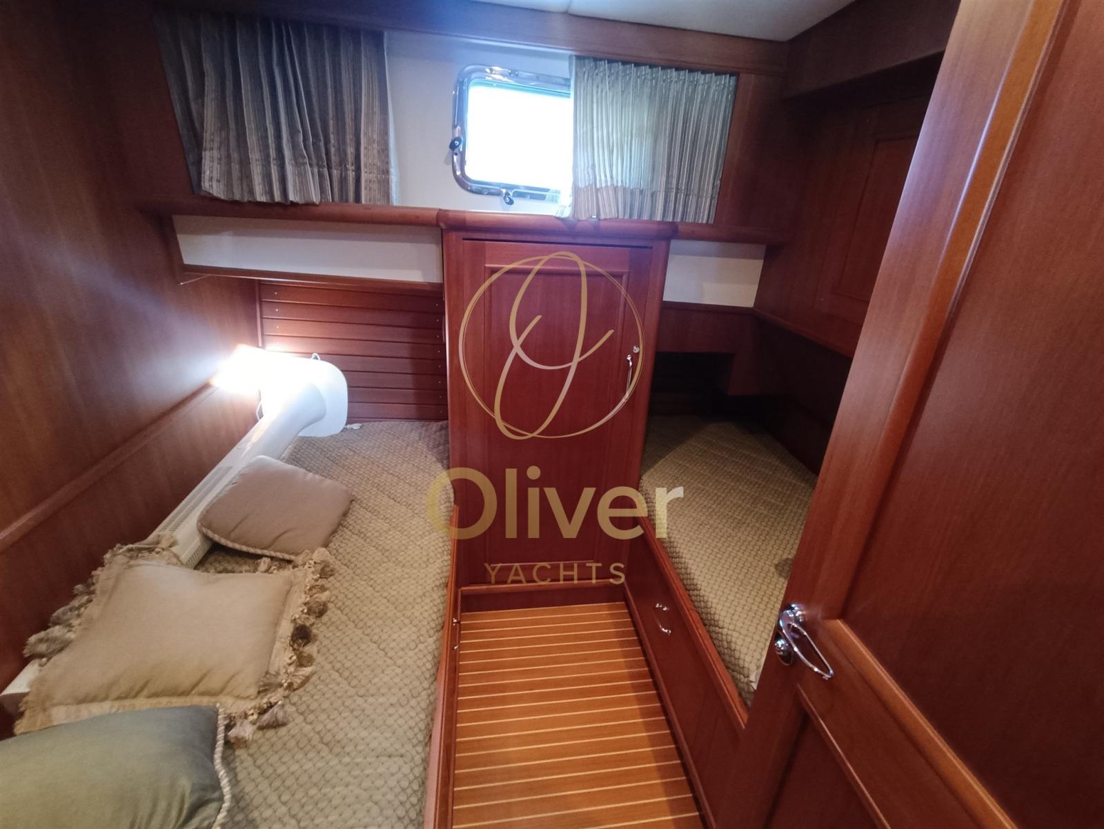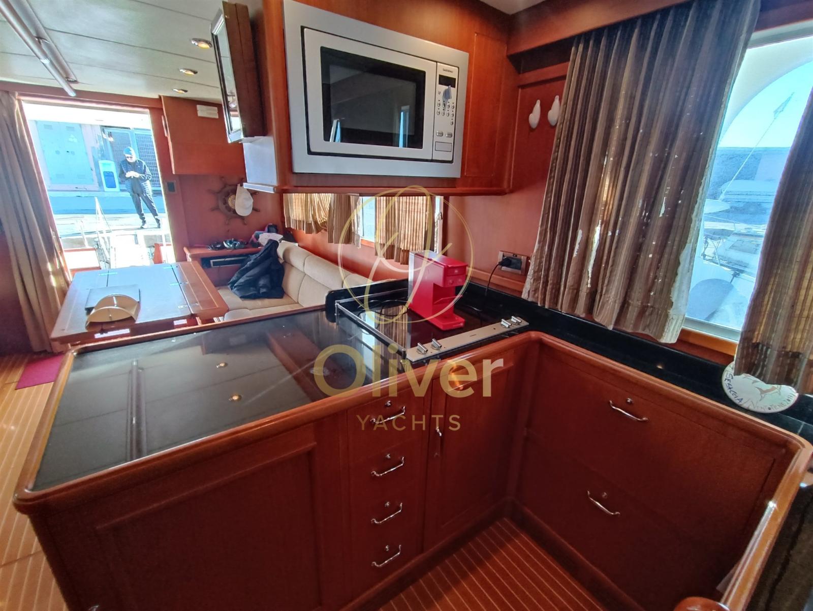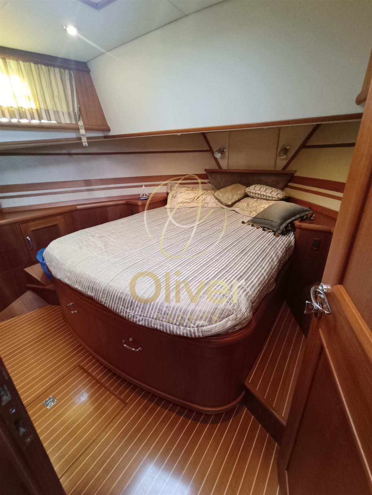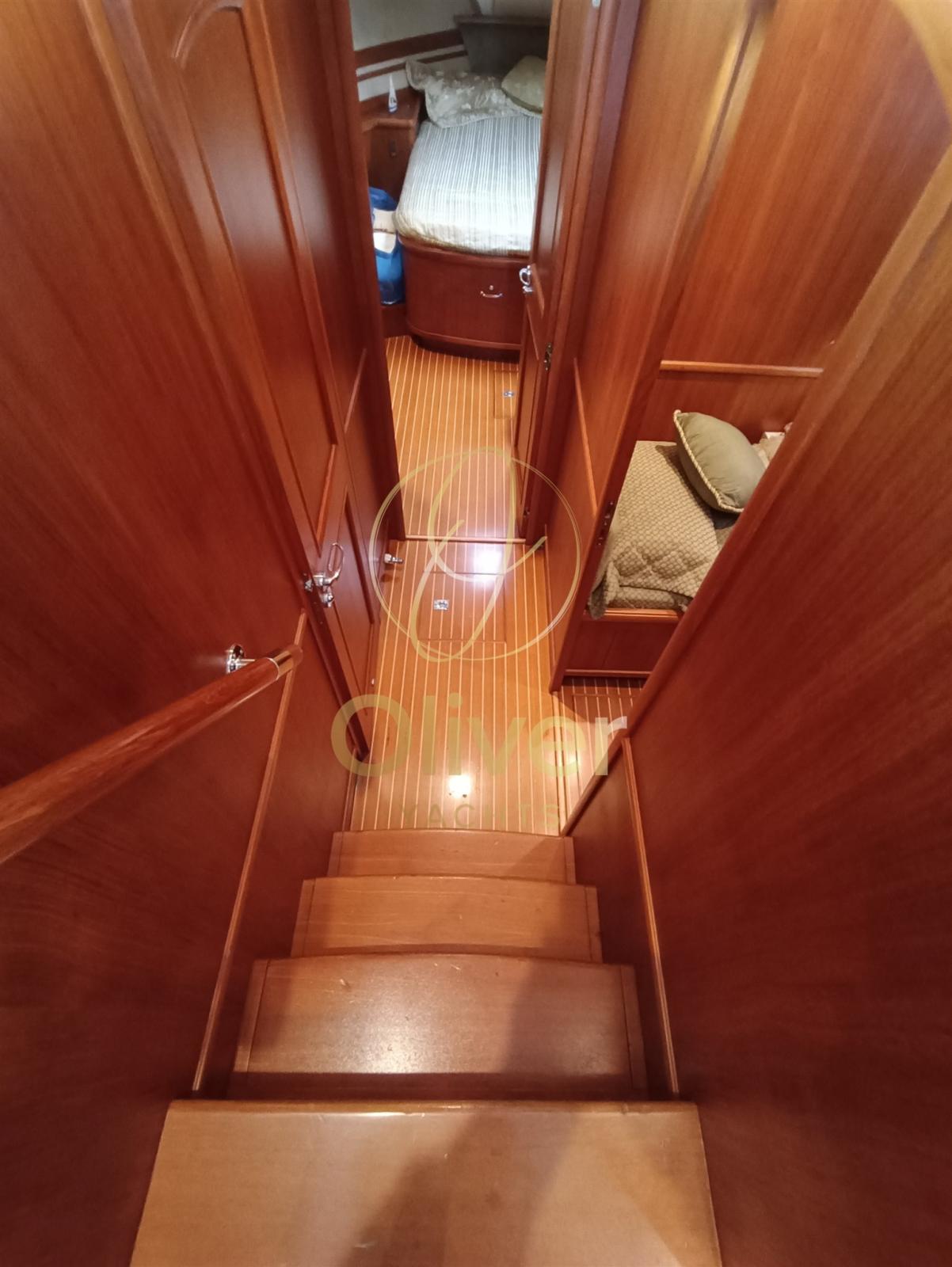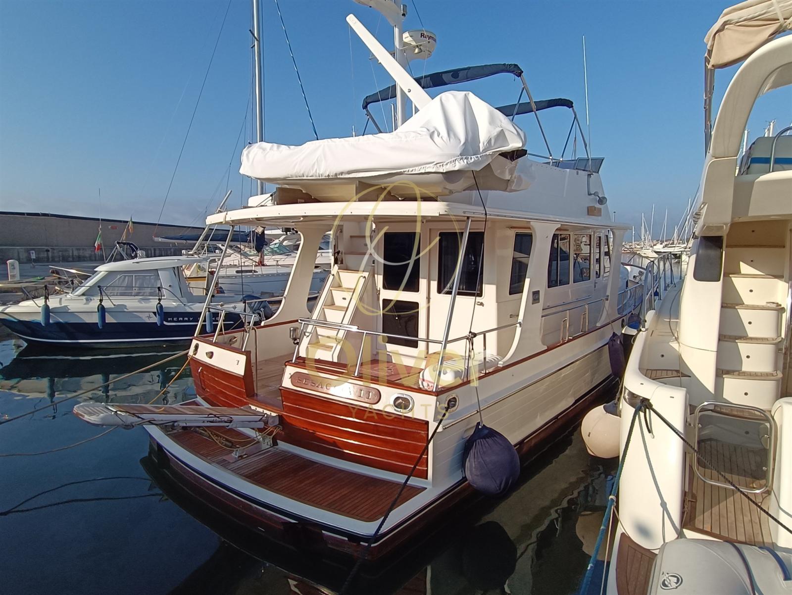 Alarme moteur, Alarme de pompe de cale, Eau sous pression, Douche de cockpit, Double barre à roue, Phare de poursuite, Flaps hydrauliques, Grue de flybridge, Indicateurs de flaps, Éclairage de courtoisie, Passerelle, Pompe de cale automatique, Cockpit en teck, Prise de quai, Guindeau électrique, Echelle de bain, table de cockpit, Corne, Winch électrique arrière.