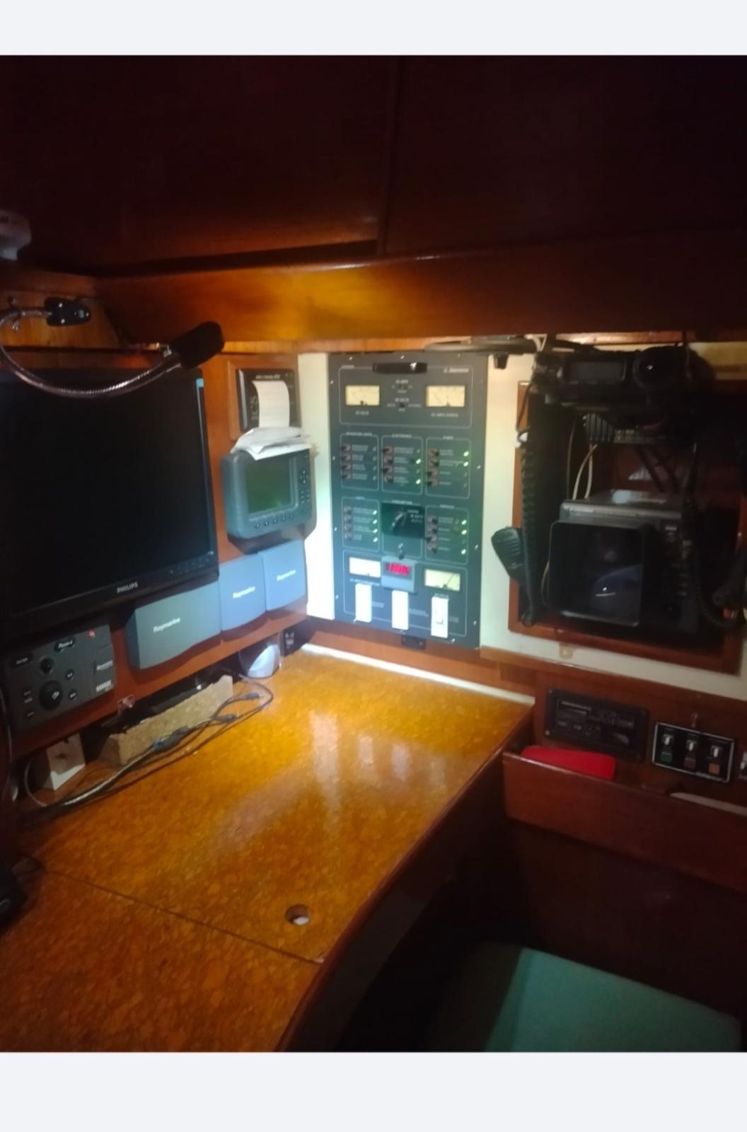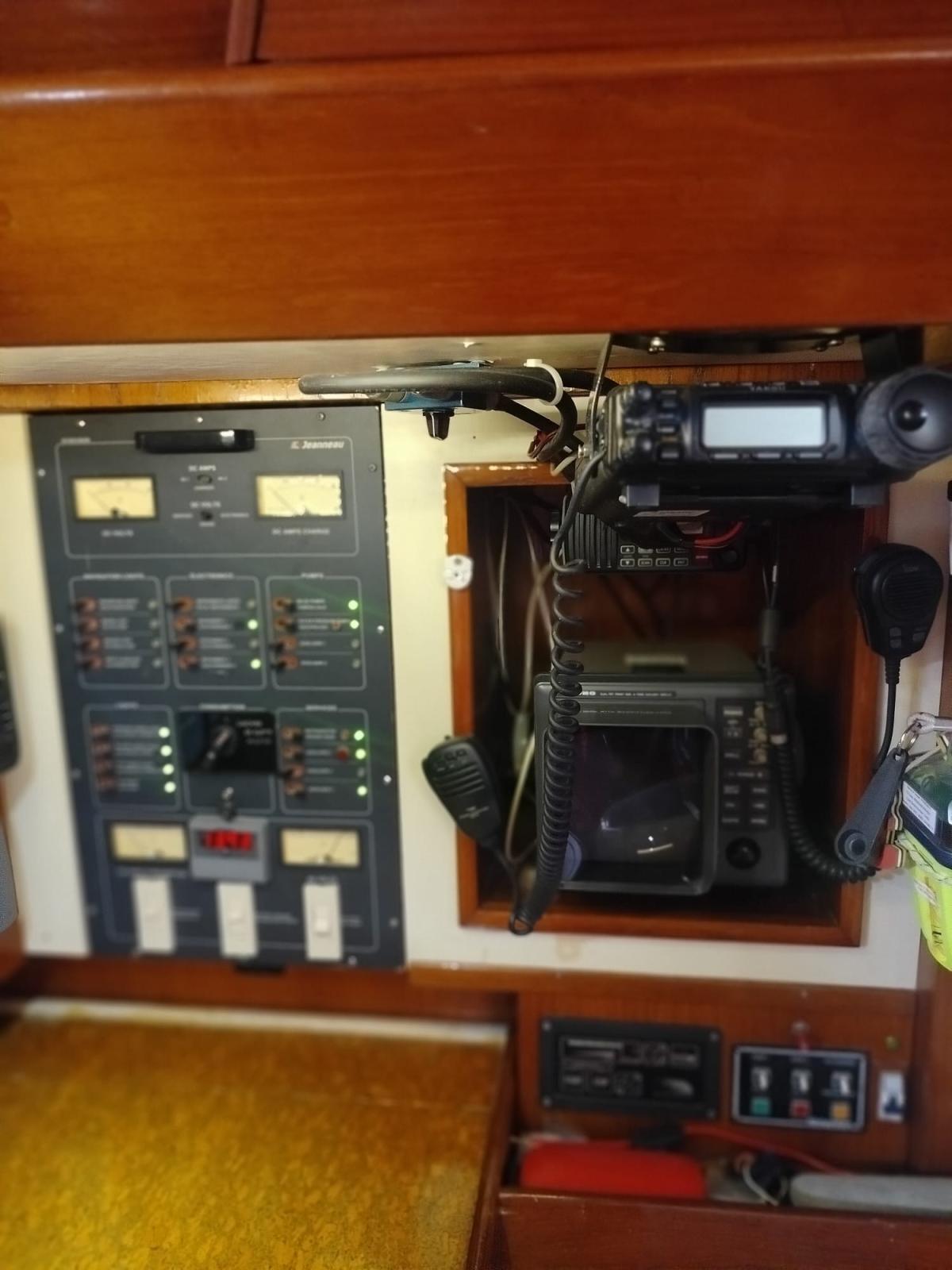 AIS (2010 NASA), Antenne radar (FURUNO), Balise de détresse (2014), GPS (GEONAV 2010), MeteoFax (NAVTEX ICS), Pilote automatique (AUTOHELM 7001+ RAYMARINE 2012), Lecteur de cartes (20"), Radar (FURUNO 2002 24 mg), Radio VHF (2012 ICOM), SSB (2003 YAESU).