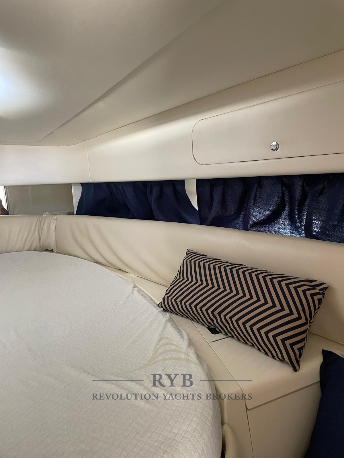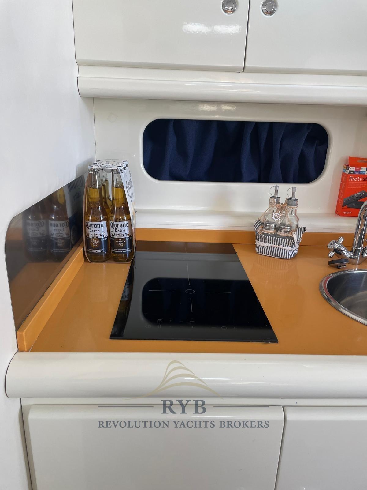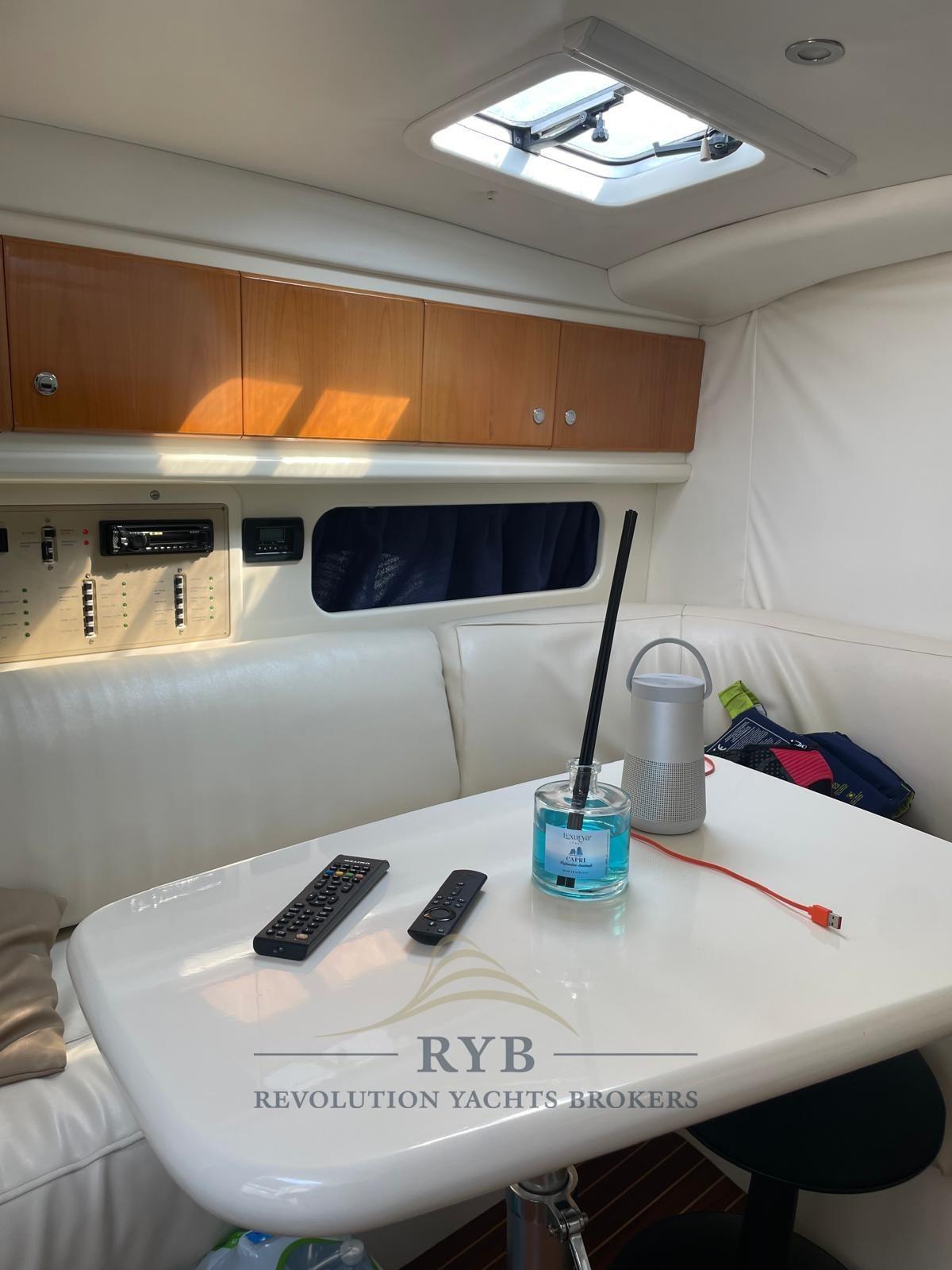 Eau sous pression, Douche de cockpit, Flaps électriques, Passerelle, Plateforme arrière, Porte latérale, Cockpit en teck, Prise de quai, Rollbar, Guindeau électrique, table de cockpit, Table pliante de salon.
