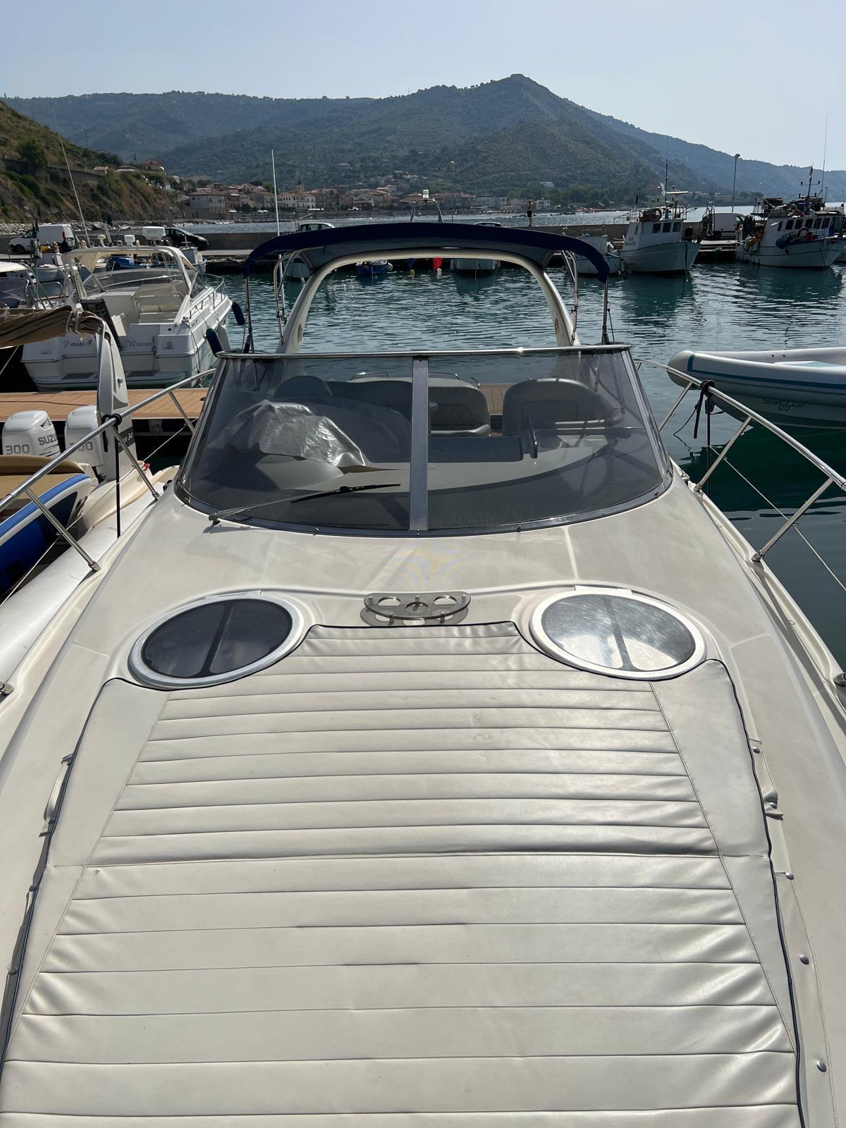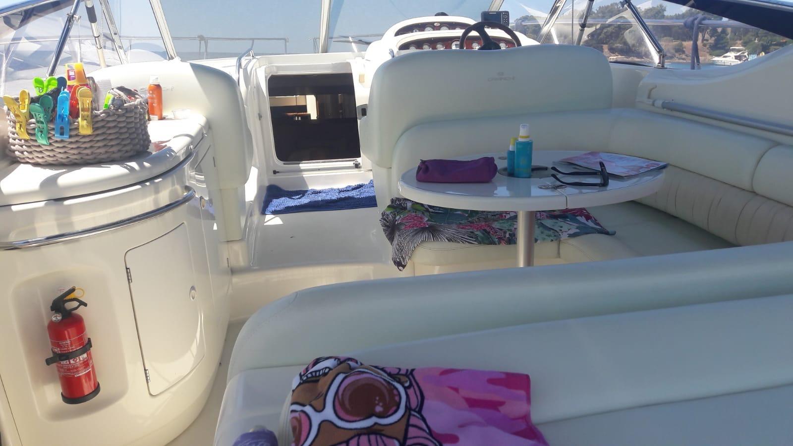 Alarme moteur, Alarme de pompe de cale, Ancre (+ 50 Metri di catena), Eau sous pression, Batteries (Motori, Servizi, Generatore), Douche de cockpit, 2 Flaps hydrauliques, Garage à annexe (Con apertura idraulica), Extincteur(s) fixe(s) (Manuale), 2 Indicateurs de flaps, Lavabo dans le cockpit, Éclairage de courtoisie, Spots sous-marins, Plateforme arrière, Pompe de cale automatique, Porte latérale (Al pozzetto), Prise de quai, Connexion eau sous pression à quai, Rollbar, Guindeau électrique, Echelle de bain, table de cockpit, Annexe (Con motore FB), Winch électrique avant (Verricello Quick).
