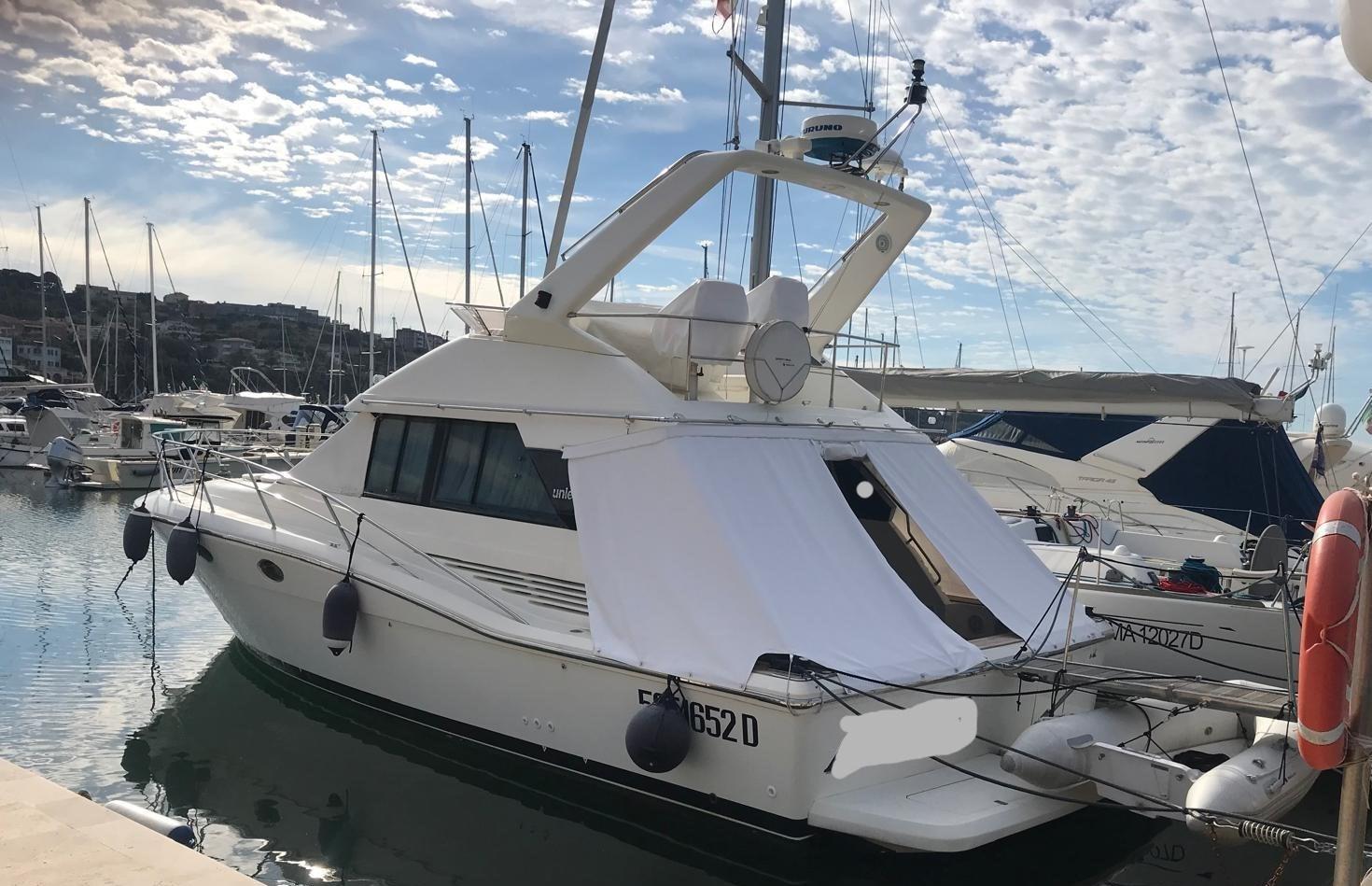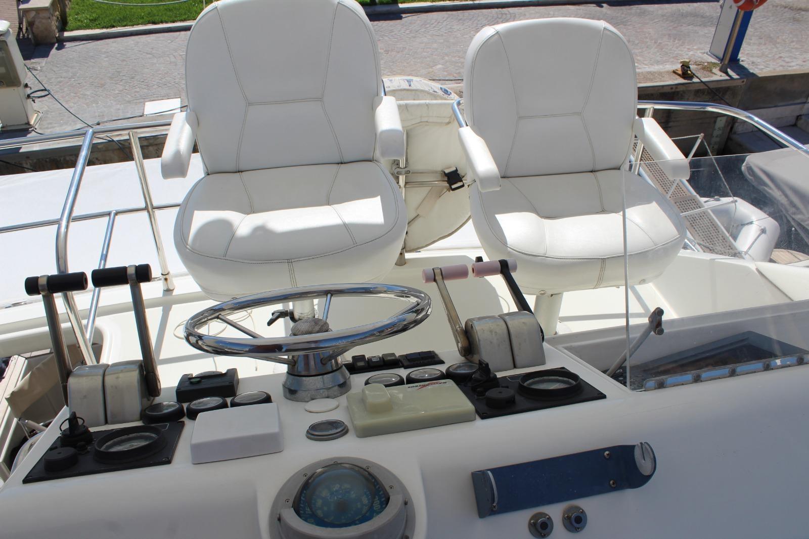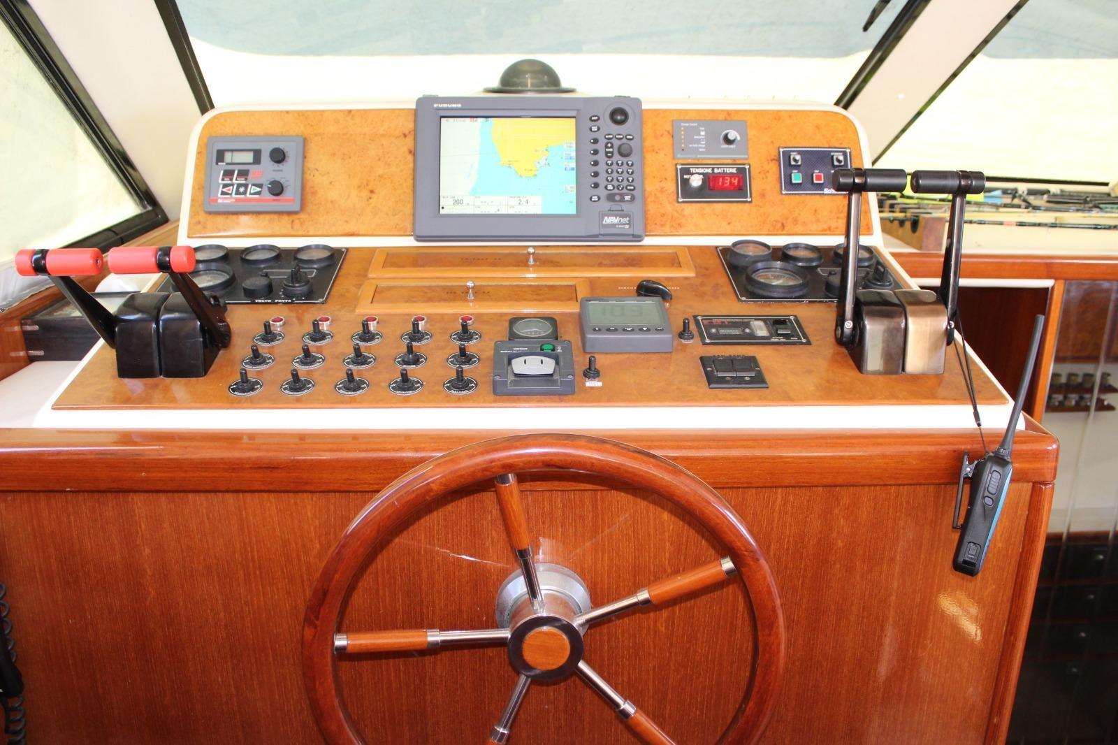 Alarme moteur, Eau sous pression, Douche de cockpit, Phare de poursuite, Flaps hydrauliques, Indicateurs de flaps, Passerelle, Plateforme arrière, Pompe de cale manuelle, Porte latérale, Prise de quai, Connexion eau sous pression à quai, Onduleur, Rollbar, Guindeau électrique (nuovo), Echelle de bain, Annexe (+ Honda 6 cv), Corne.