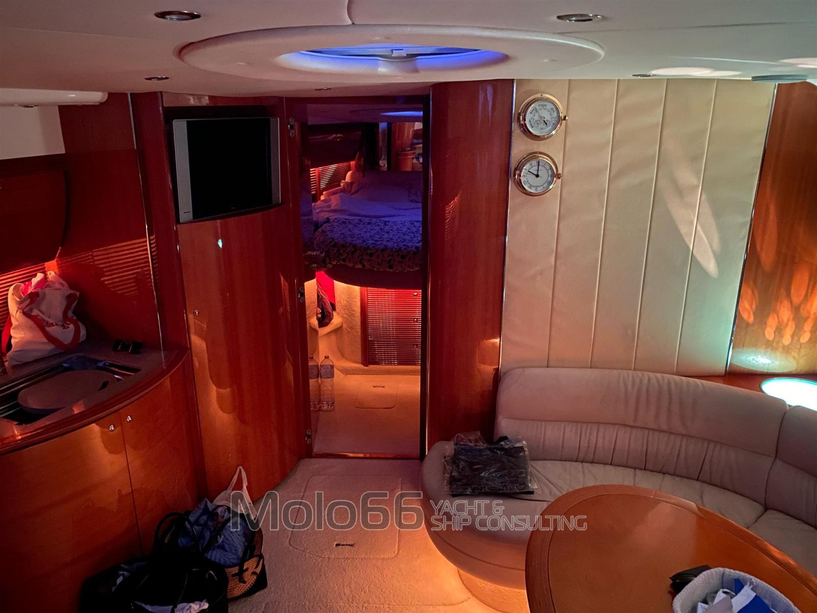 Alarme moteur, Alarme de pompe de cale, Ouverture du compartiment moteur électrique, Eau sous pression, Couleur spéciale (Blu Navy), Douche de cockpit, Phare de poursuite, Flaps hydrauliques (N°2), Garage à annexe, Extincteur(s) fixe(s), Éclairage de courtoisie, Passerelle (IDRAULICA), Plateforme arrière, Pompe de cale automatique, Cockpit en teck, Prise de quai, Onduleur, Rollbar, Guindeau électrique, Echelle de bain, table de cockpit, Corne.