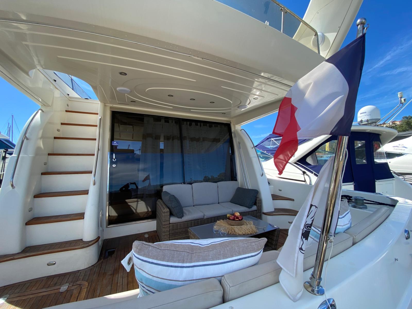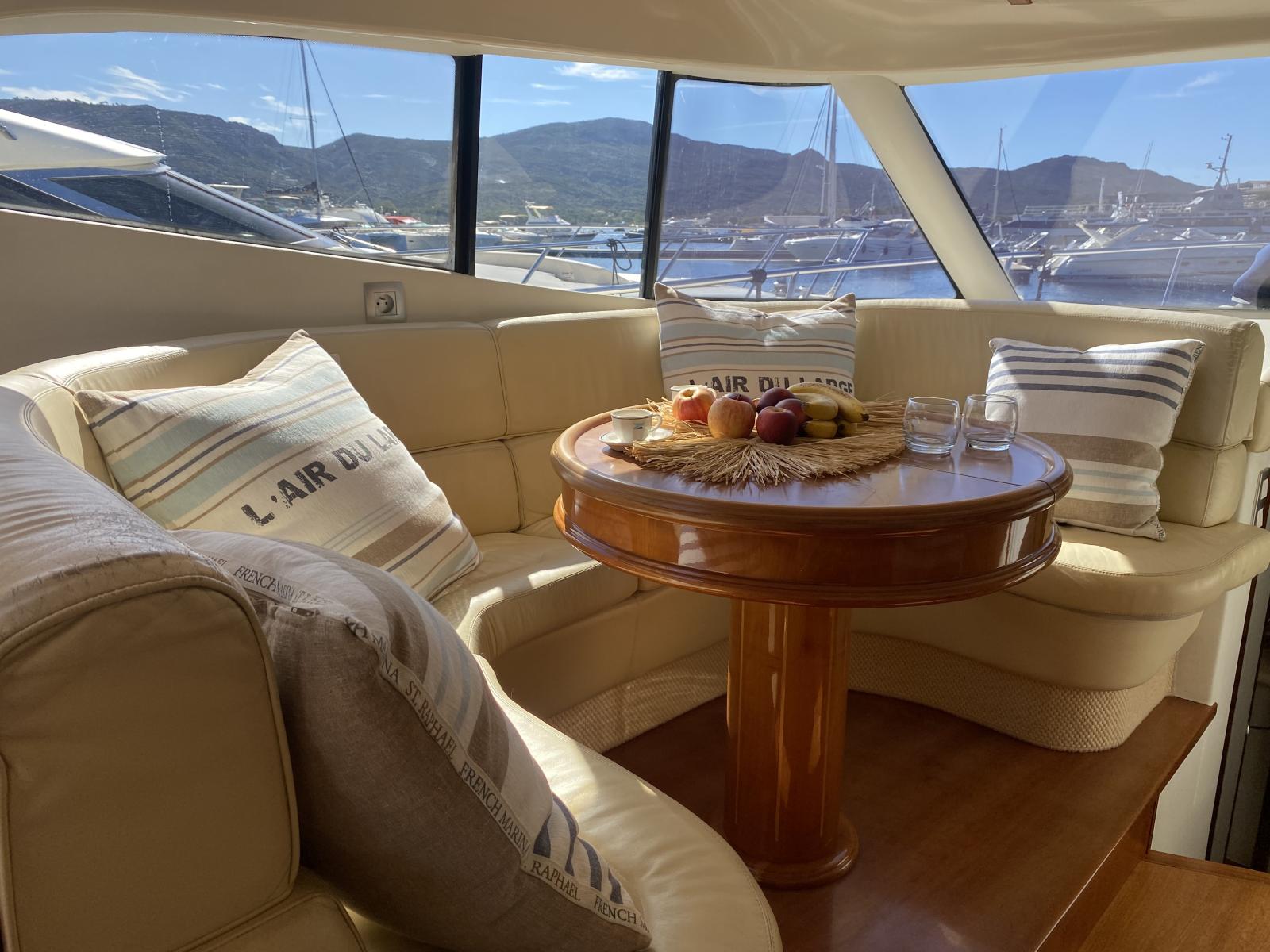 À l’extérieur, on profite d’un bain de soleil avant et d’un second sur le fly, tous deux flambant neufs, parfaits pour les journées farniente sous le soleil méditerranéen. La plateforme arrière en teck accueille un salon extérieur confortable, propice aux dîners en mer ou aux apéritifs au coucher du soleil.