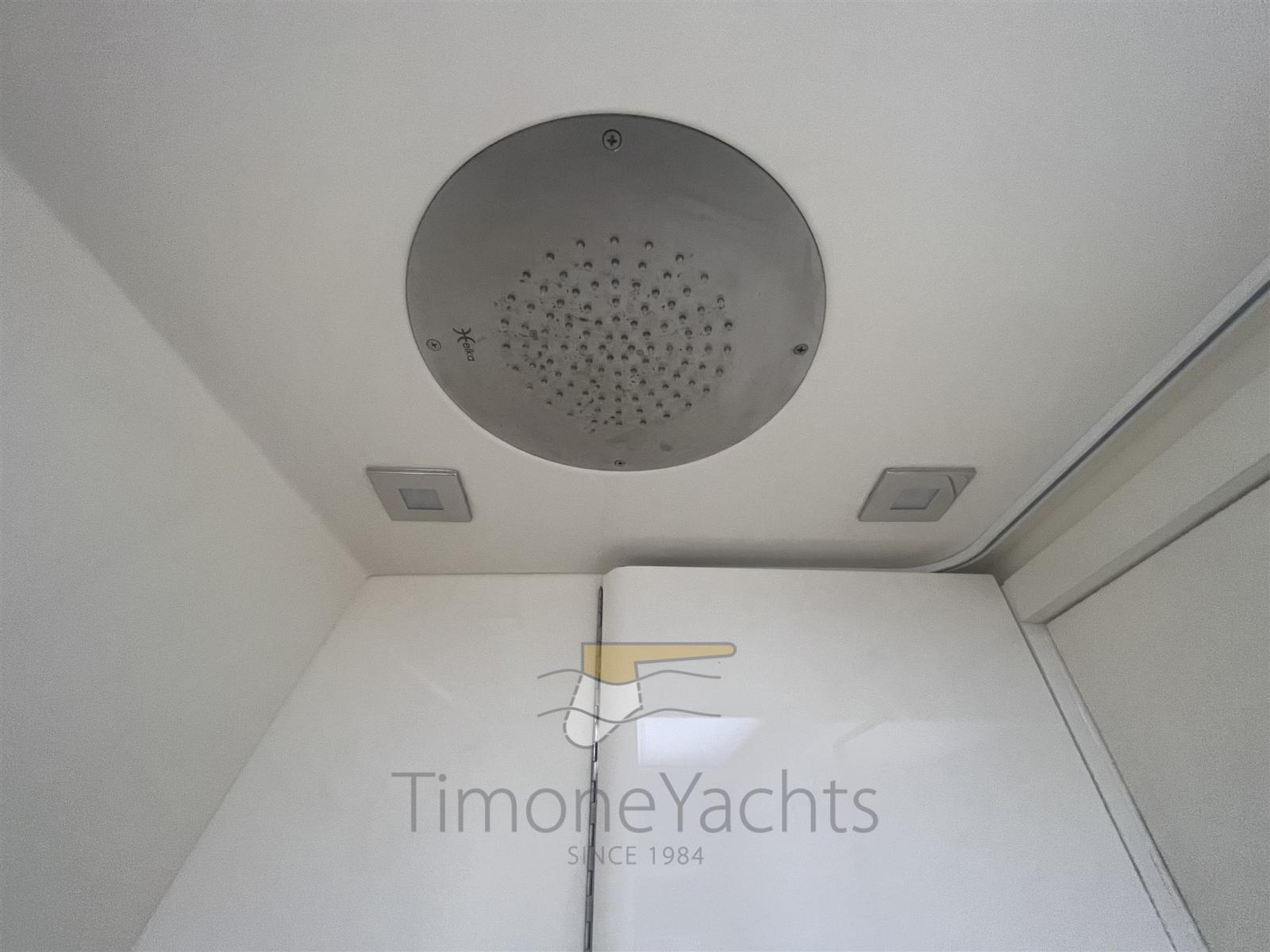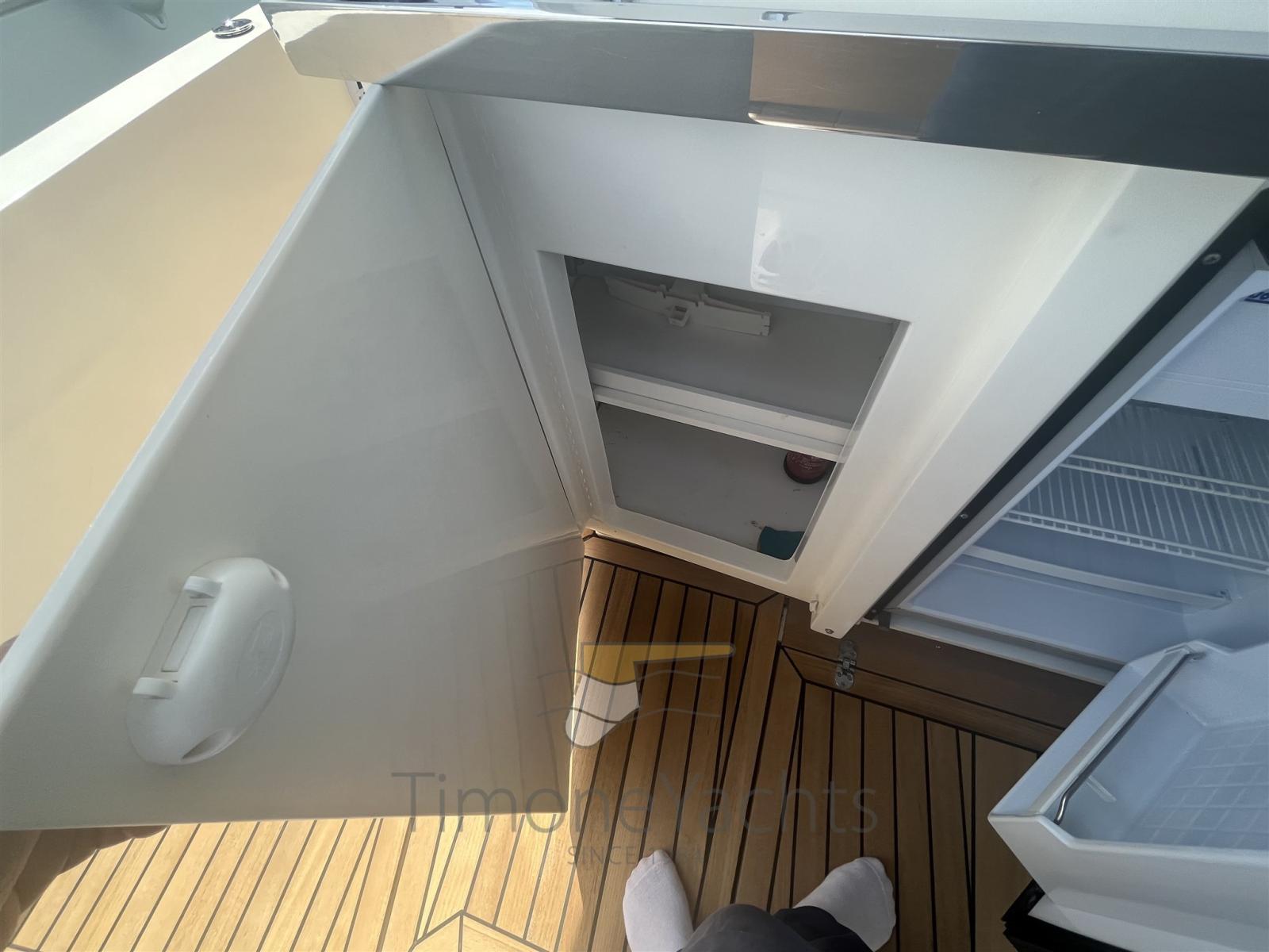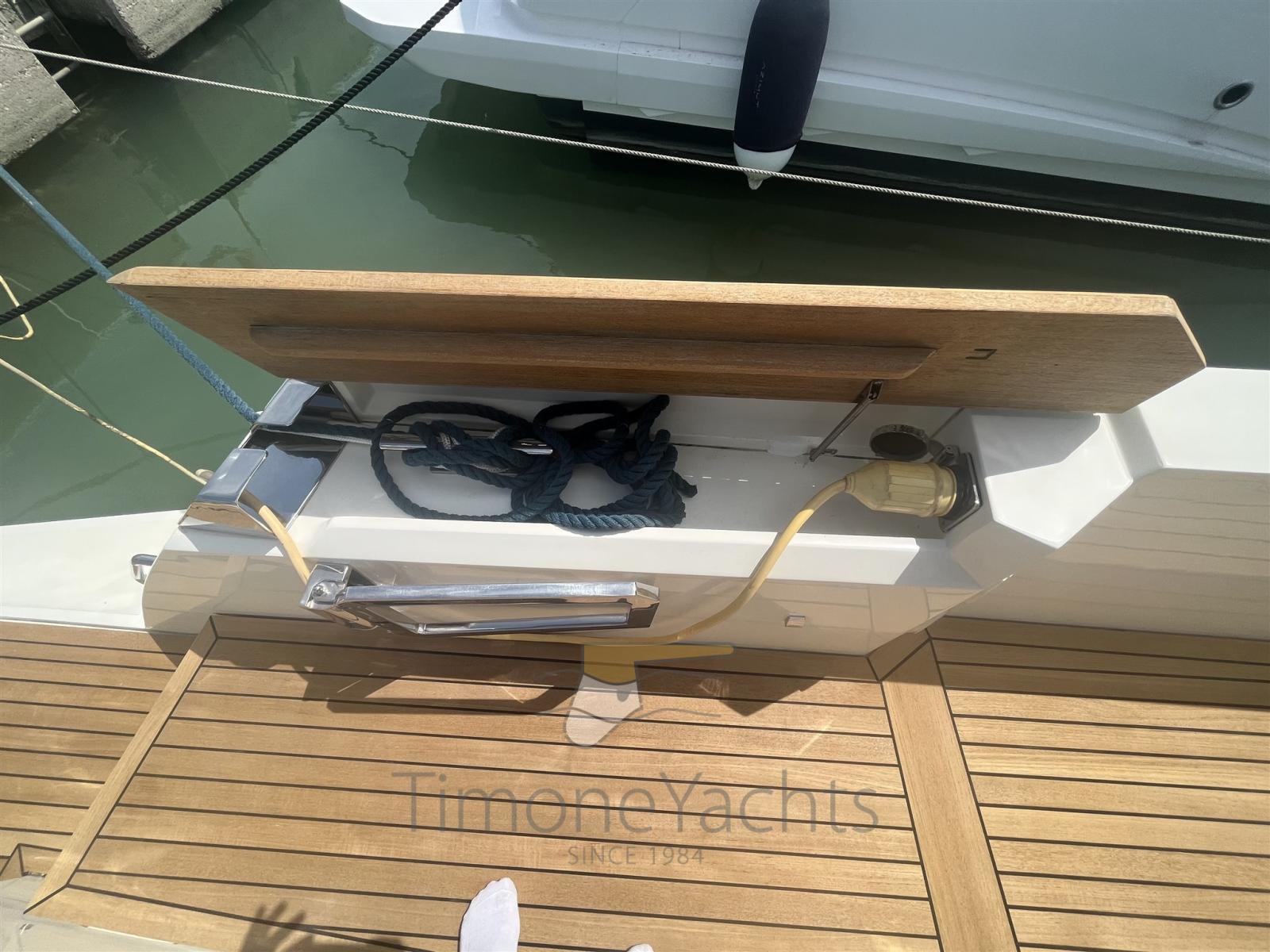 Alarme moteur, Alarme de pompe de cale, Ouverture du compartiment moteur électrique, Eau sous pression, Passavant en teck, Douche de cockpit, Phare de poursuite, Lavabo dans le cockpit, Éclairage de courtoisie, Spots sous-marins, Passerelle, Plateforme arrière (in teak massello 8 mm), Pompe de cale automatique, Cockpit en teck (in teak massello 8 mm), Prise de quai, Guindeau électrique, Echelle de bain, table de cockpit.