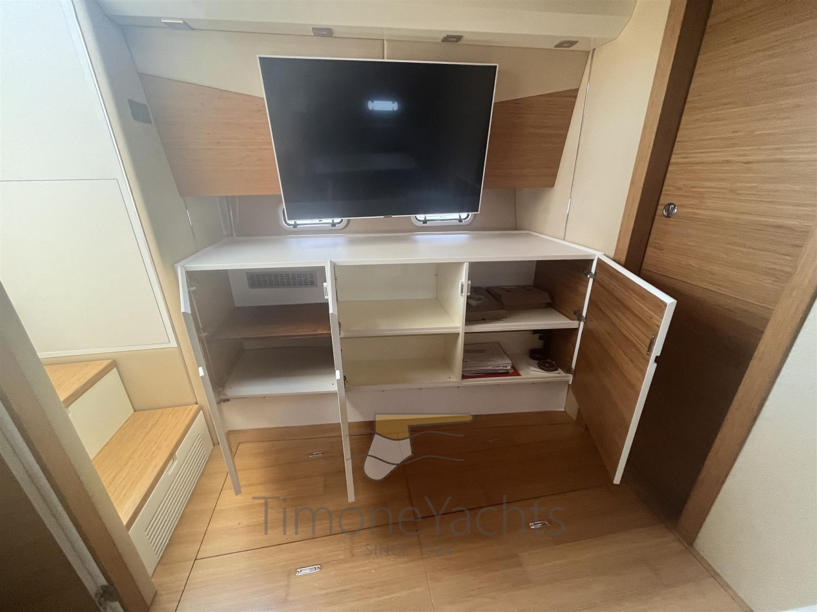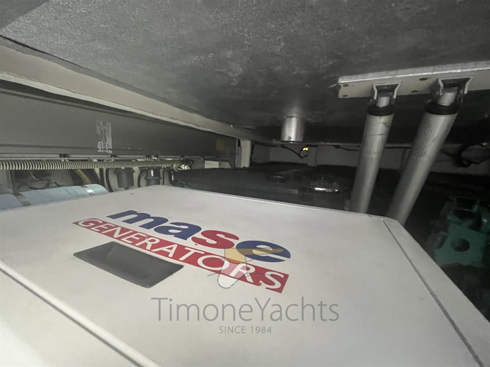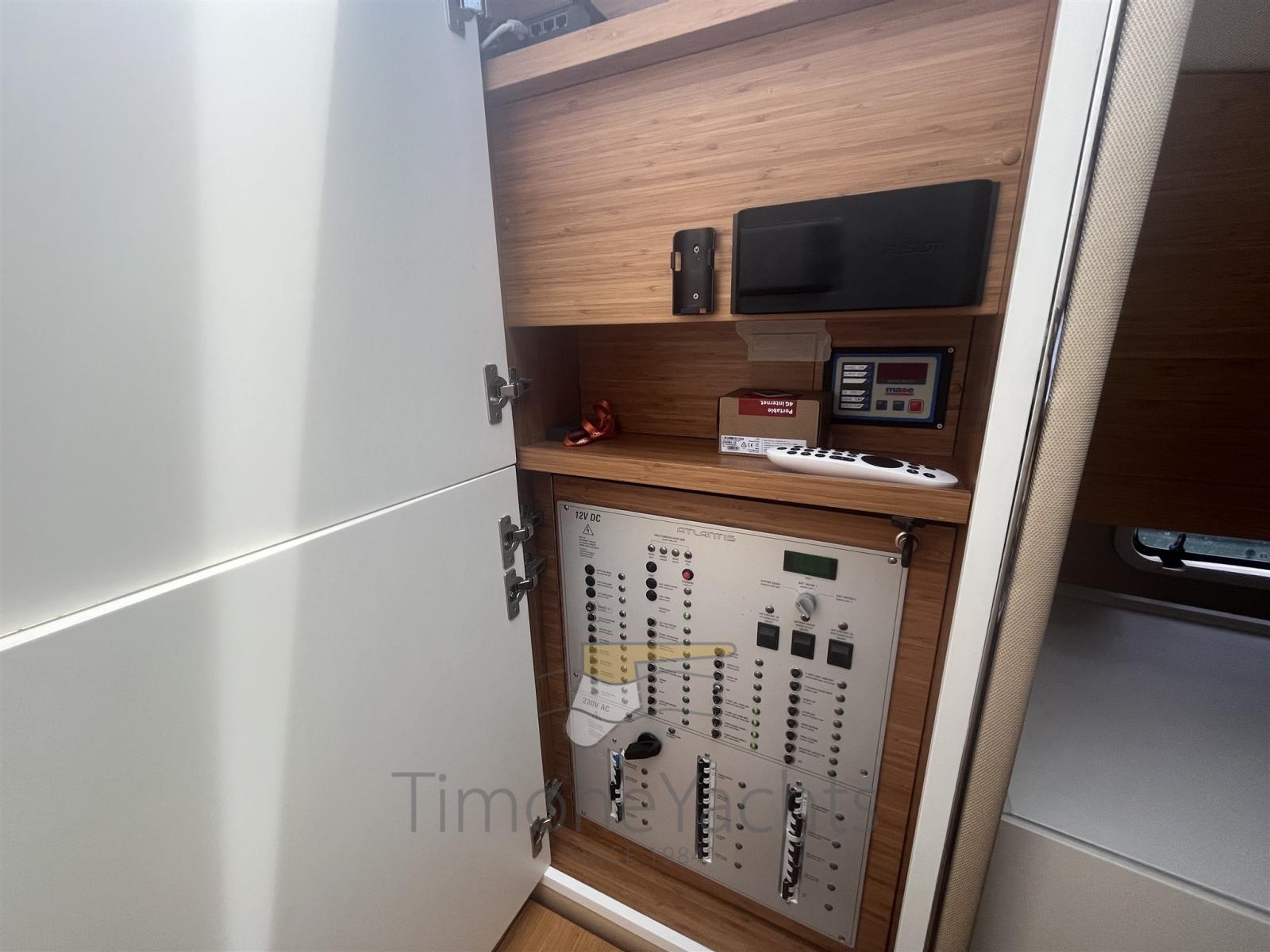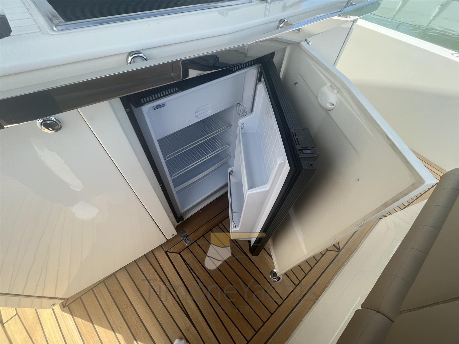 Alarme moteur, Alarme de pompe de cale, Ouverture du compartiment moteur électrique, Eau sous pression, Passavant en teck, Douche de cockpit, Phare de poursuite, Lavabo dans le cockpit, Éclairage de courtoisie, Spots sous-marins, Passerelle, Plateforme arrière (in teak massello 8 mm), Pompe de cale automatique, Cockpit en teck (in teak massello 8 mm), Prise de quai, Guindeau électrique, Echelle de bain, table de cockpit.