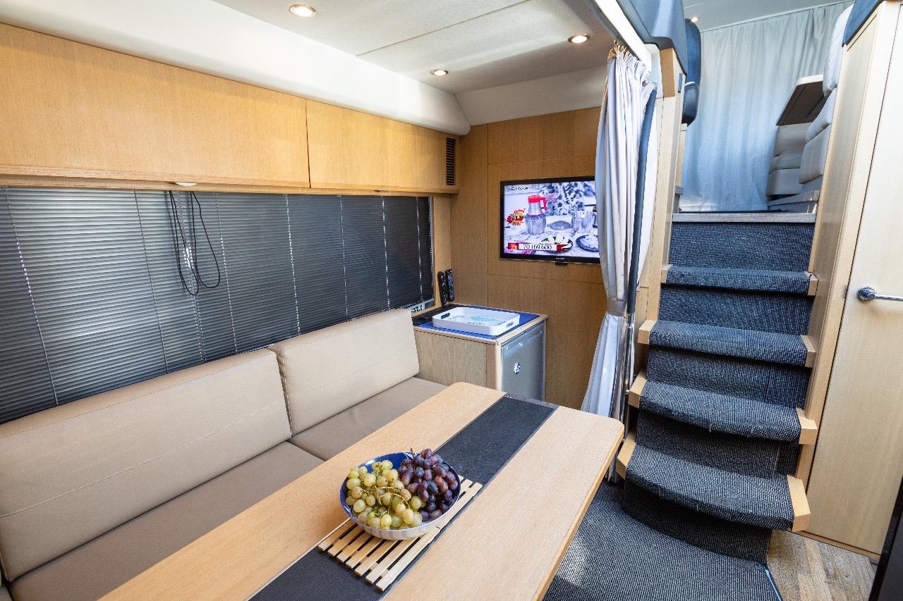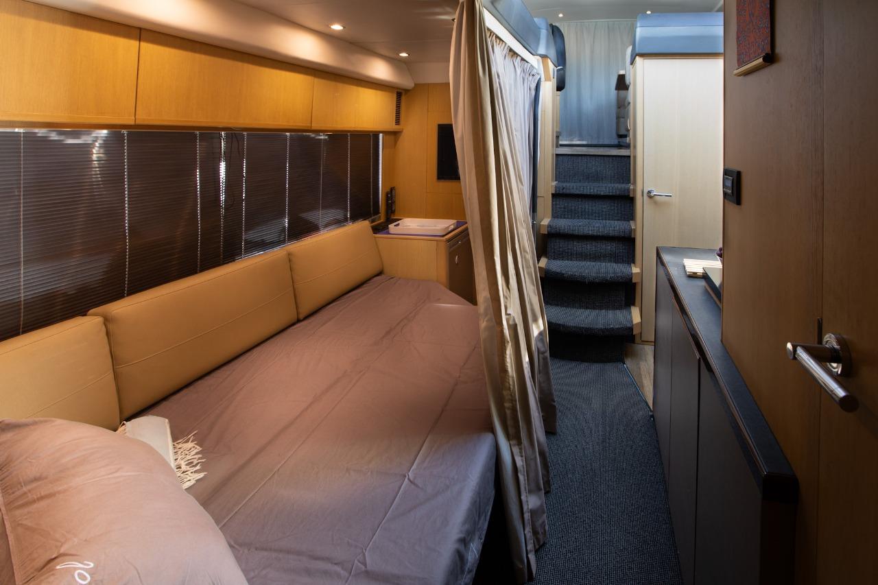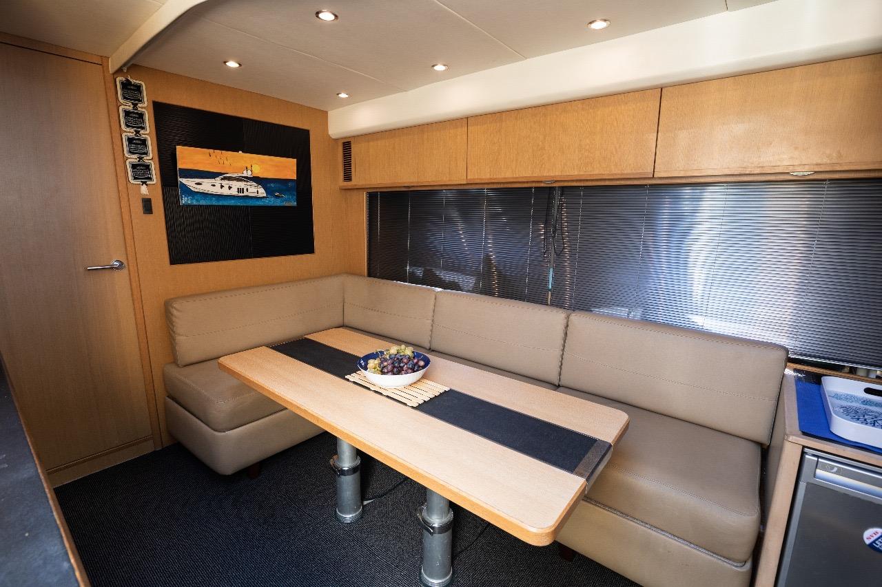 À l’intérieur, on retrouve tout le savoir-faire Princess avec des finitions luxueuses, des boiseries élégantes et une atmosphère chaleureuse. Le salon inférieur, situé face à la cuisine entièrement équipée, peut servir de coin détente ou être transformé pour accueillir des invités occasionnels.