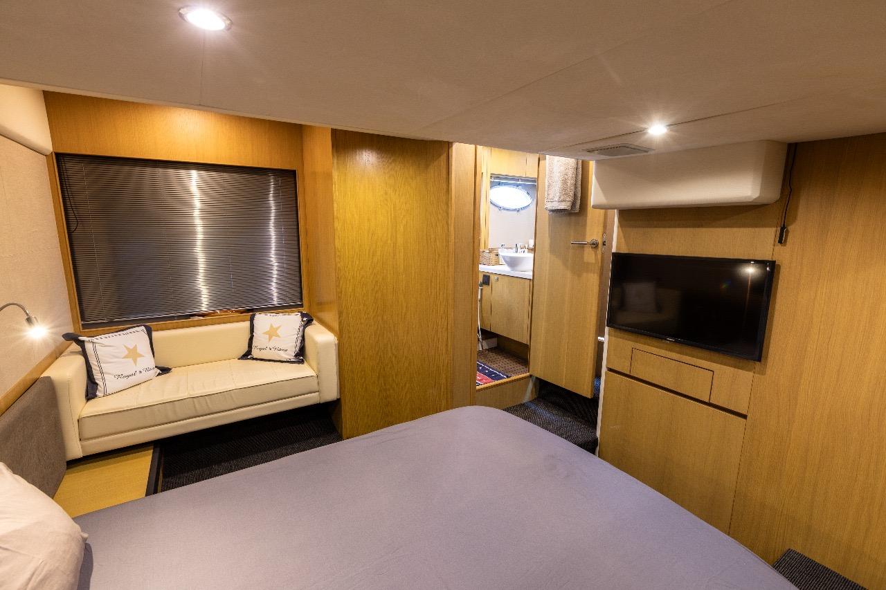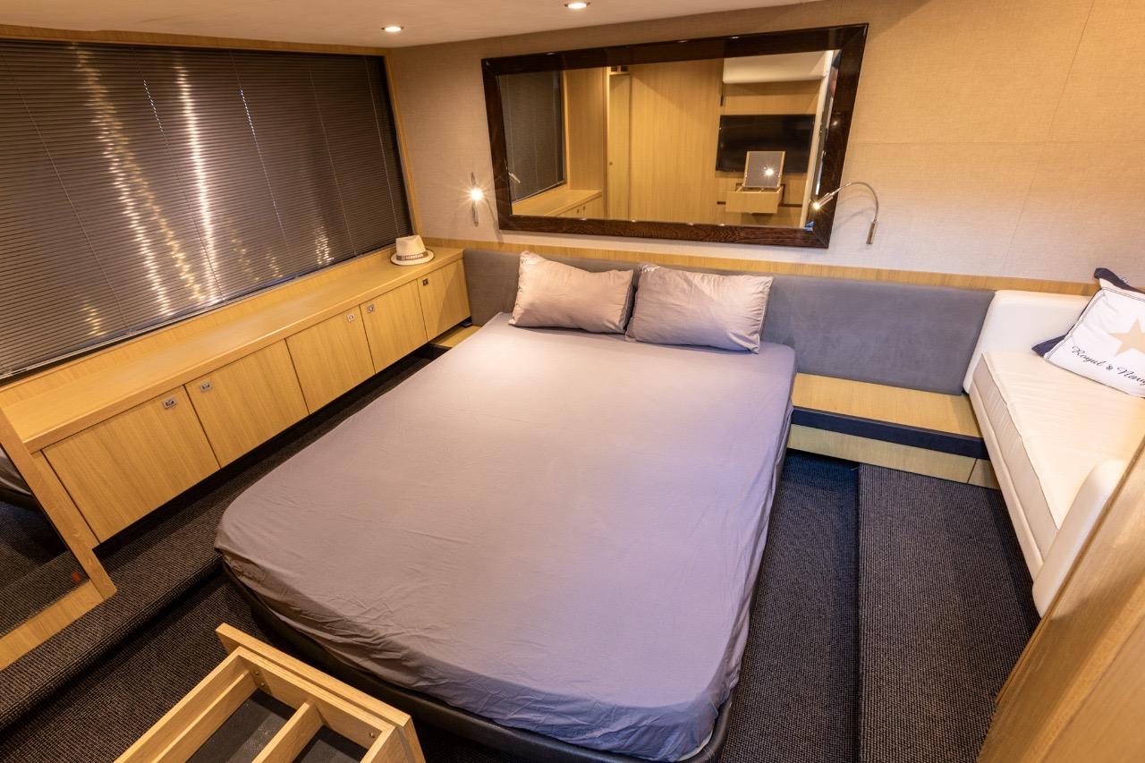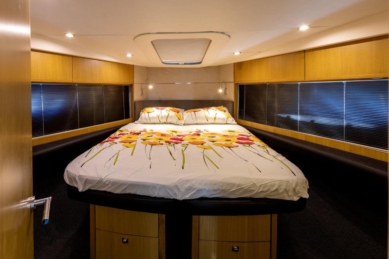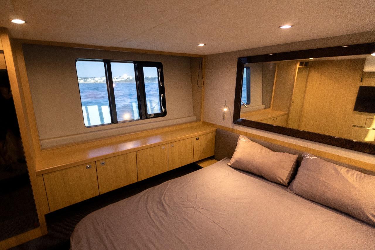 La partie nuit offre un confort digne de yachts bien plus grands, avec notamment une spacieuse cabine armateur en pleine largeur, baignée de lumière grâce à de grandes fenêtres latérales, dotée de sa salle de bain privative. La cabine VIP avant bénéficie également de sa propre salle de bain avec douche séparée.