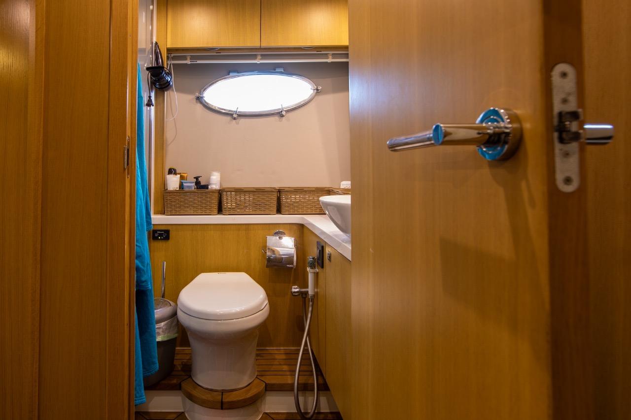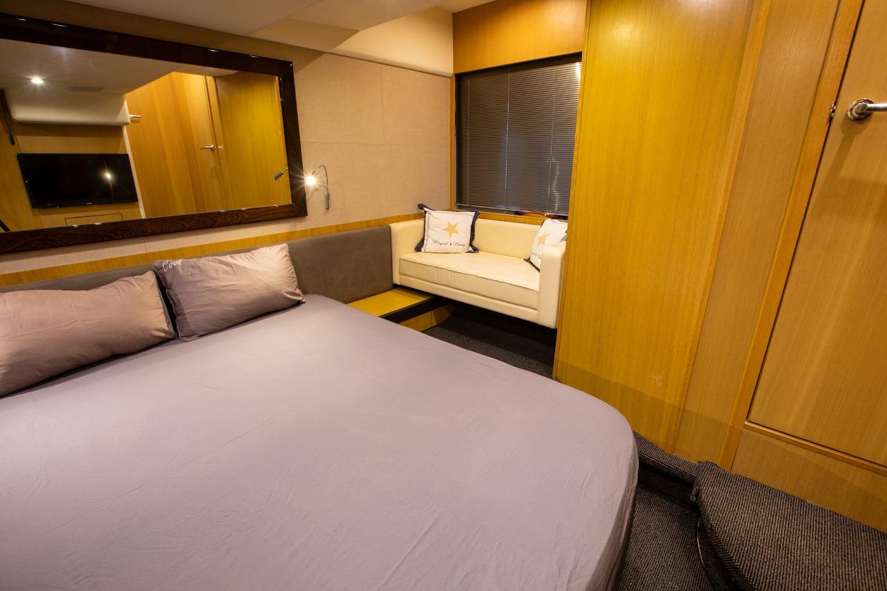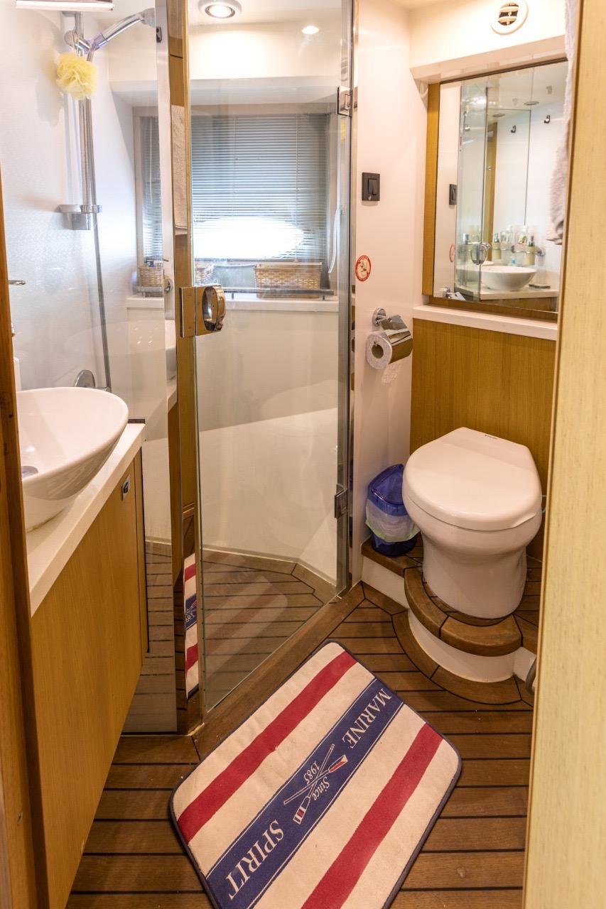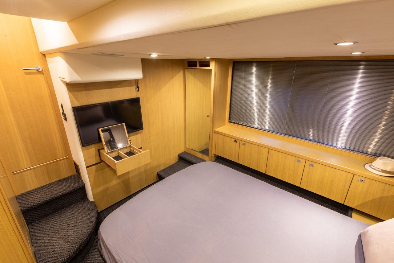 La partie nuit offre un confort digne de yachts bien plus grands, avec notamment une spacieuse cabine armateur en pleine largeur, baignée de lumière grâce à de grandes fenêtres latérales, dotée de sa salle de bain privative. La cabine VIP avant bénéficie également de sa propre salle de bain avec douche séparée.