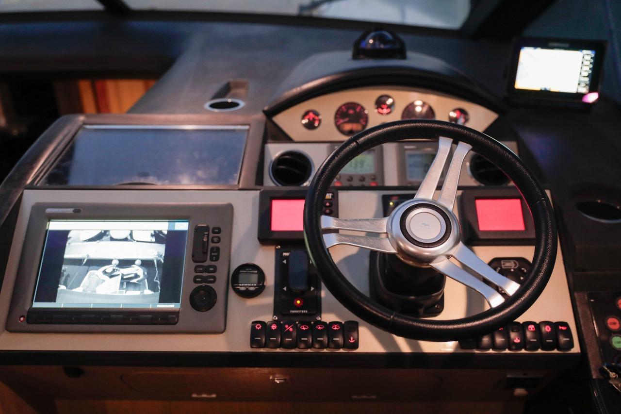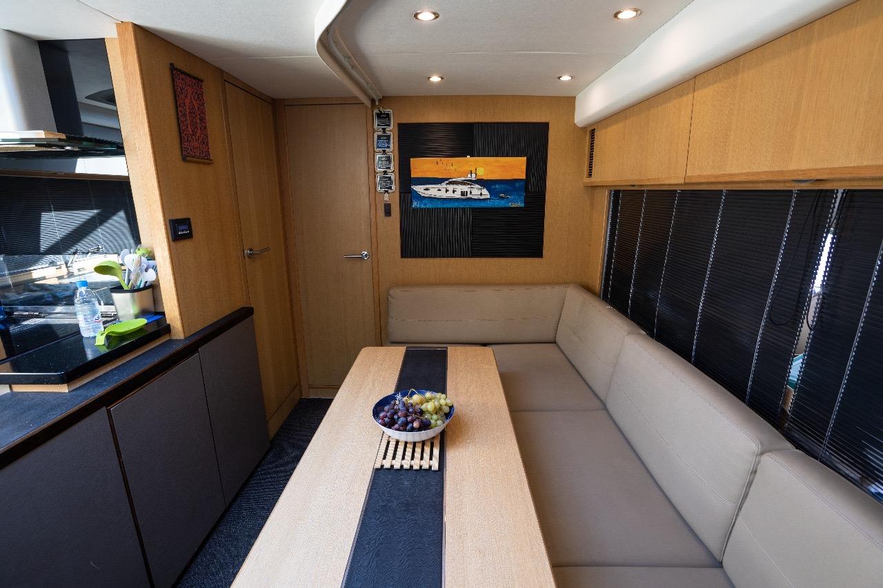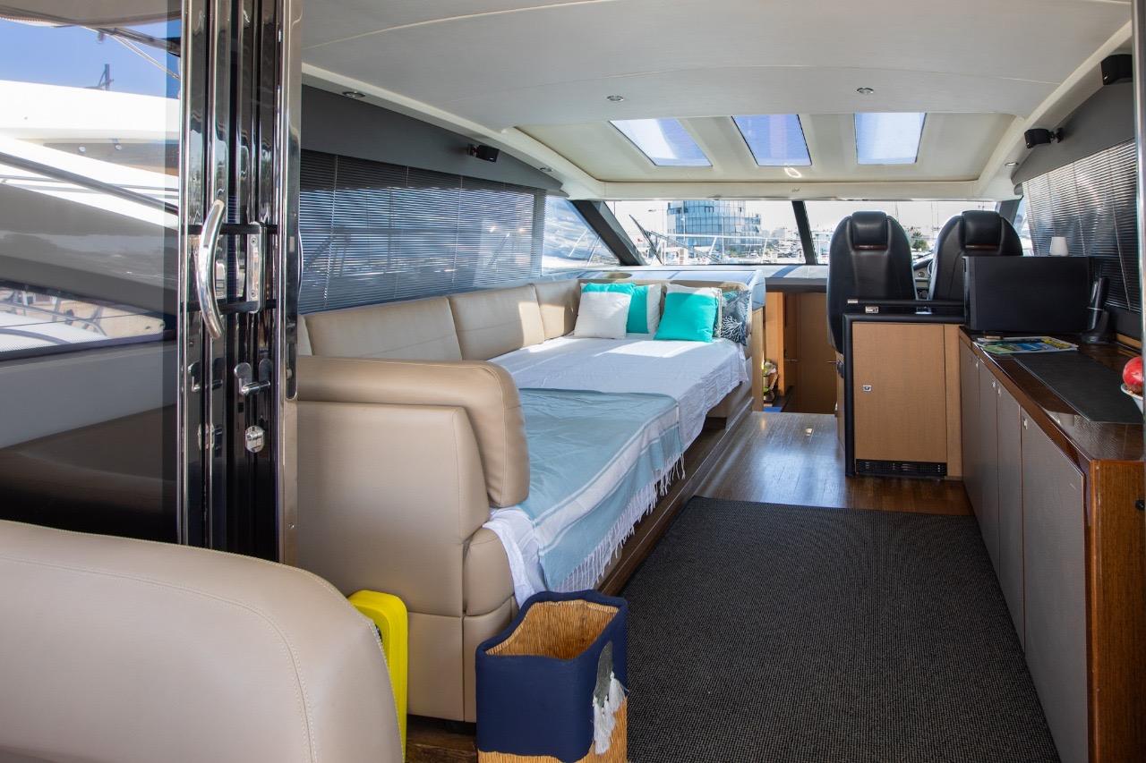 L’un des grands atouts de ce modèle est son salon de pont entièrement fermé, qui permet de profiter d’un espace intérieur plus vaste tout en conservant les sensations d’un yacht sportif. Les portes vitrées coulissantes et le toit ouvrant électrique offrent une belle modularité : ouverture totale sur l’extérieur ou protection confortable selon la météo et les envies.
