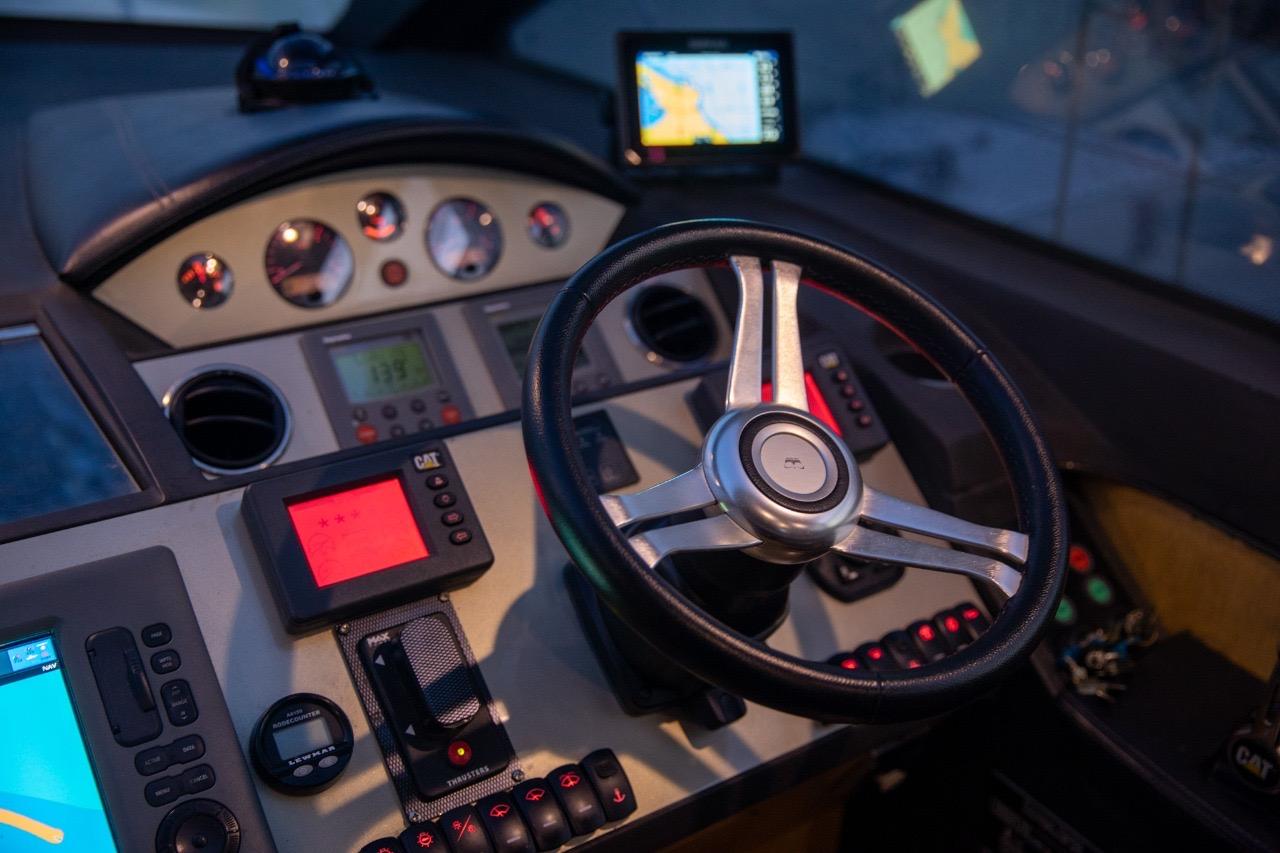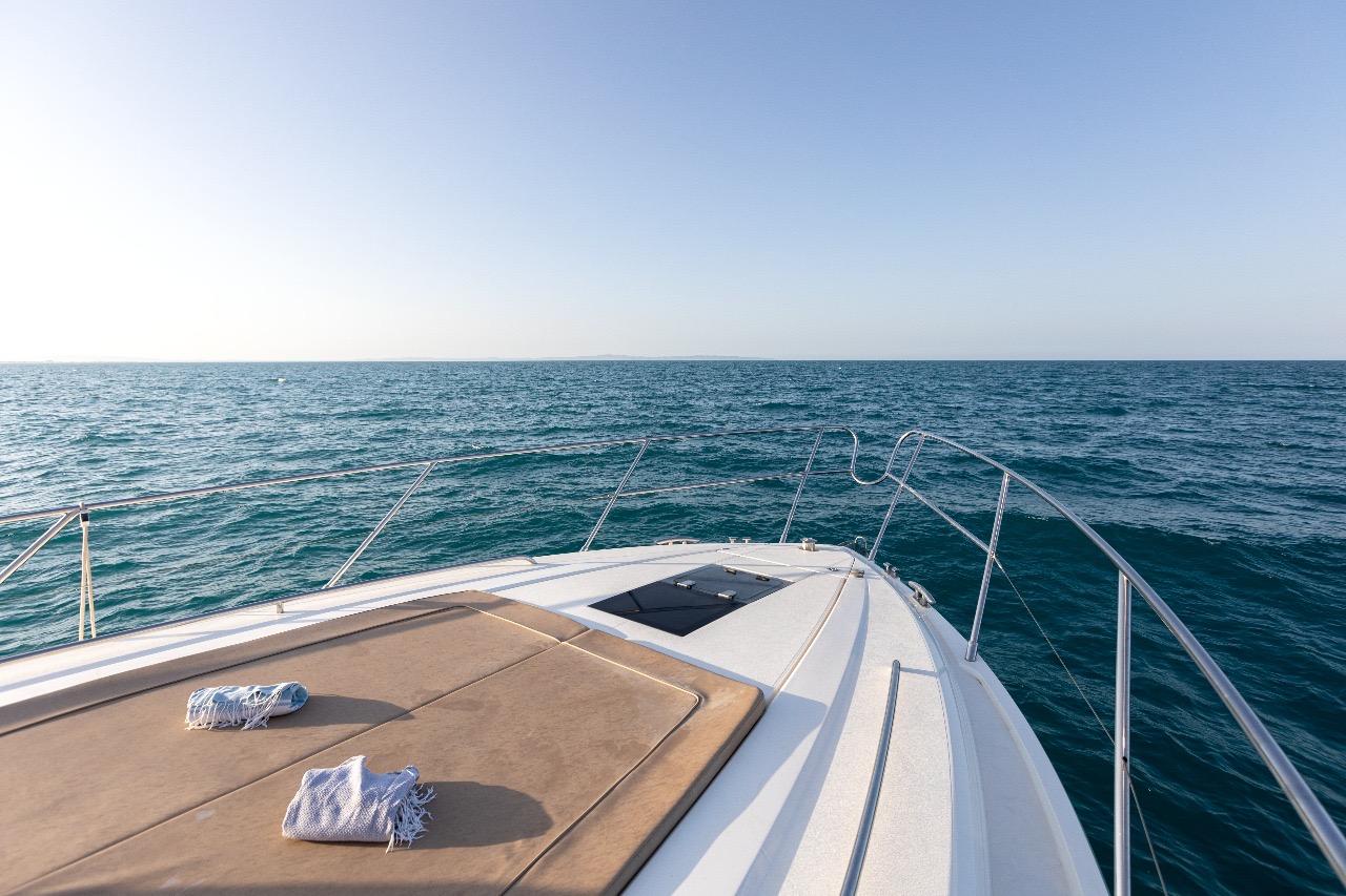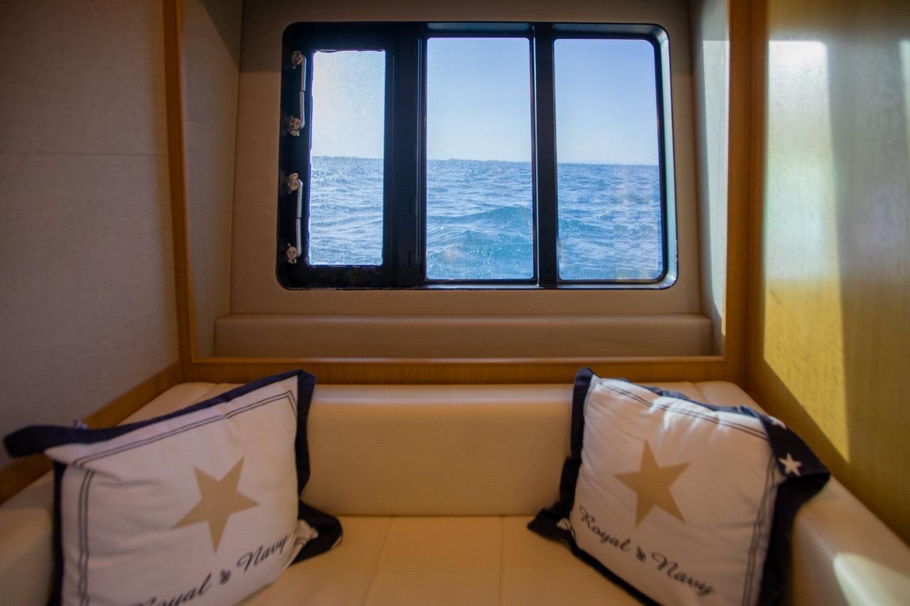 L’un des grands atouts de ce modèle est son salon de pont entièrement fermé, qui permet de profiter d’un espace intérieur plus vaste tout en conservant les sensations d’un yacht sportif. Les portes vitrées coulissantes et le toit ouvrant électrique offrent une belle modularité : ouverture totale sur l’extérieur ou protection confortable selon la météo et les envies.