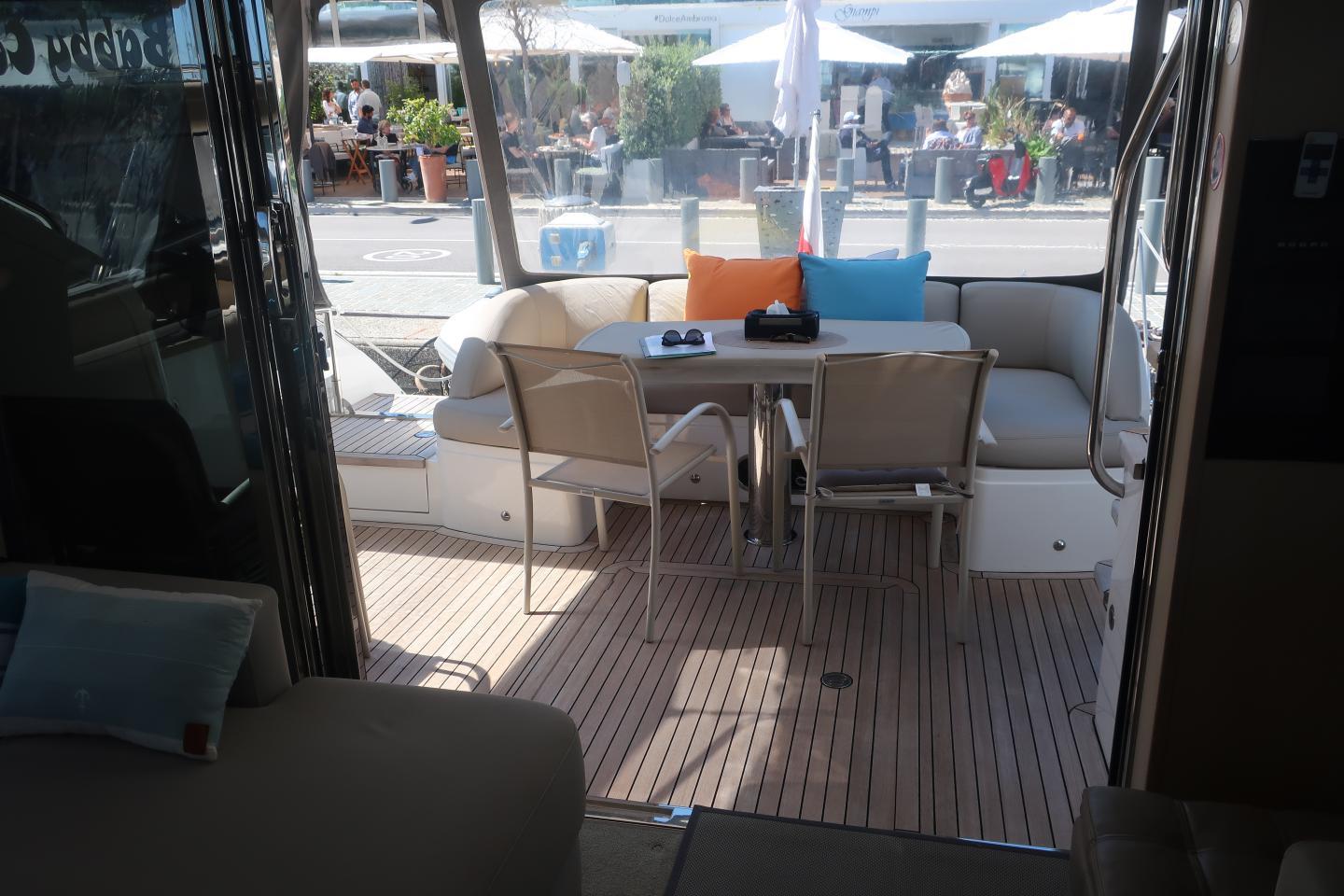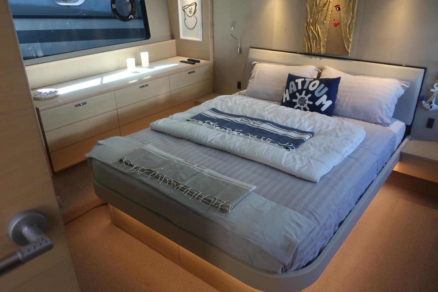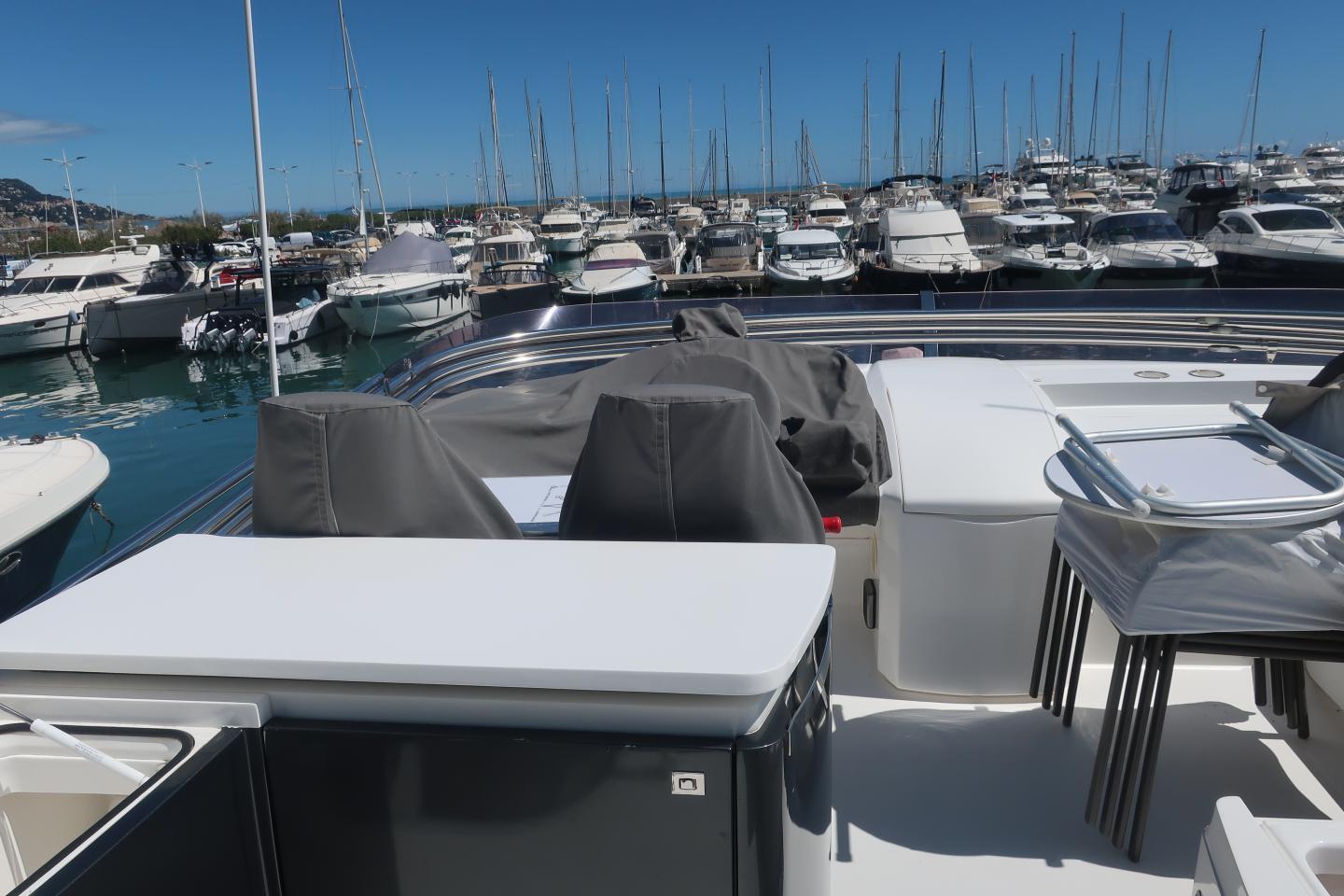 Équipements : climatisation, déssalinisateur, plateforme de bain hydraulique, passerelle hydraulique, stabilisateurs, propulseurs d’étrave et de poupe, Fly bridge avec bain de soleil, Wetar et barbecue