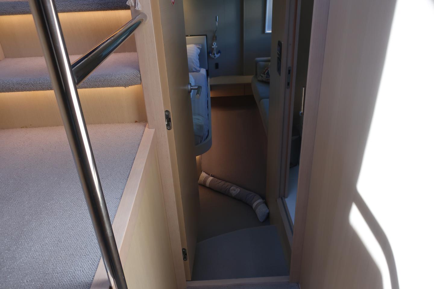 Une cabine de marin à l’arrière avec lit simple et une salle d’eau avec douche, lavabo et WC électrique