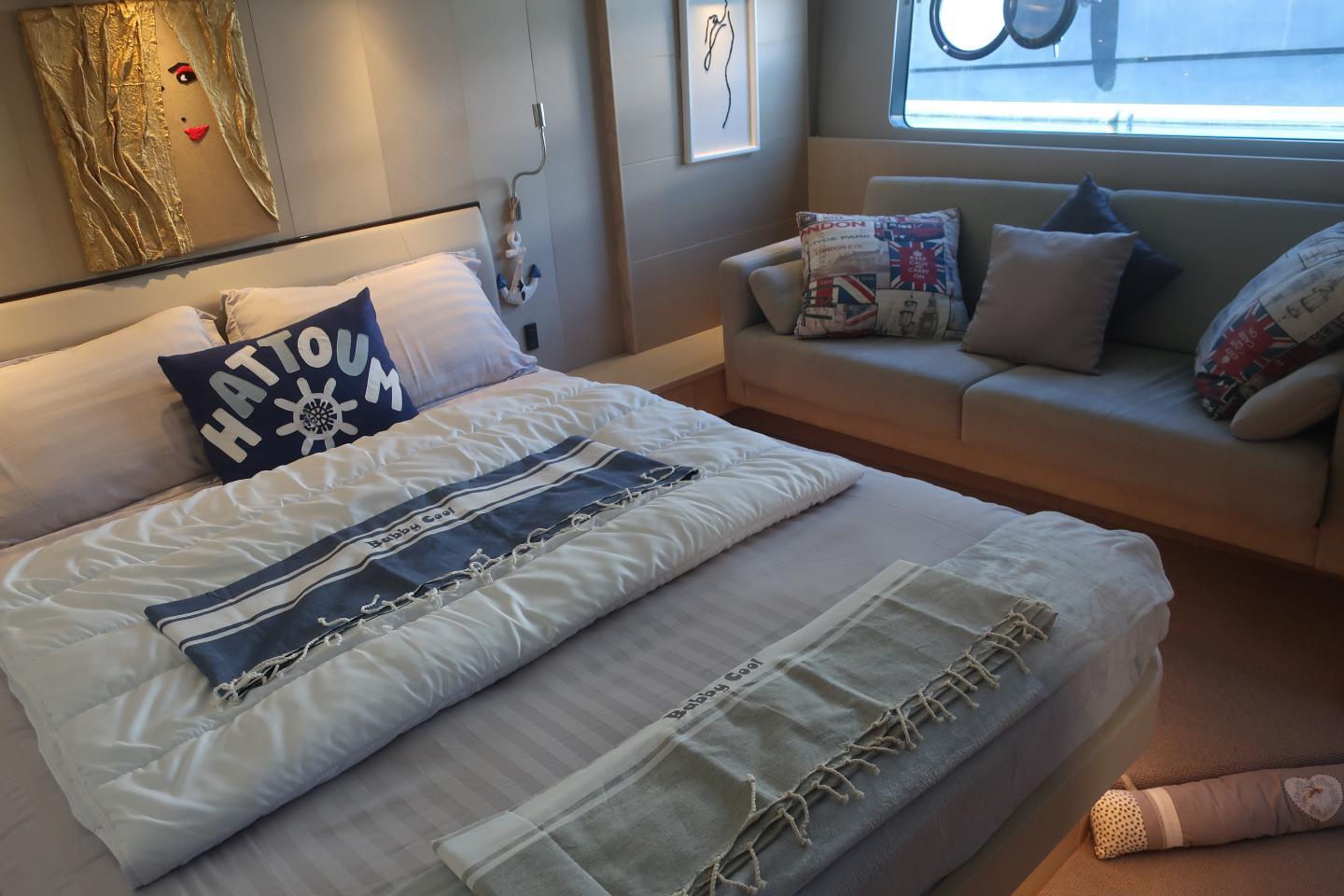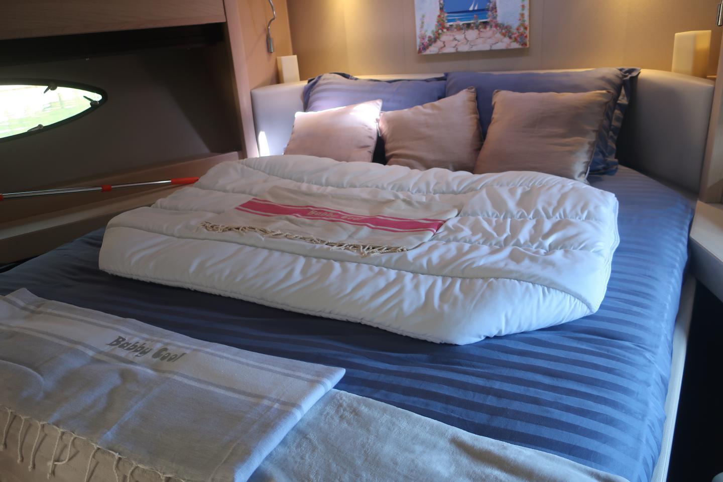 Au centre une grande suite propriétaire avec grand lit double canapé et une TV grand écran, une salle d’eau privative avec douche, lavabo et WC électrique avec holding tank