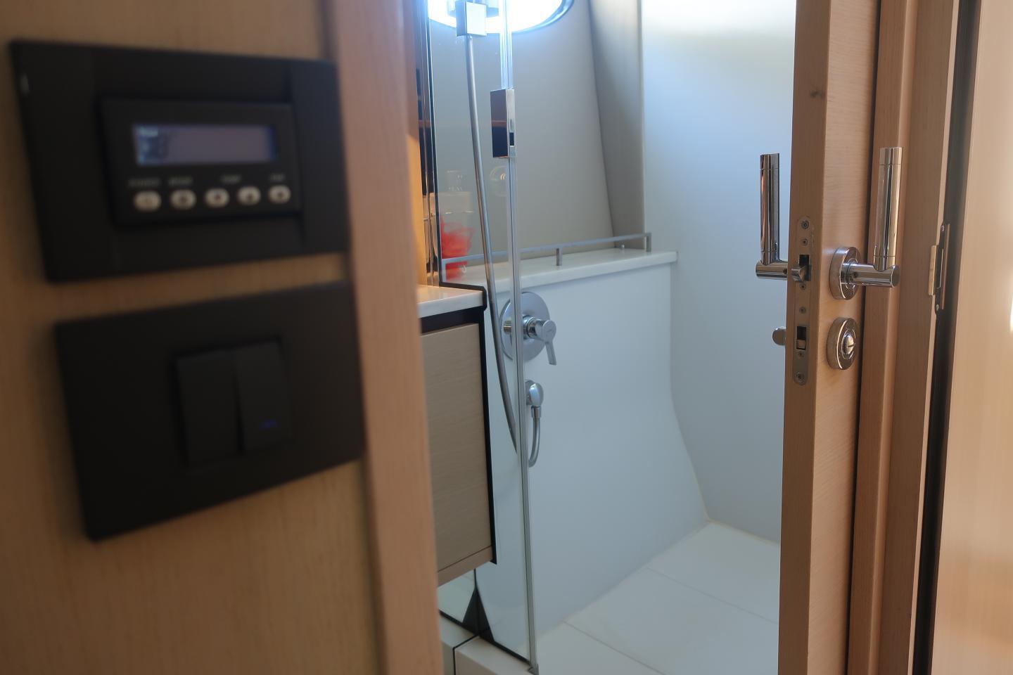 Une salle d’eau à bâbord avec douche, lavabo et WC électrique avec holding tank