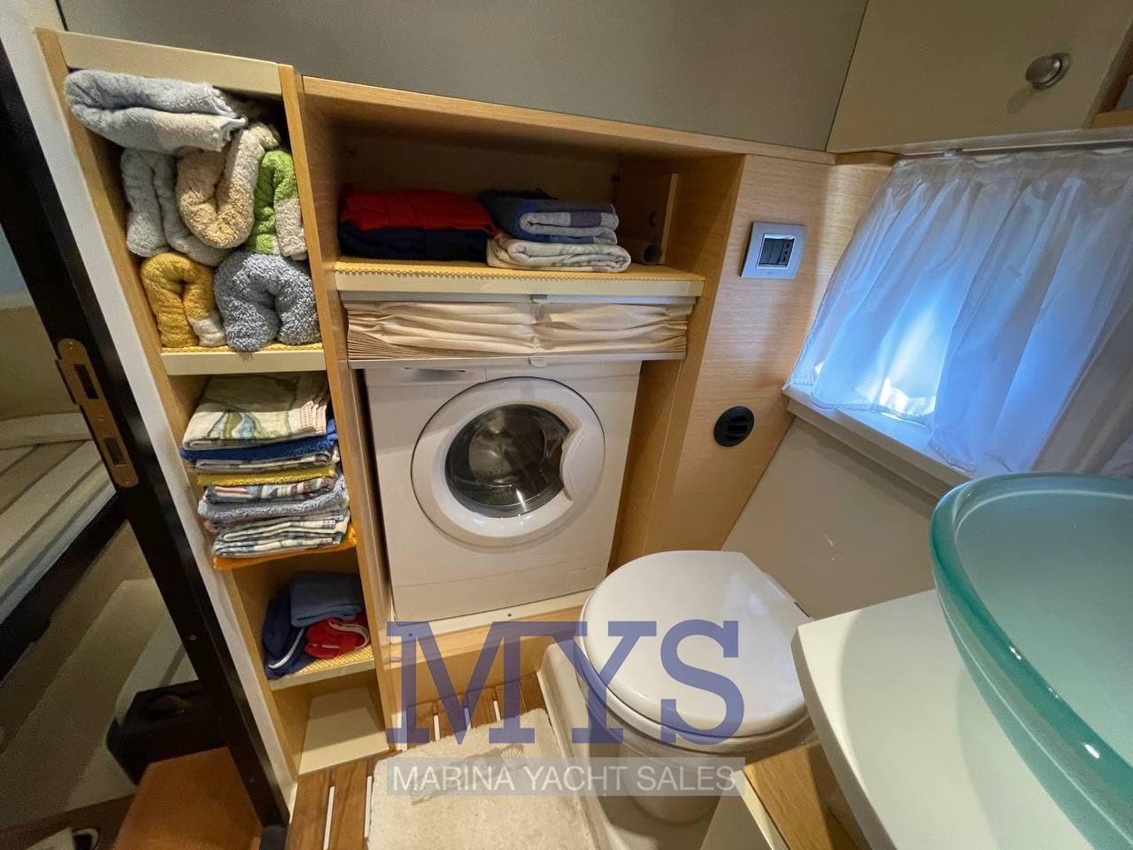 Deuxième salle de bain avec entrée à la fois par la cabine arrière et le couloir avec douche, lavabo, toilettes électriques et machine à laver
