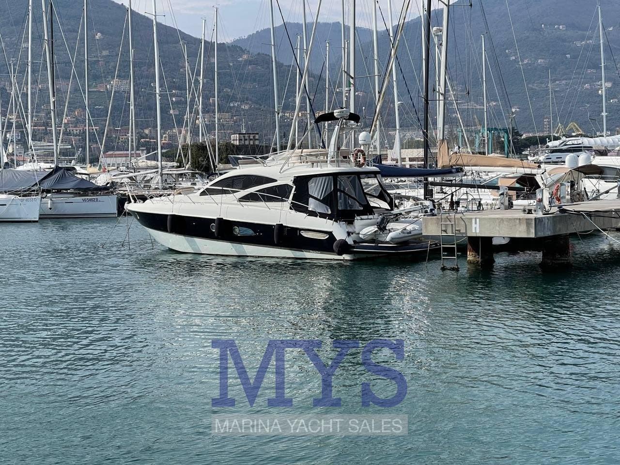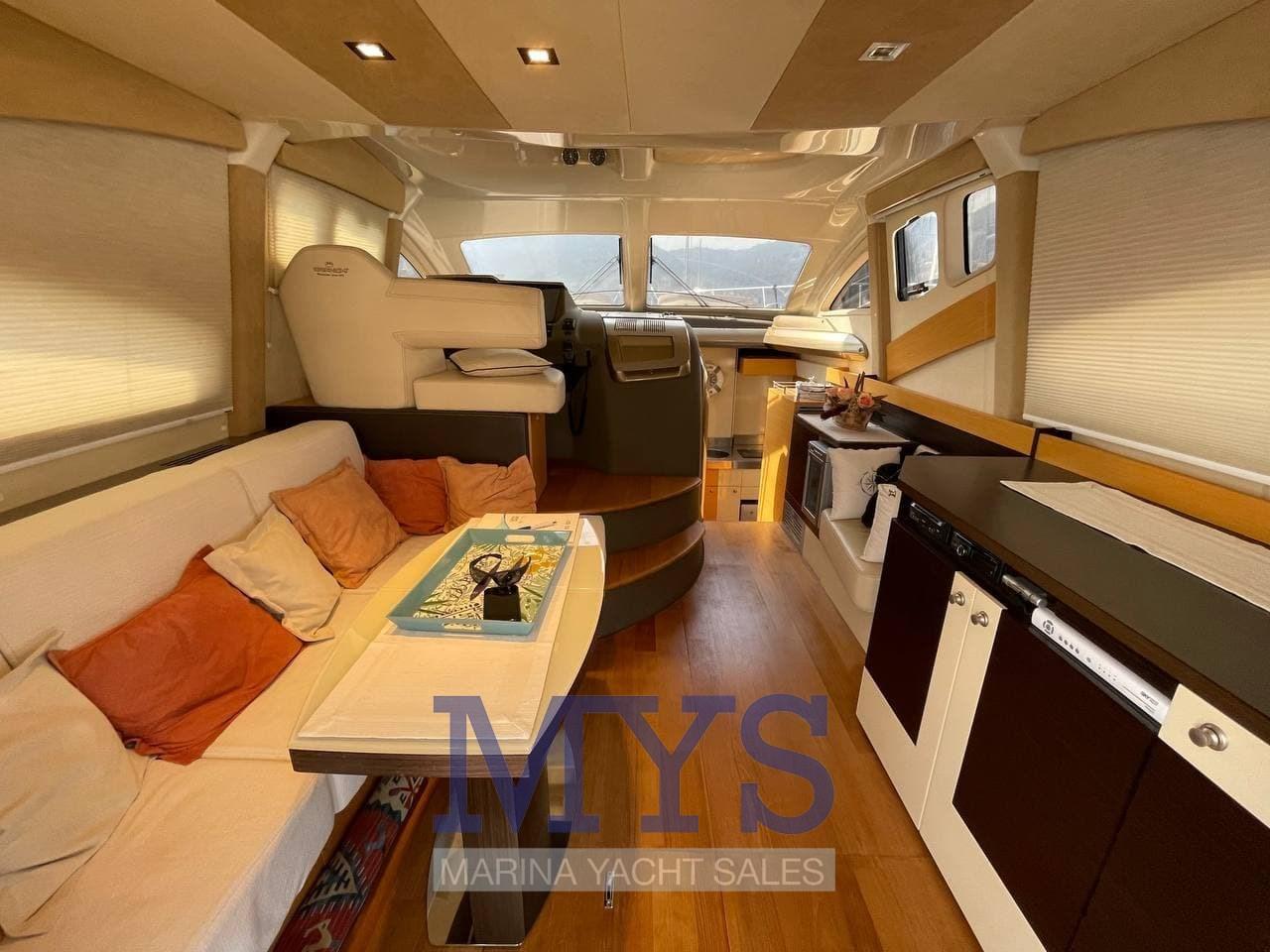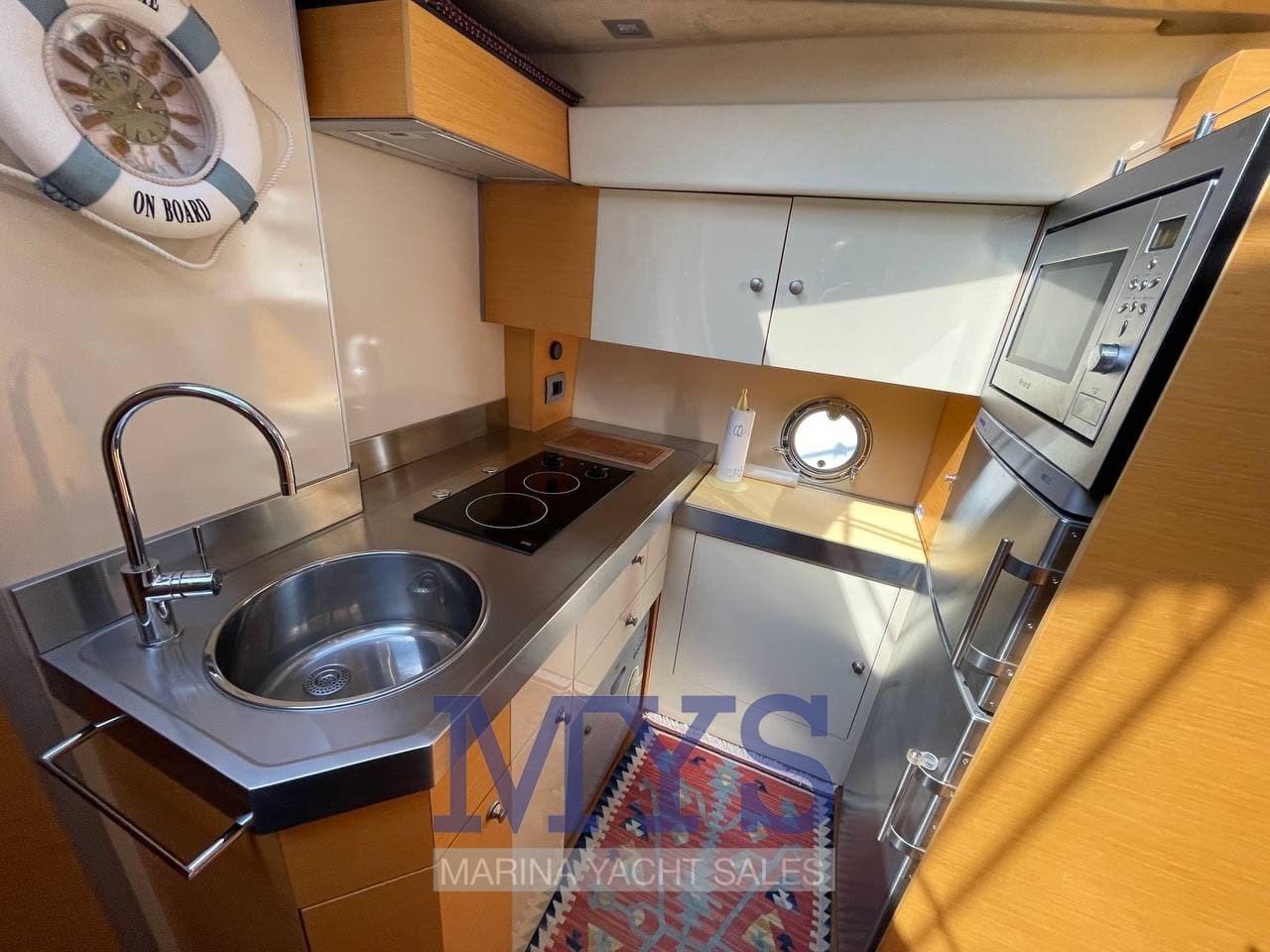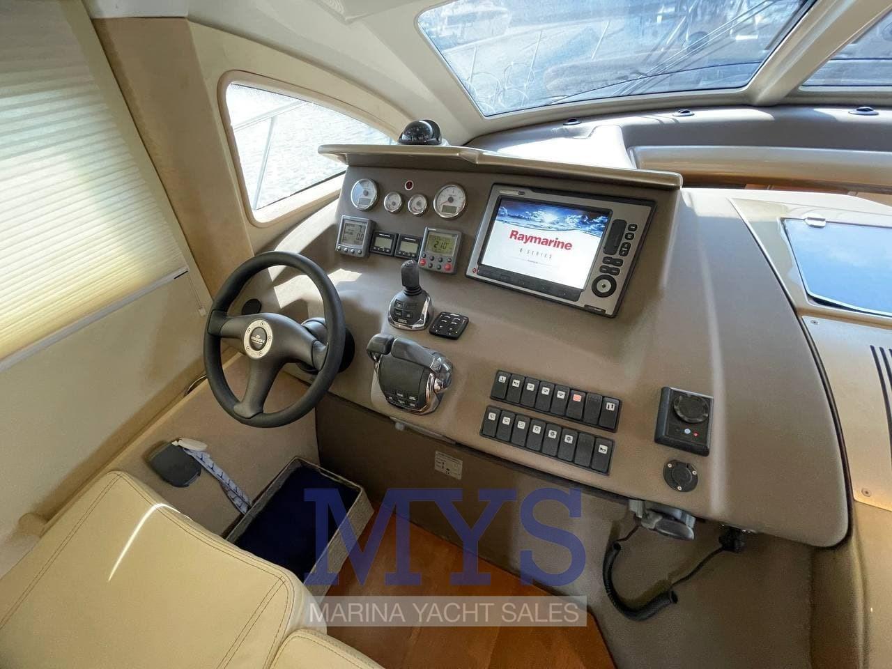 Alarme moteur, Alarme de pompe de cale, Eau sous pression, Couleur spéciale (Fascia e plancetta nere), Douche de cockpit, Flaps hydrauliques, Lavage de chaine, Éclairage de courtoisie, Passerelle (idraulica telescopica Besenzoni), Plateforme arrière (fissa in teak), Pompe de cale automatique, Pompe de cale manuelle, Porte latérale, Cockpit en teck, Prise de quai, Connexion eau sous pression à quai, Répétiteur électronique, Guindeau électrique, Echelle de bain, table de cockpit (nel fly), Corne, Winch électrique avant.