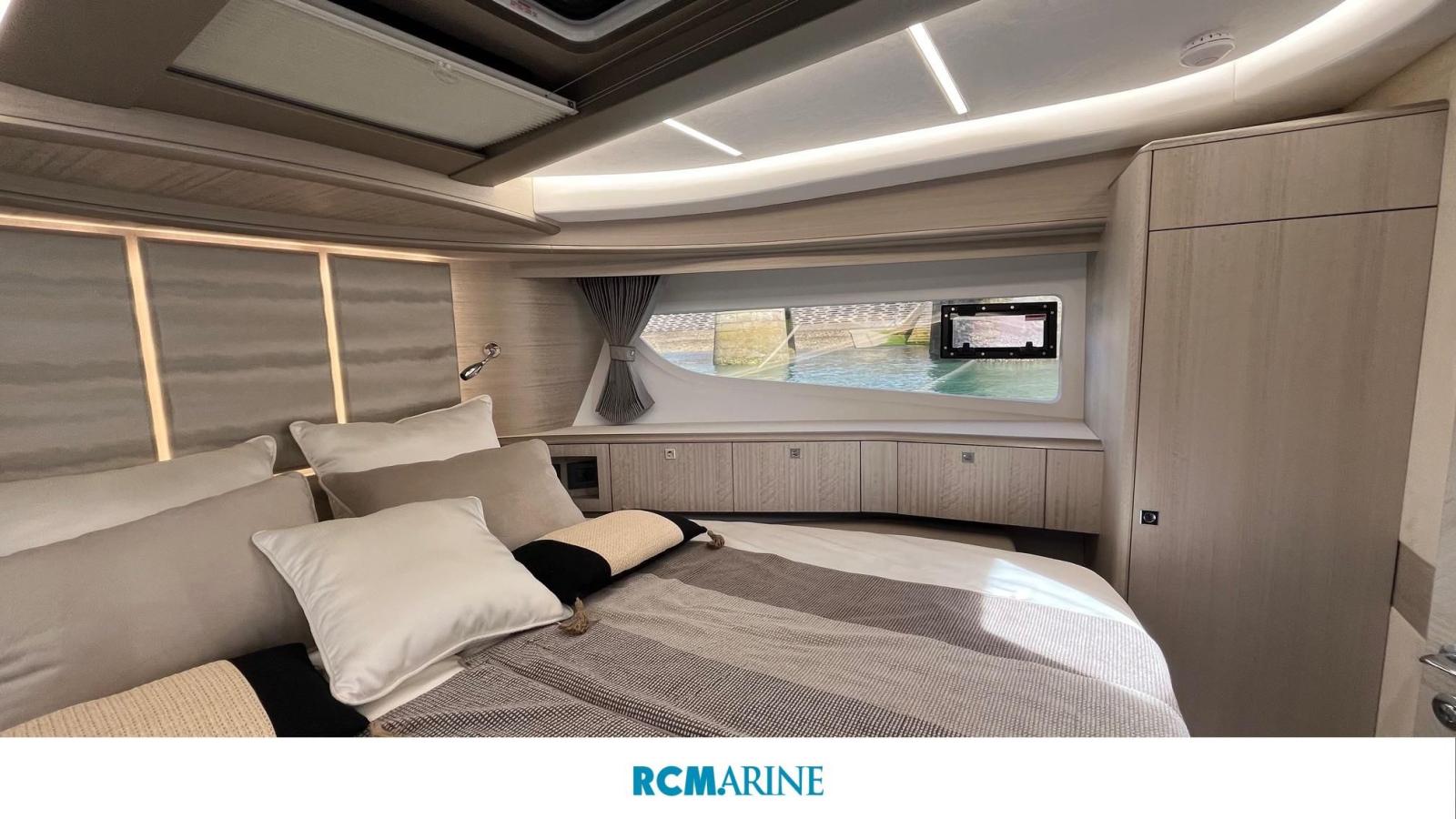 Le cockpit arrière offre un espace fonctionnel et bien pensé, avec le canapé et la table convertibles en bain de soleil. Le cockpit avant est un espace de loisirs, avec un grand matelas de bronzage. La version standard du yacht est propulsée par deux moteurs Volvo Penta.