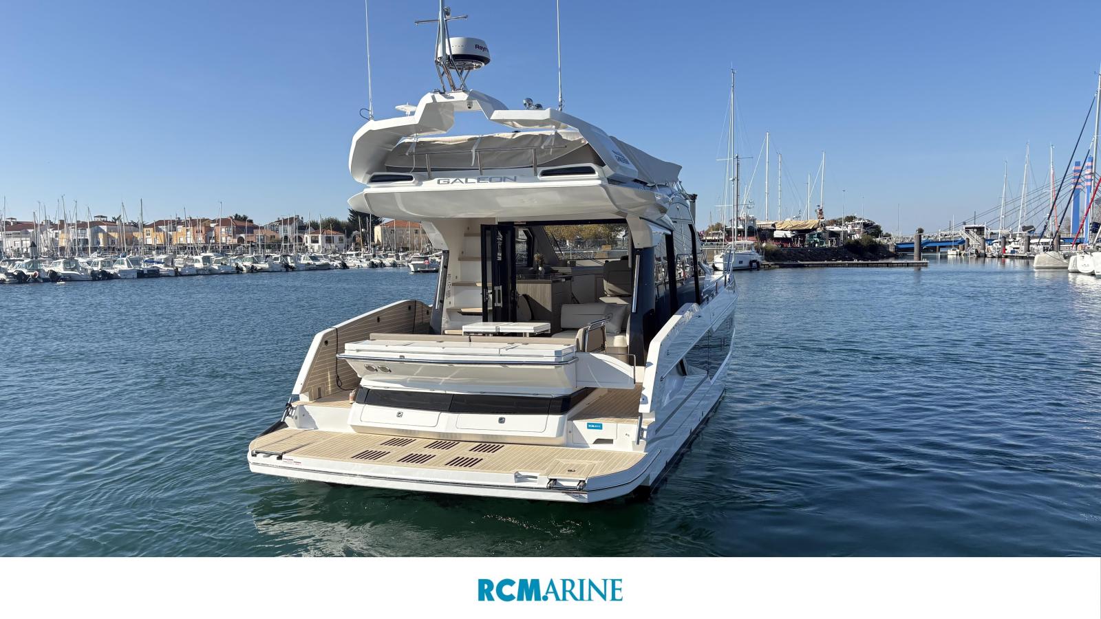 La forme dynamique du yacht est une extension claire du design caractéristique de Galeon, avec de grandes fenêtres fusionnant avec la forme de la coque sous des angles aigus. Le pont supérieur est accessible par un escalier confortable. Le flybridge, centre de divertissement du yacht, met un minibar et un poste de pilotage à la disposition des invités et de l’équipage. Il est également équipé d’une table et d’un canapé qui peuvent être facilement convertis en bain de soleil.