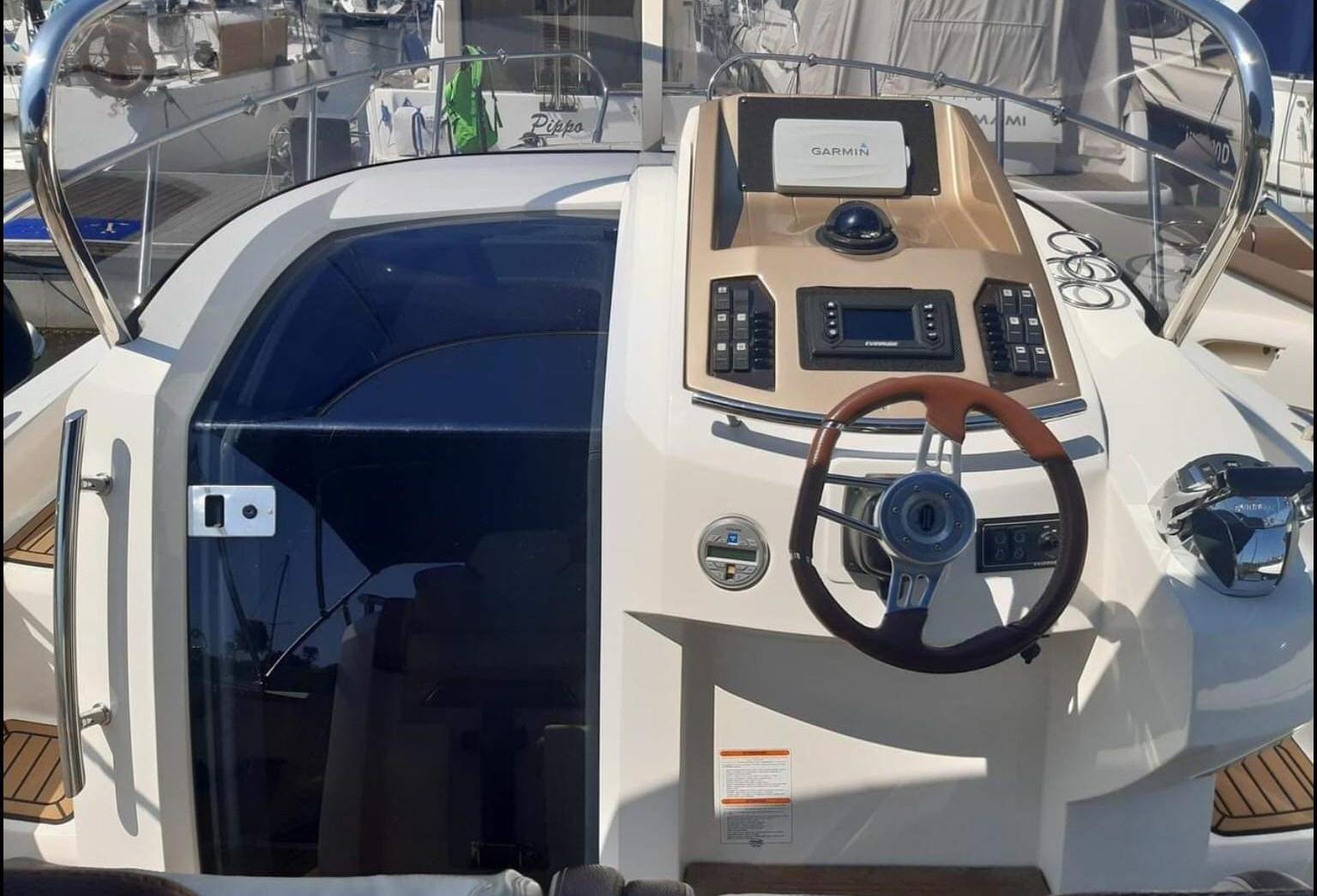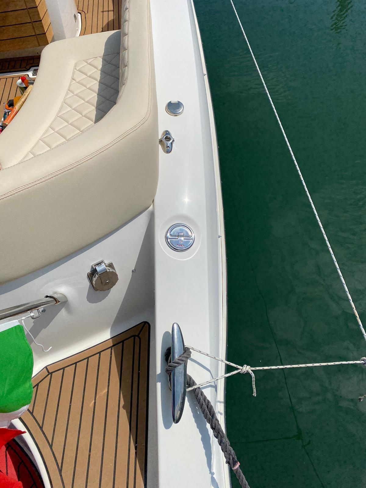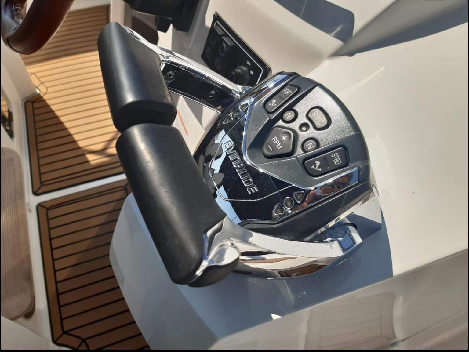 Alarme moteur, 3 Batteries, Passavant en teck, Couleur spéciale (blu verniciatura 2023), Douche de cockpit, Flaps hydrauliques, Indicateurs de flaps, Lavabo dans le cockpit, Passerelle, Plateforme arrière, Pompe de cale manuelle, Porte latérale, Cockpit en teck, Prise de quai, Connexion eau sous pression à quai, Guindeau électrique, Echelle de bain, table de cockpit, Annexe, Corne.