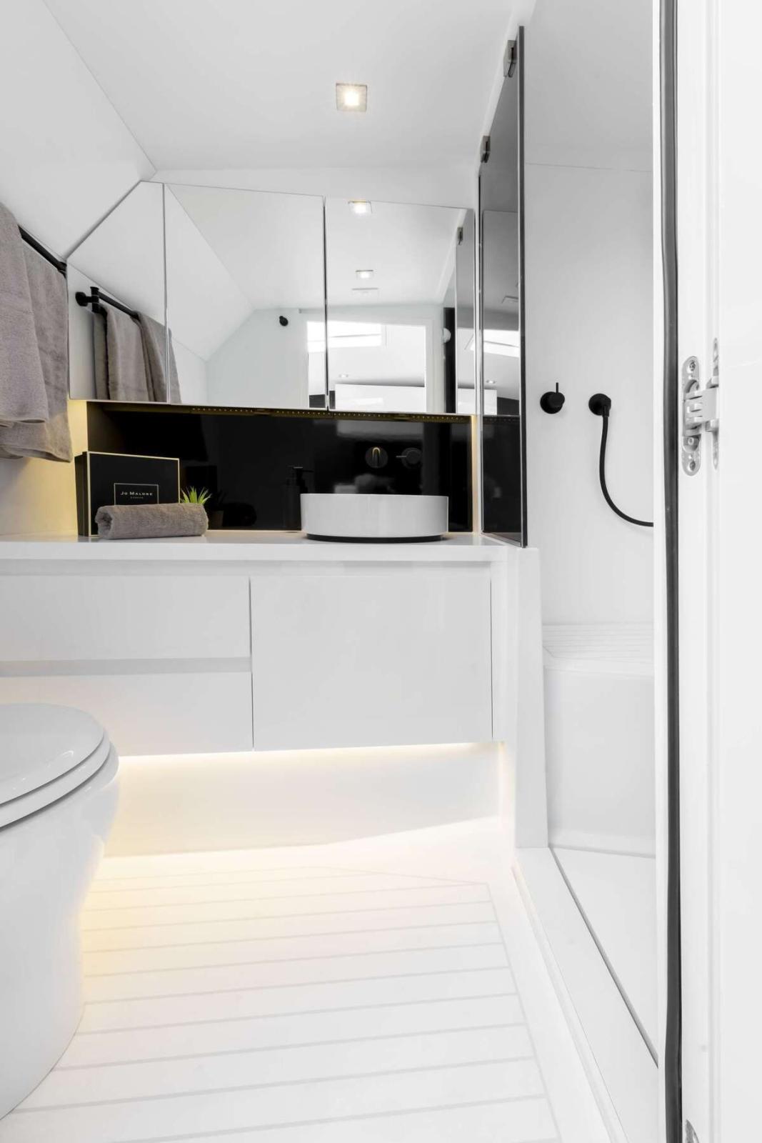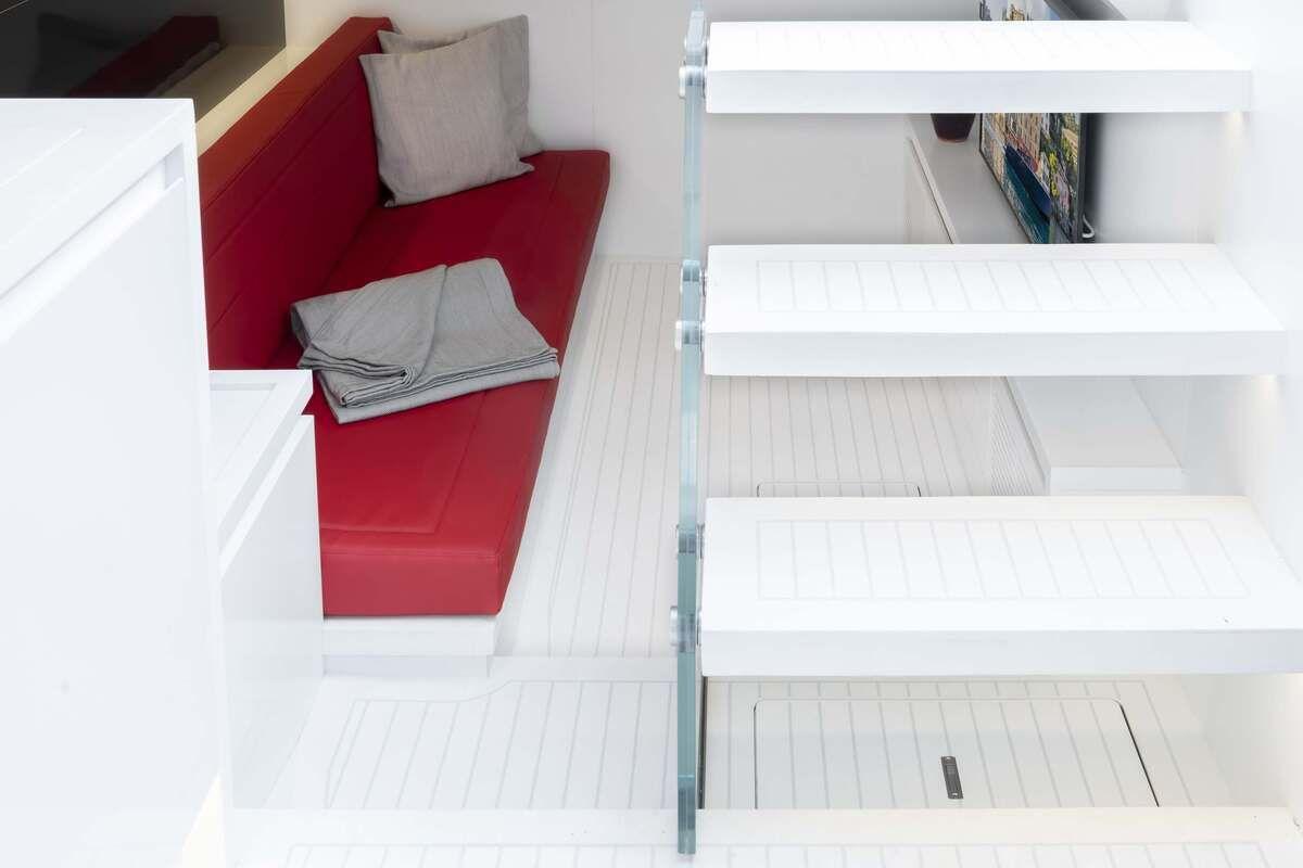 Les espaces intérieurs ont été conçus dans l'intention de créer un design en plein air avec un sens du luxe contemporain. Le blanc apporte une touche d'élégance supplémentaire pour évoquer un sentiment d'harmonie, grâce aux lignes nettes et raffinées du mobilier. Avec le VanDutch 48, les invités navigueront en haute mer en se sentant toujours chez eux.