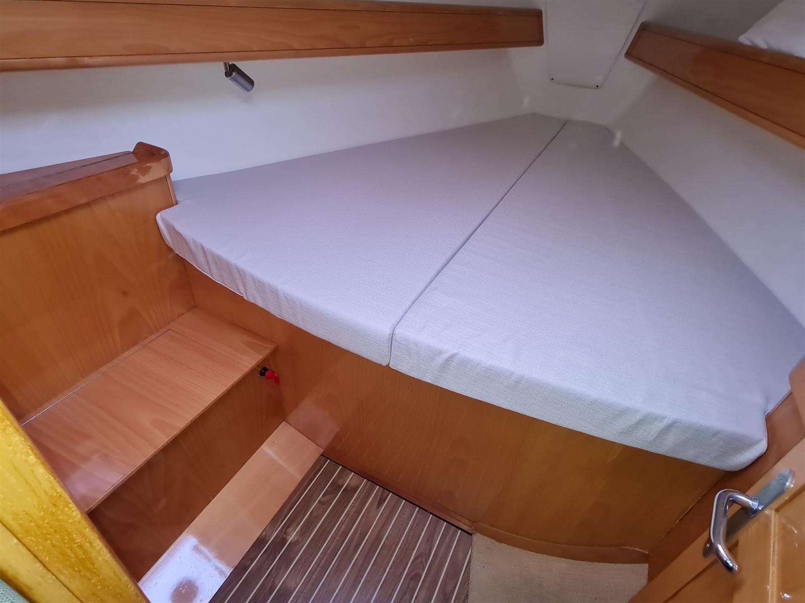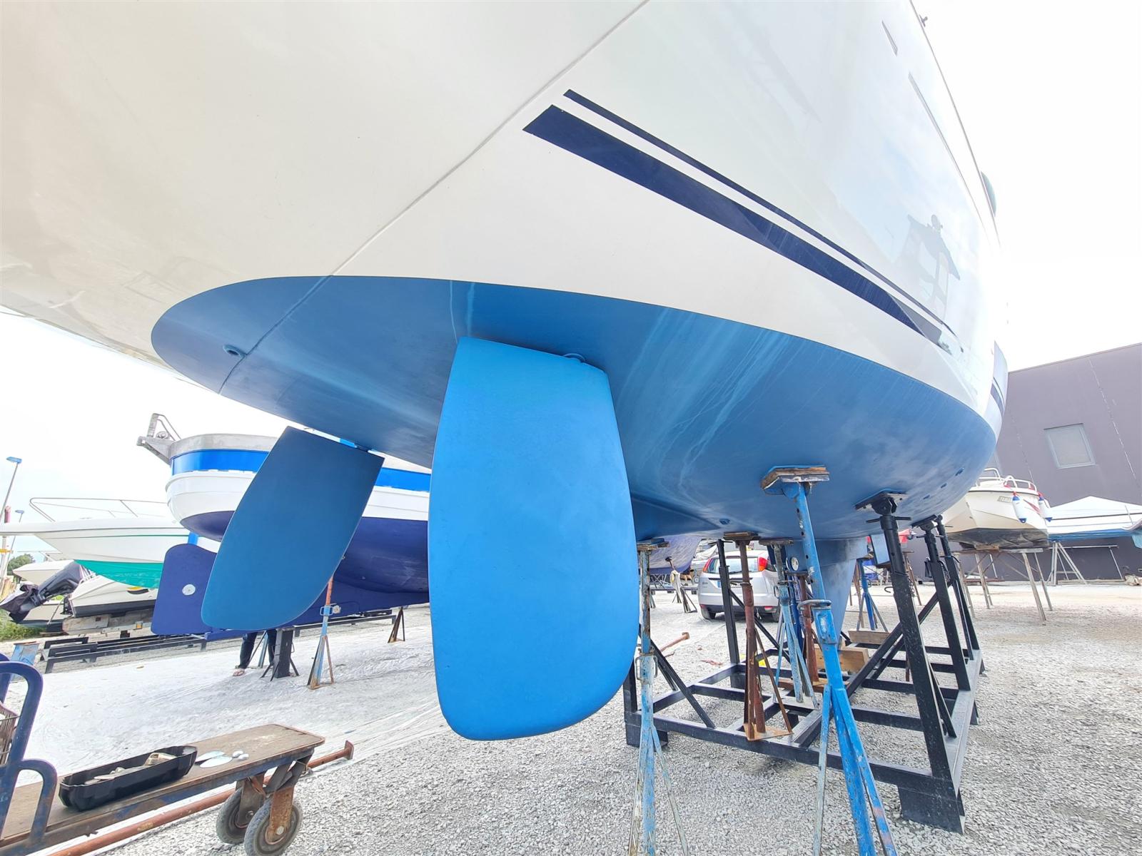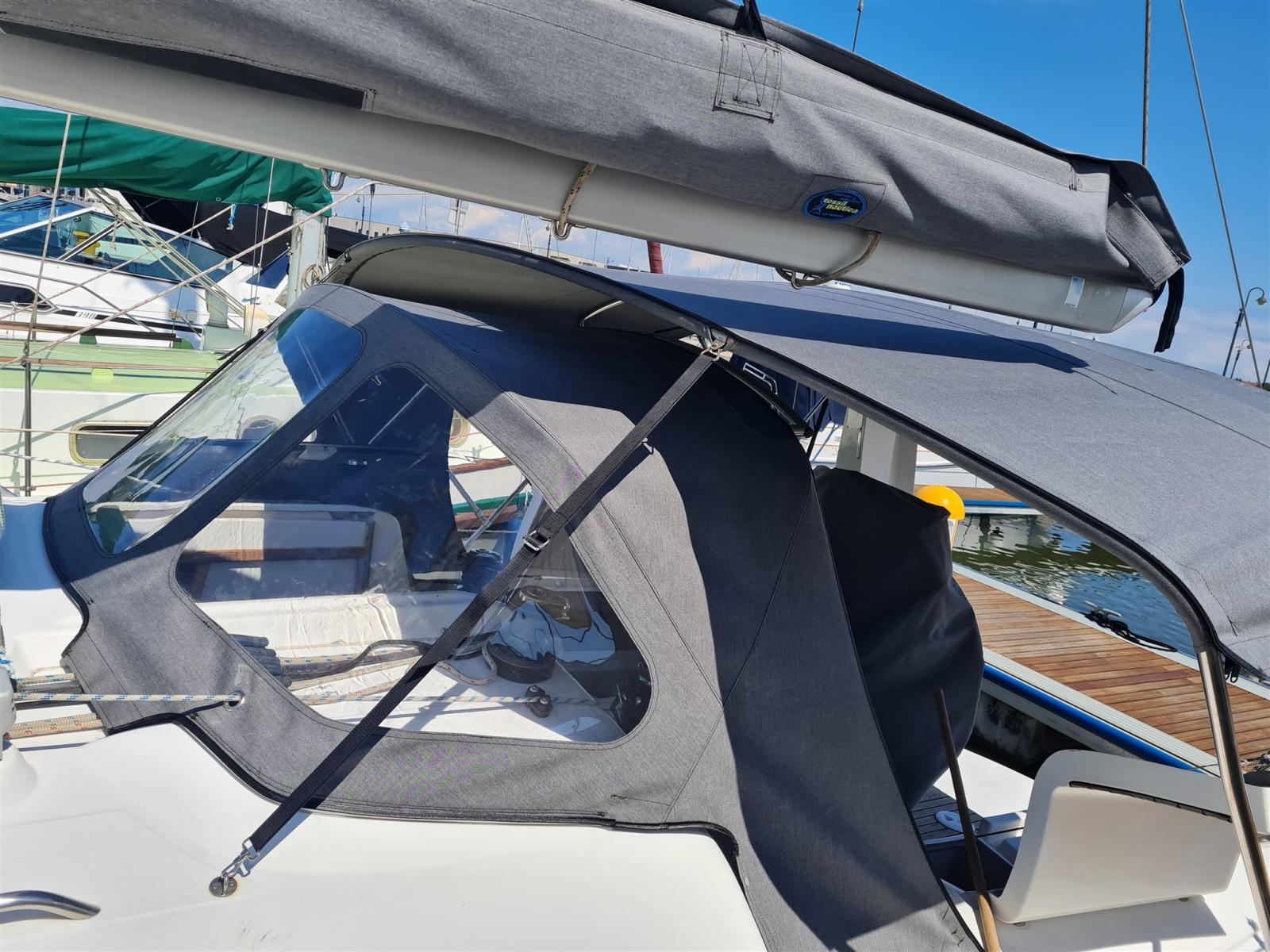 Batteries (2020), Propulseur d'étrave (2018), Pompe de cale manuelle, Cockpit en teck, Guindeau électrique, table de cockpit.
