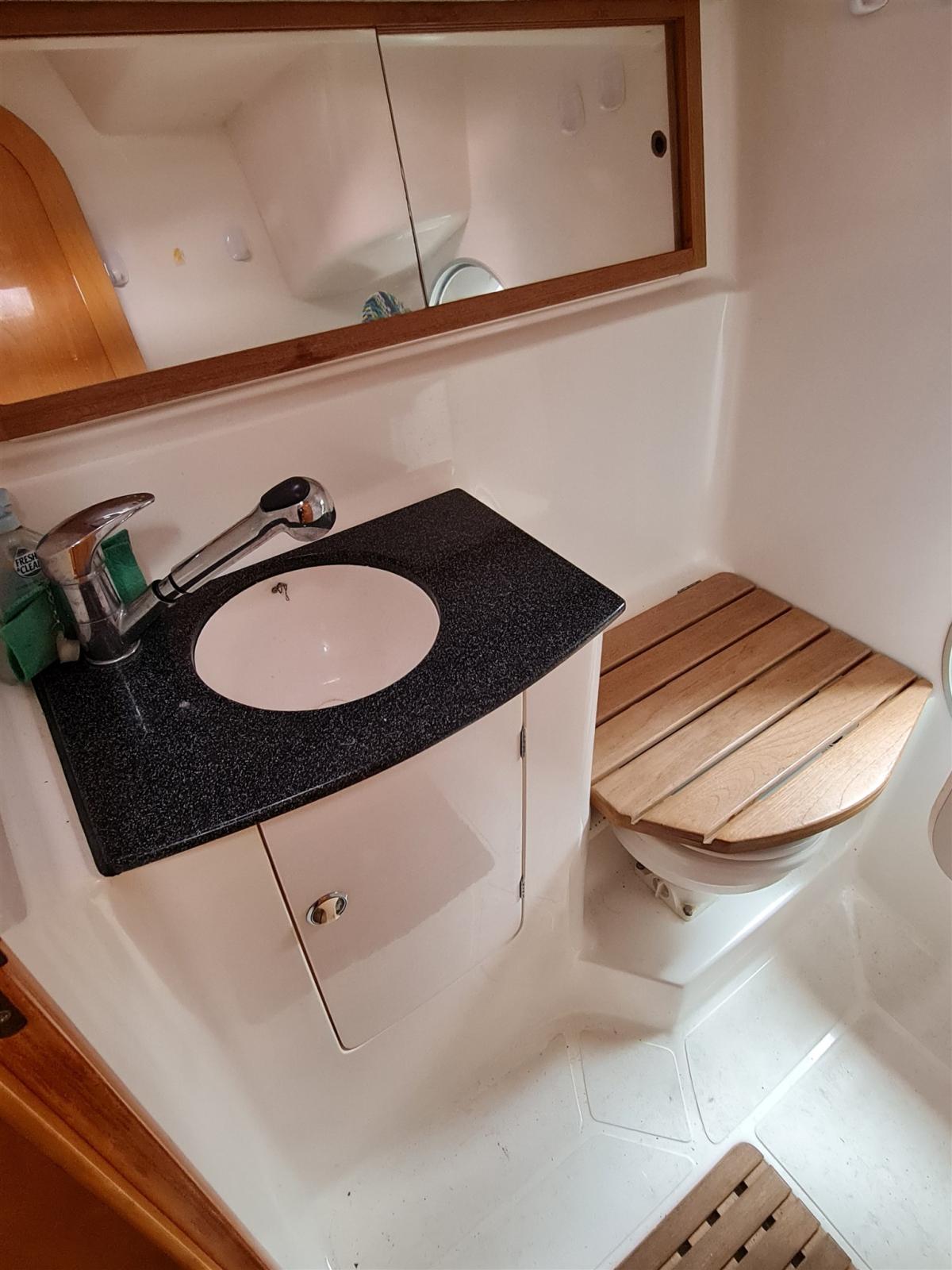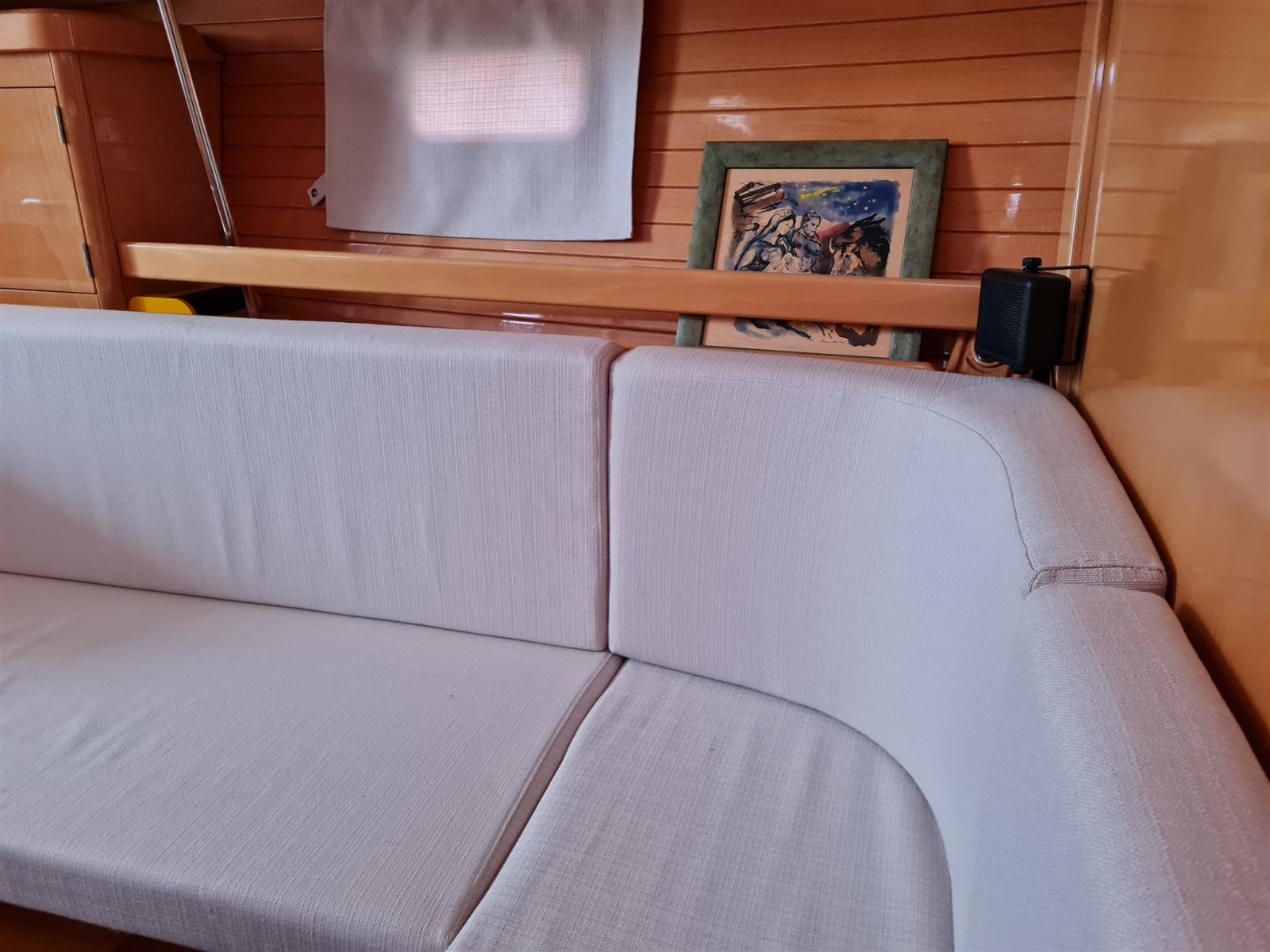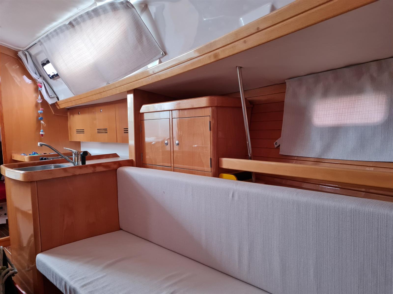 Batteries (2020), Propulseur d'étrave (2018), Pompe de cale manuelle, Cockpit en teck, Guindeau électrique, table de cockpit.