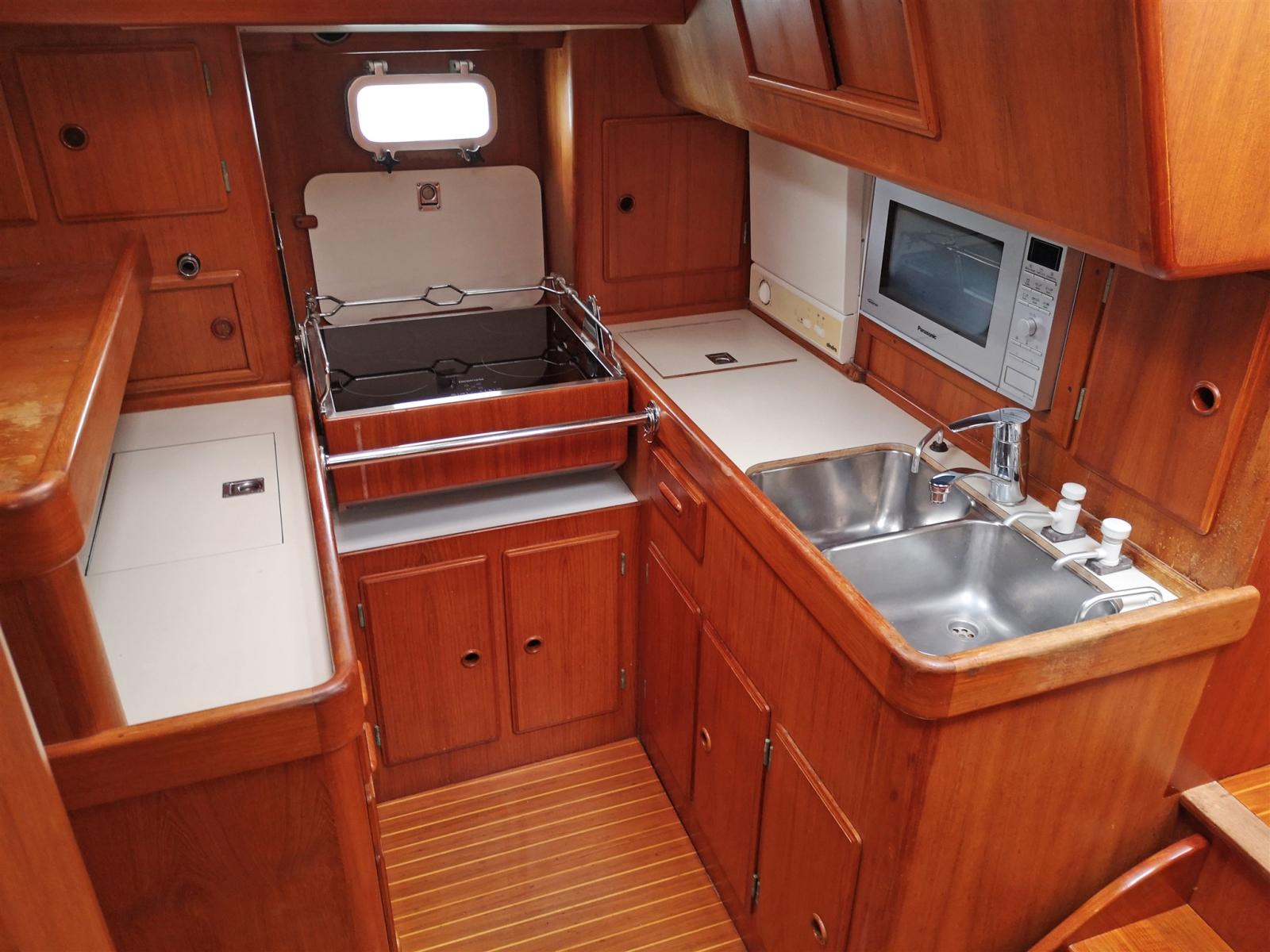 Cuisine en forme de C avec double évier avec pompe à eau, gel hydroalcoolique, plaque à induction à 4 brûleurs, four à micro-ondes, réfrigérateur cockpit, lave-vaisselle