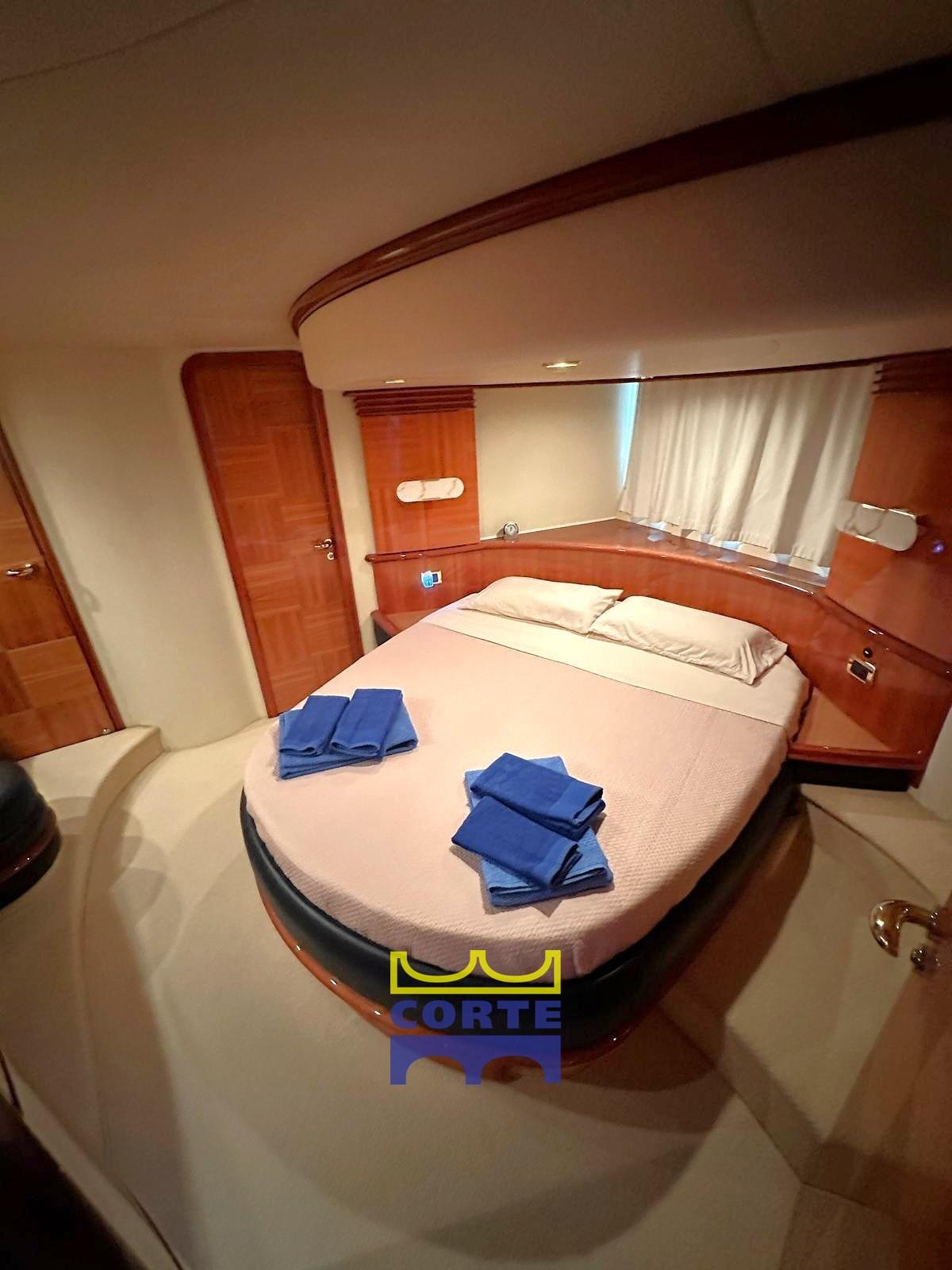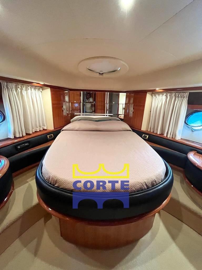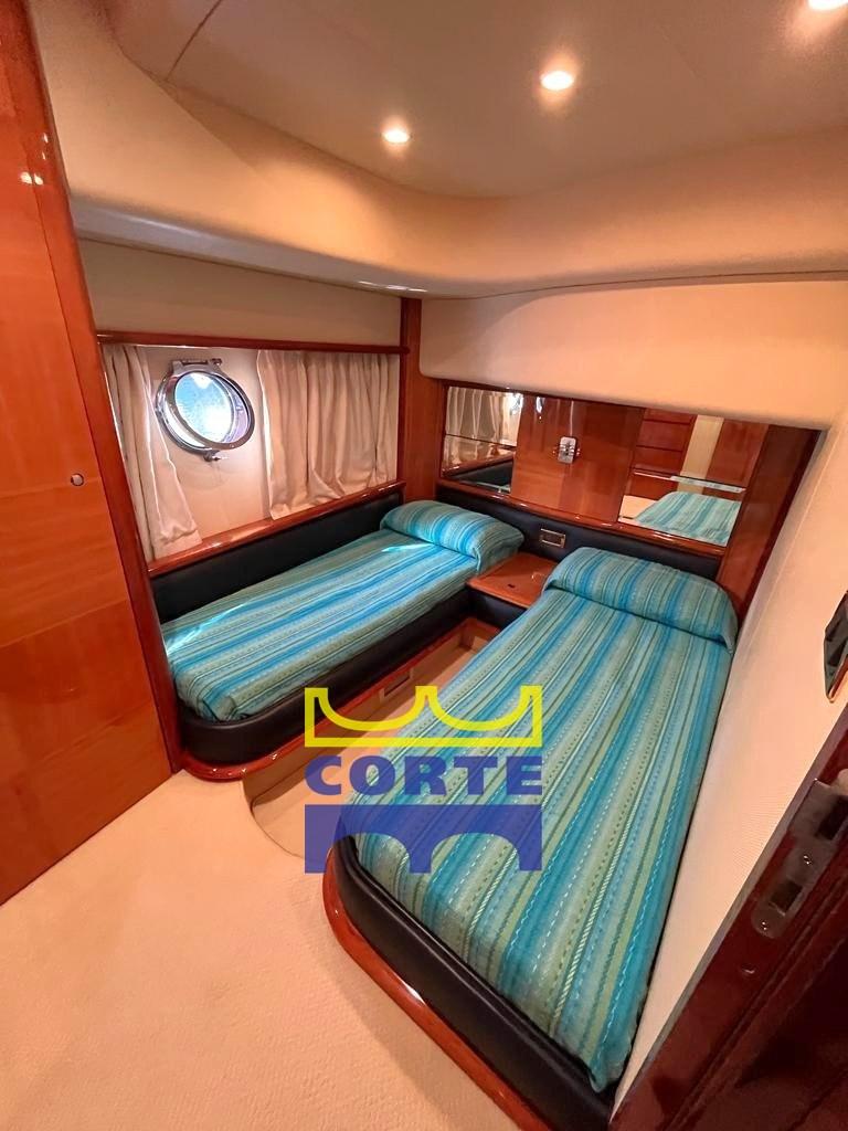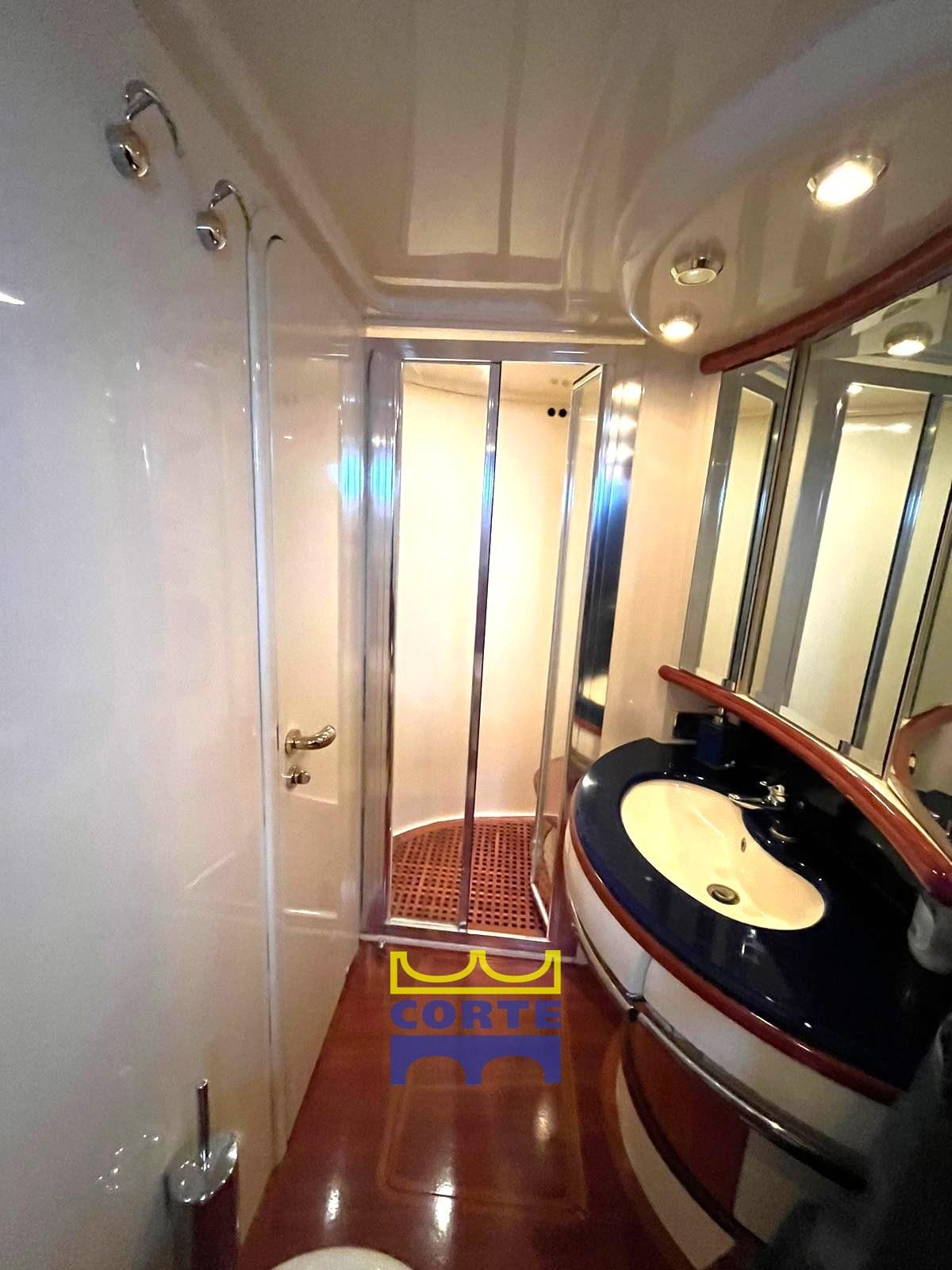 Alarme moteur, Alarme de pompe de cale, Eau sous pression, Douche de cockpit (pozzetto), Double barre à roue, Flaps hydrauliques, Grue de flybridge, Extincteur(s) fixe(s), Indicateurs de flaps, Lavage de chaine, Éclairage de courtoisie, Spots sous-marins, Passerelle (elettroidraulica a destra), Plateforme arrière (di poppa), Pompe de cale automatique, Porte latérale, Cockpit en teck, Prise de quai, Connexion eau sous pression à quai, Rollbar, Guindeau électrique, Echelle de bain, table de cockpit, Corne, 2 Winch électrique arrière, Winch électrique avant.