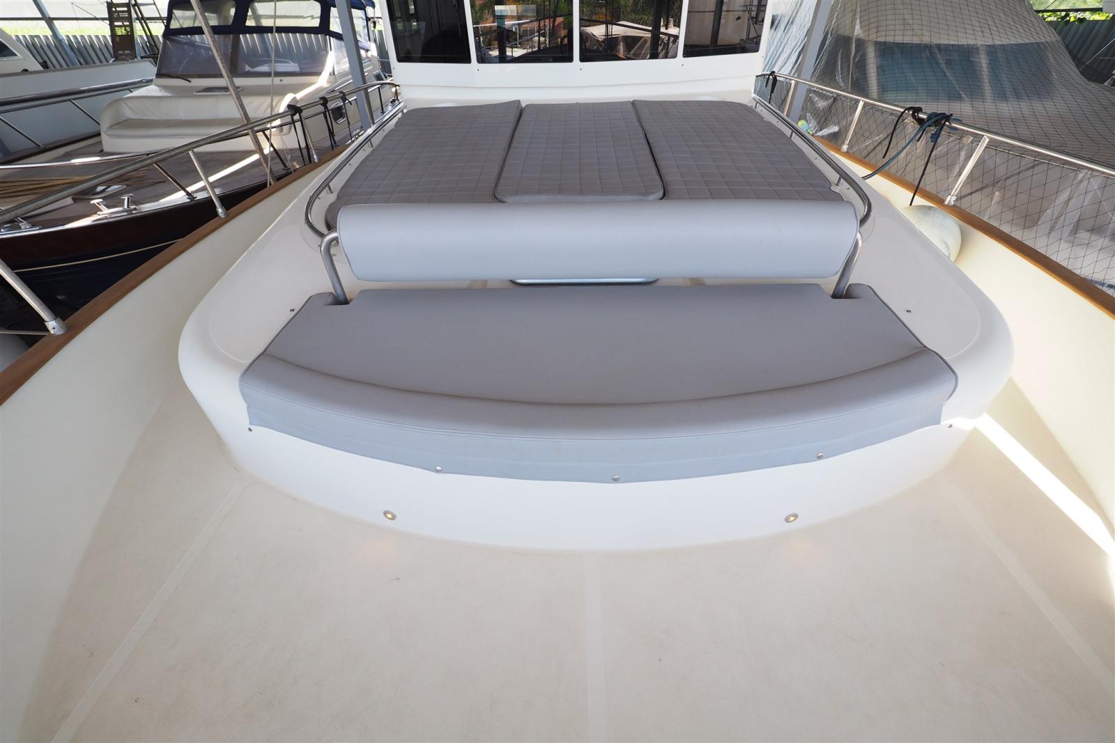 Le Maine 480 À l’extérieur se distingue par la largeur du flybridge et la proue meublée d’un grand solarium et d’un canapé donnant sur la mer.