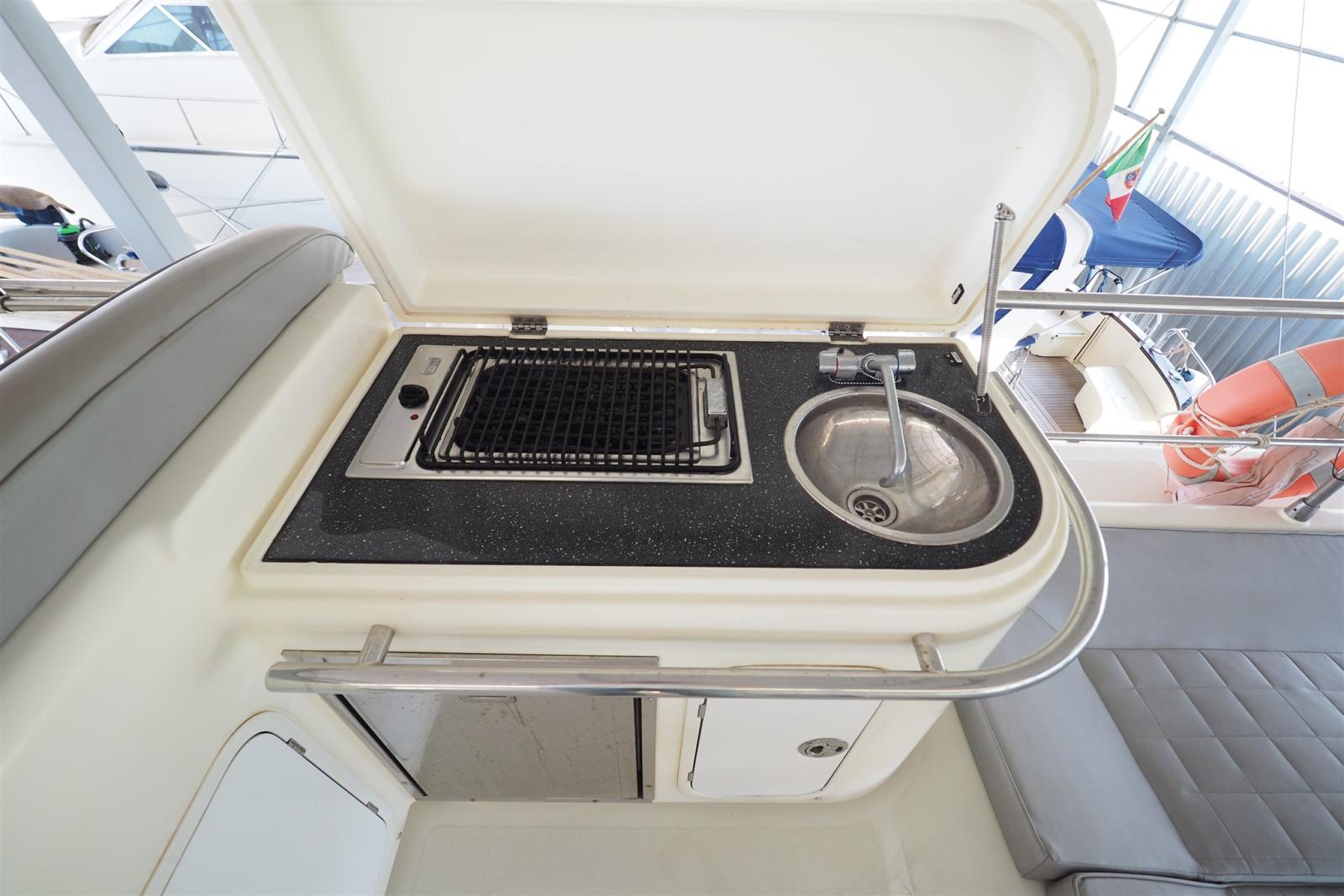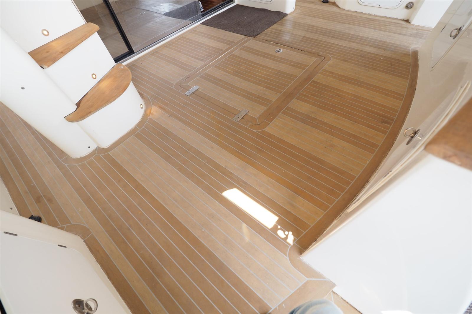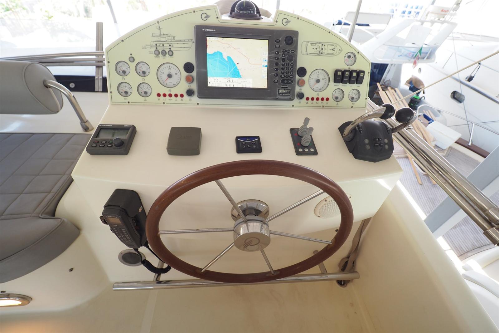 Passavant en teck (sintetico), Propulseur d'étrave (Side Power), Passerelle (idraulica), Plateforme arrière (di poppa in teak sintetico), Porte latérale (accesso postazione comandi), Cockpit en teck (sintetico), Prise de quai (doppia spina), Winch électrique arrière.